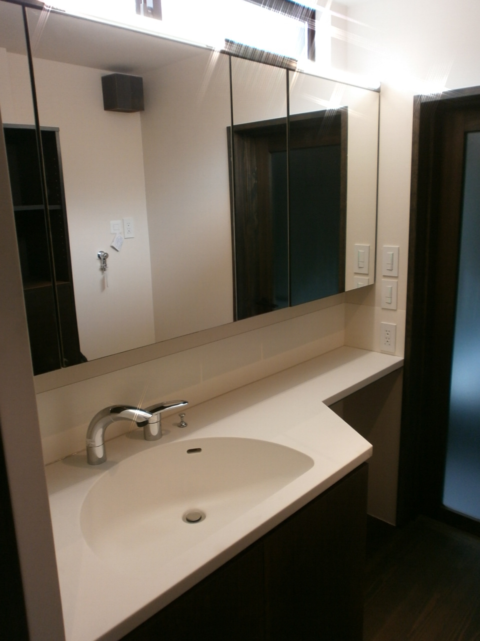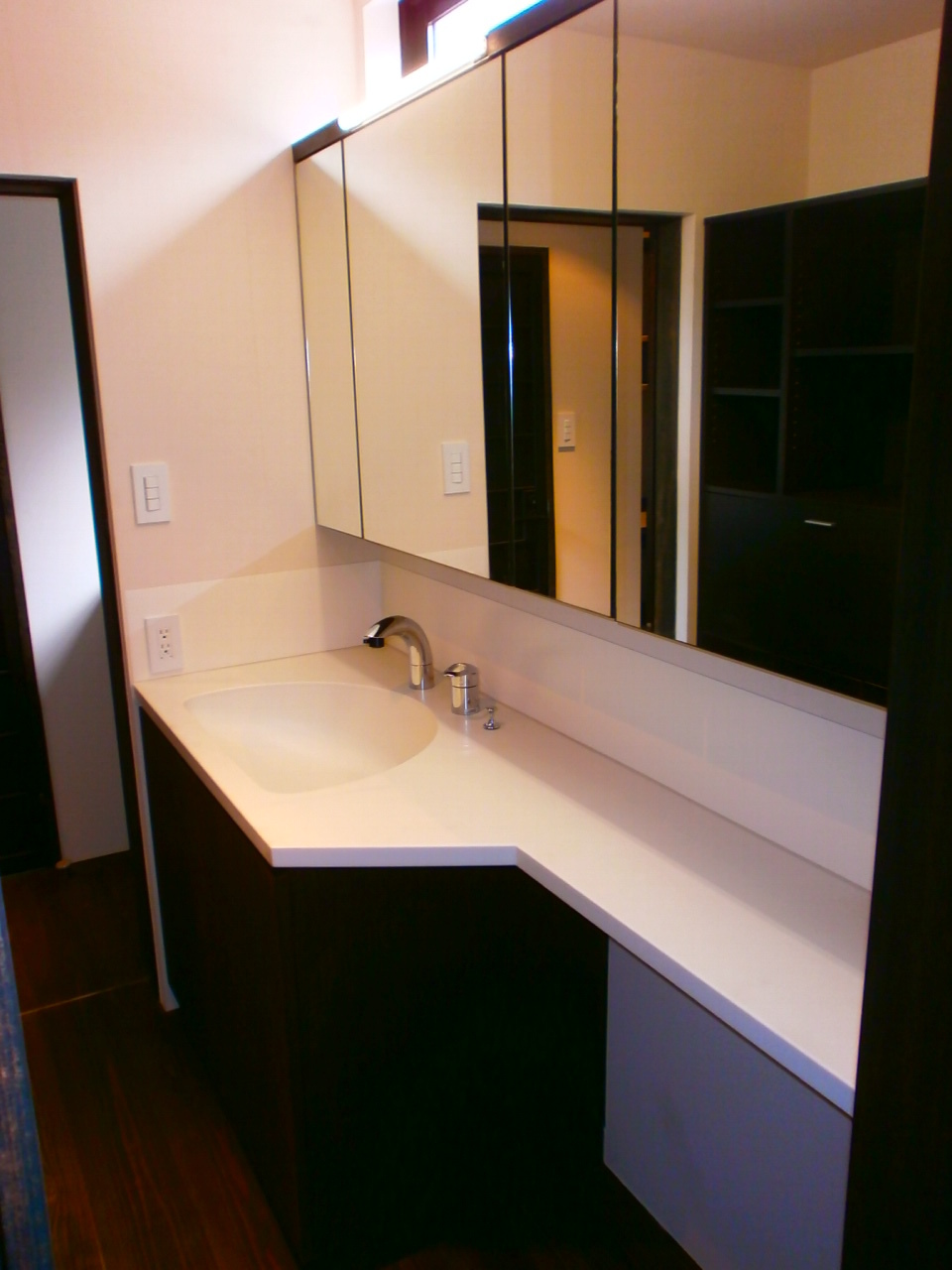 限られたスペースだけど収納もたっぷりほしい、洗面ボウルも広く、座ってメイクもできたらいいな。