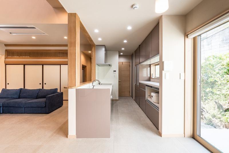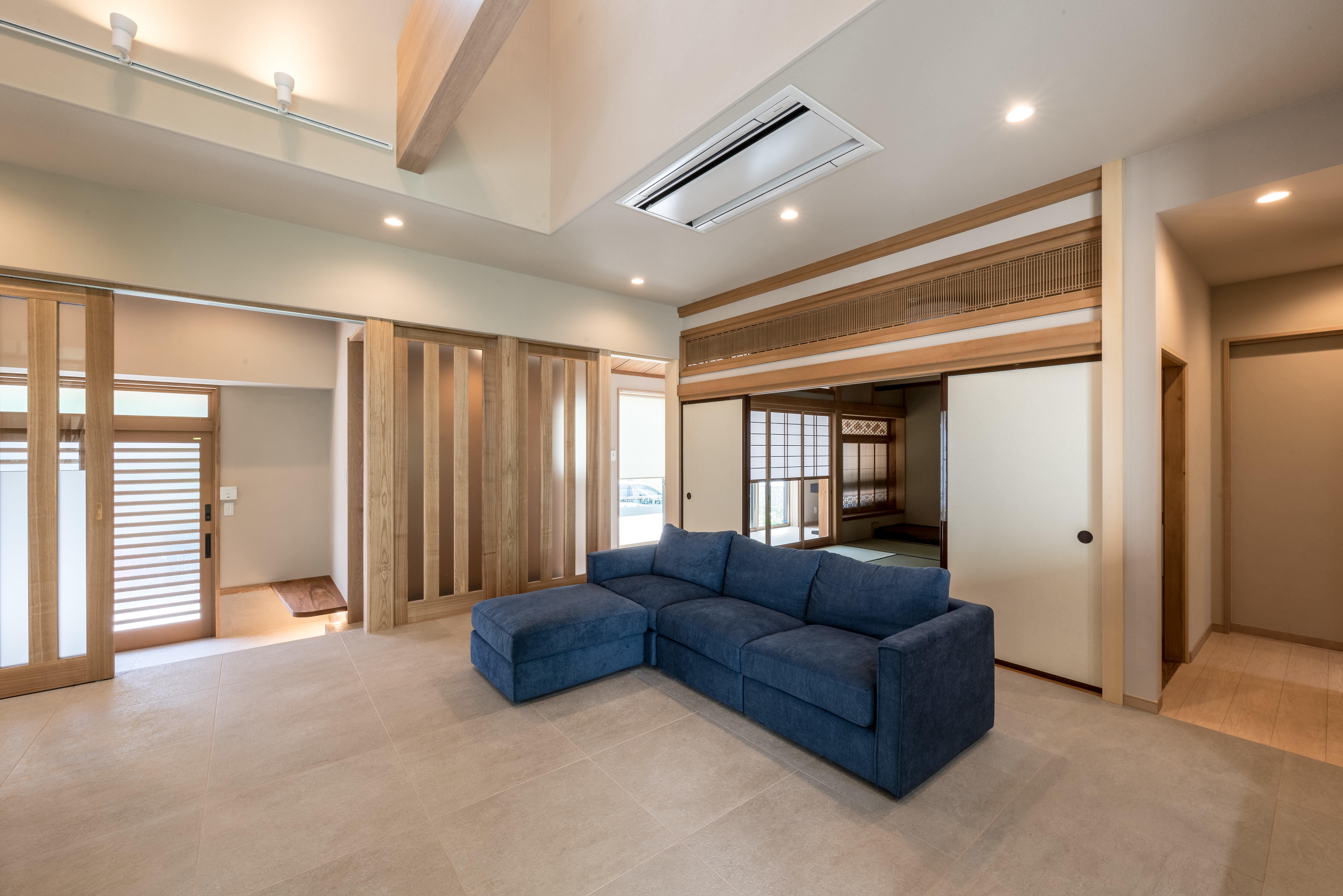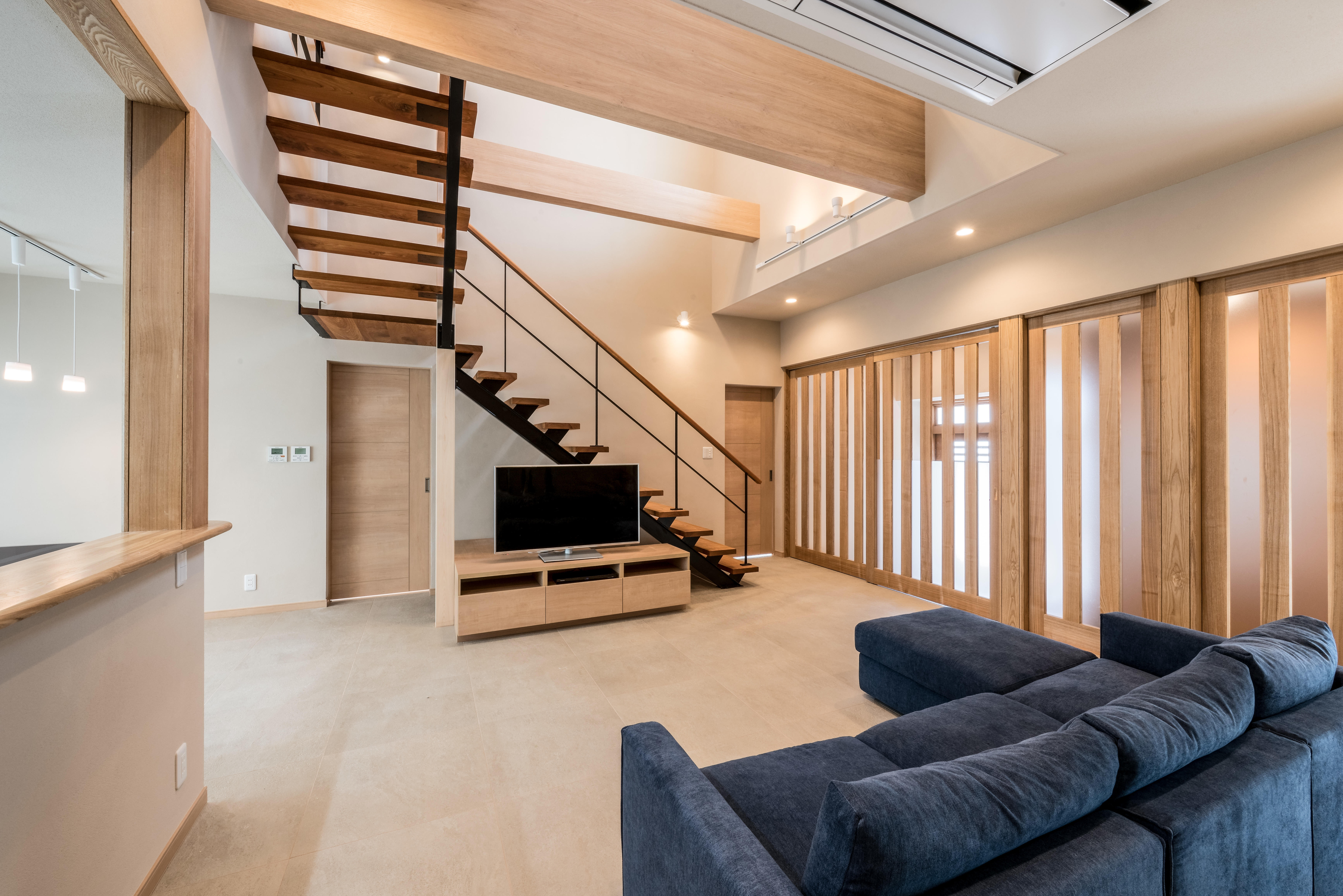 築25年木造2階建の和風建築をフルリフォームしました。リビング階段にし 風通しい良い空間に ペットと一緒に共生する住宅に 床は床暖房設置 ペット用タイルを使用しました。 和室1室は既存のまま残し 和室とつながるリビングは和モダンなインテリアにしました。