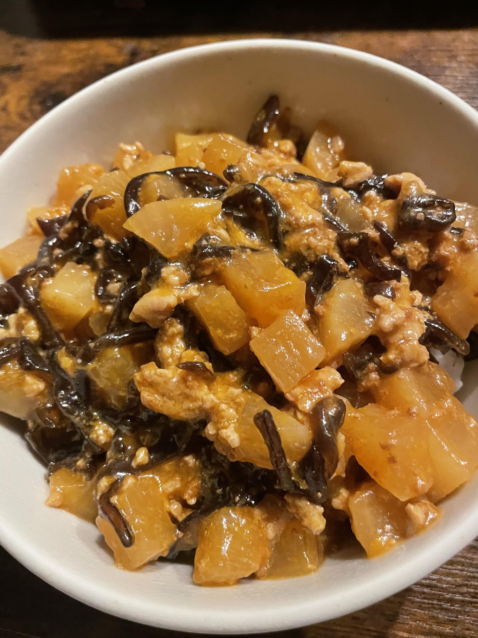 もう虜ですね♡今回は木耳ラー油を大量投入し大根麻婆を作りました♡