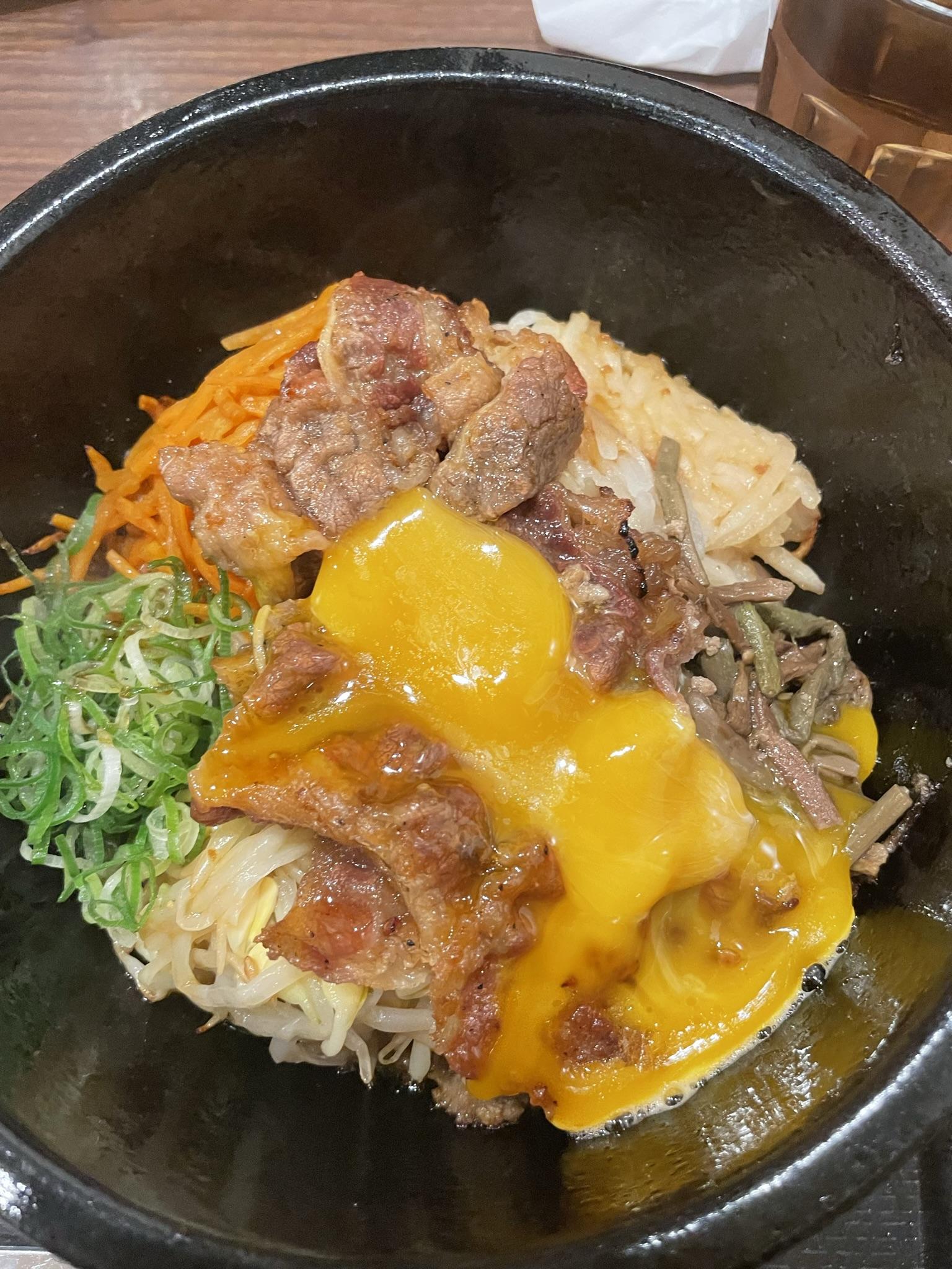 私は大好きな石焼ビビンバを!旦那は大盛りのカルビ丼をおちびちゃんはキッズメニューがあったのでそれを注文しベルをもらい空いている席に座りました。