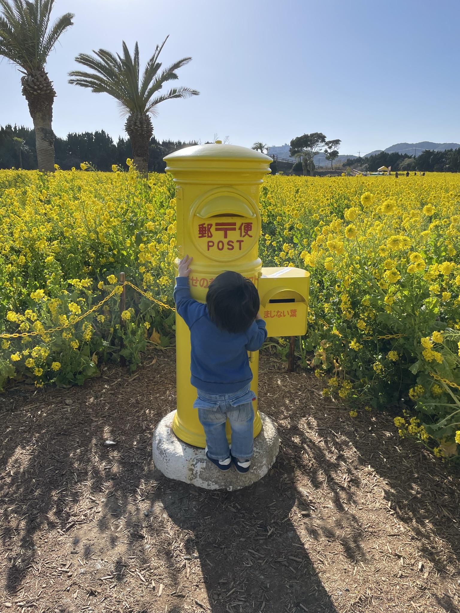 菜の花に囲まれて幸せの黄色いポスト(投函はできません)があったり、ブランコやソリ滑りなどもあります。