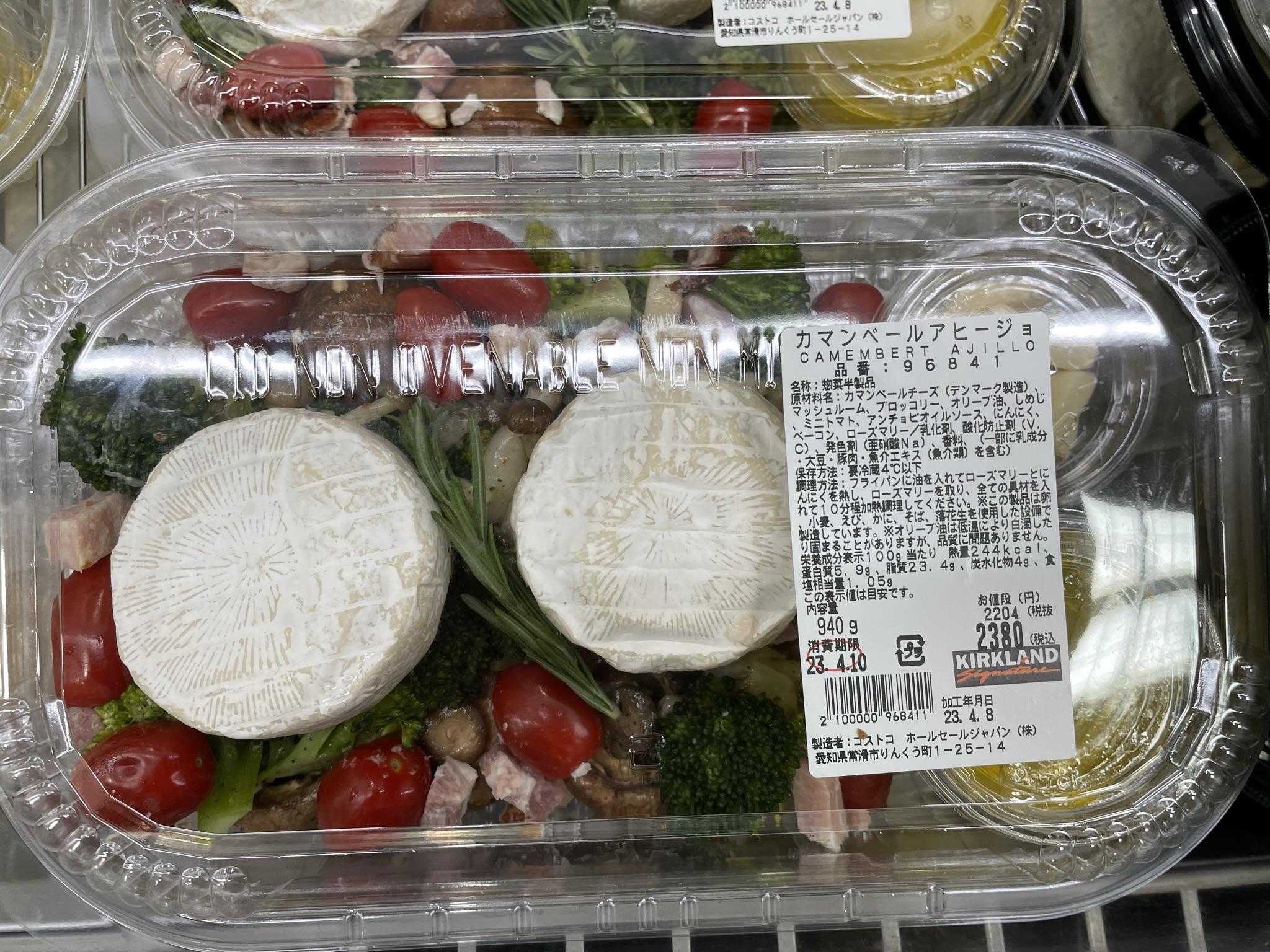 大きなカマンベールが2つ入っており、他にもマッシュルーム・ブロッコリー・ミニトマト・ベーコンが入っています。色合いが良いのはもちろんのこと、ニンニクやオリーブオイルなどアヒージョに必要なものは全て揃っています♪