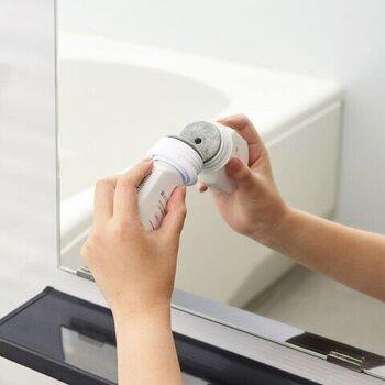 浴室の鏡に塗るだけで、くもりを防いでくれるCシリーズの鏡のくもり止め。使い方は乾いた鏡に塗布し、液が乾いたらシャワーで流すだけ。持続効果は入浴30回分で、しっかり長持ちしてくれます。