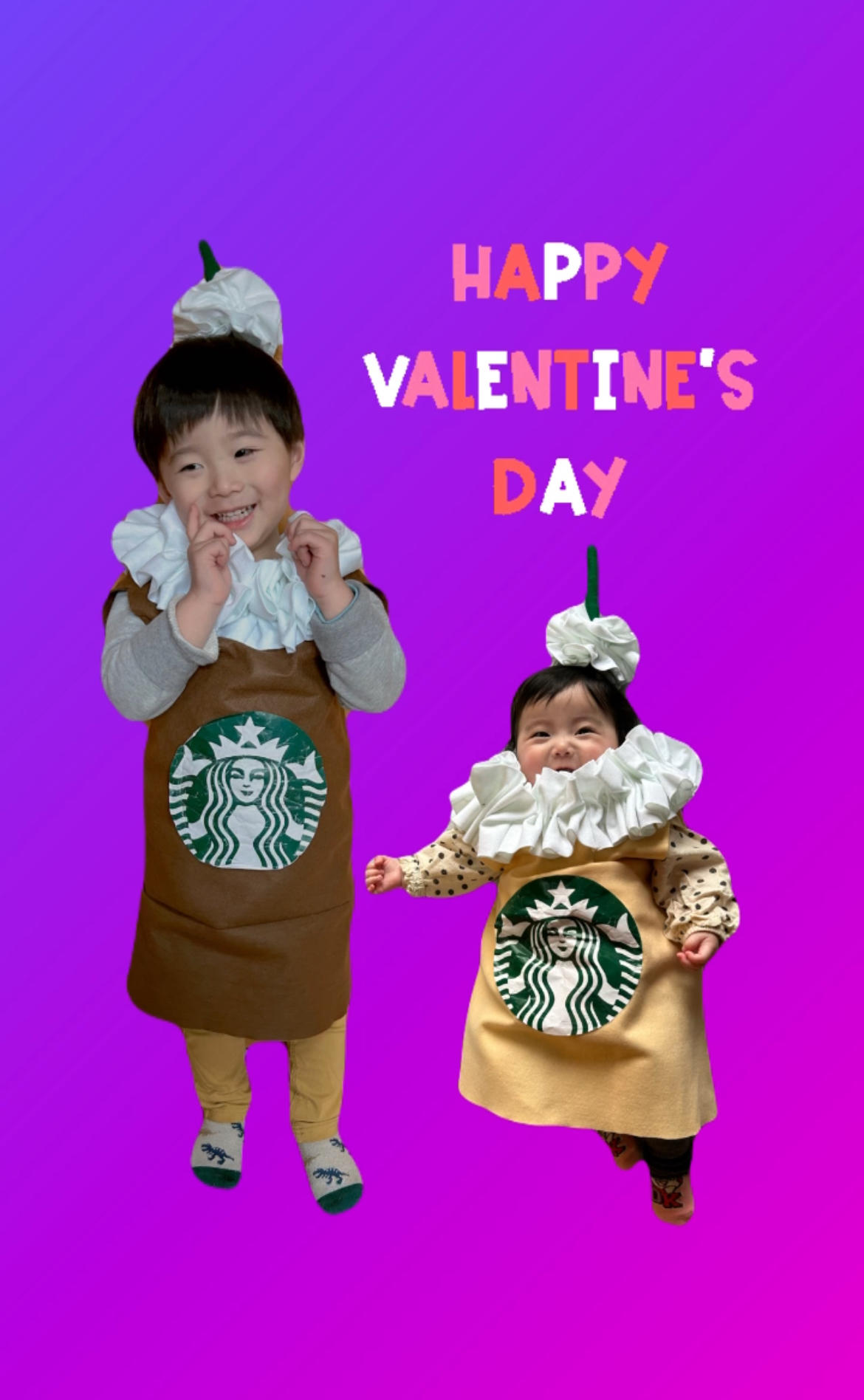 それと先月下の子がハーフバスデーの時に、キューピーハーフの衣装を作って記念撮影をしましたが、後から上の子が僕も着たいから作ってと言っていたので今回バレンタイン用にフラペチーノの衣装を作って兄妹で着せてみました♪