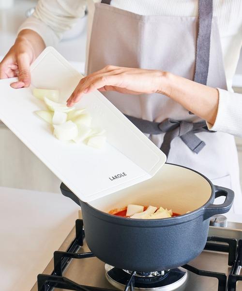 「LAKOLE」のコンパクトなまな板は、便利な折れ目付き。カットした食材をフライパンやお鍋に移すという動作も、簡単にできます。