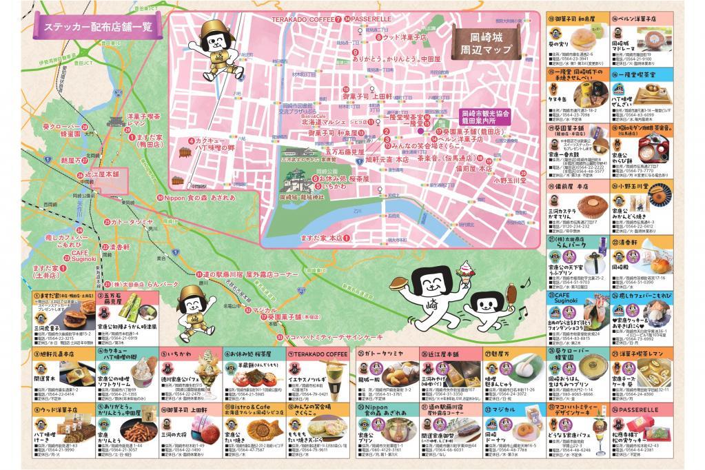 岡崎市内の家康公スイーツのお店をめぐって、家康公スイーツを購入すると、オカザえもんステッカーをゲットできます。