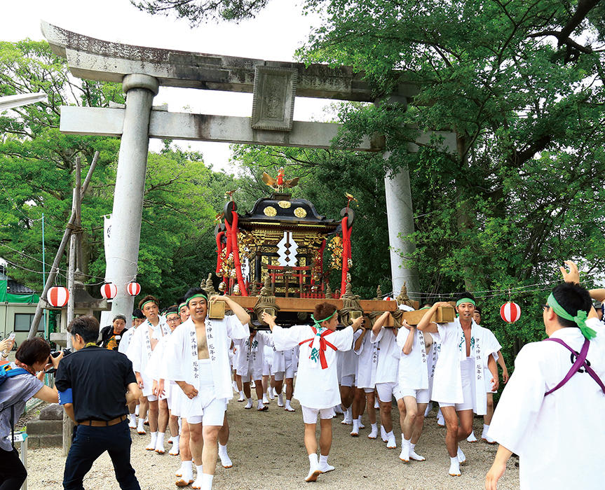 西尾祇園祭の起こりは、疫病除けの神様のスサノオノミコトを祀る伊文神社の祭礼神事です。古くは女装し牛にまたがった神職が、御幣を立てた神馬を先導し、その後ろを囃し立てる行列とともに町中を巡り、疫病や災厄を追いはらったといわれています。