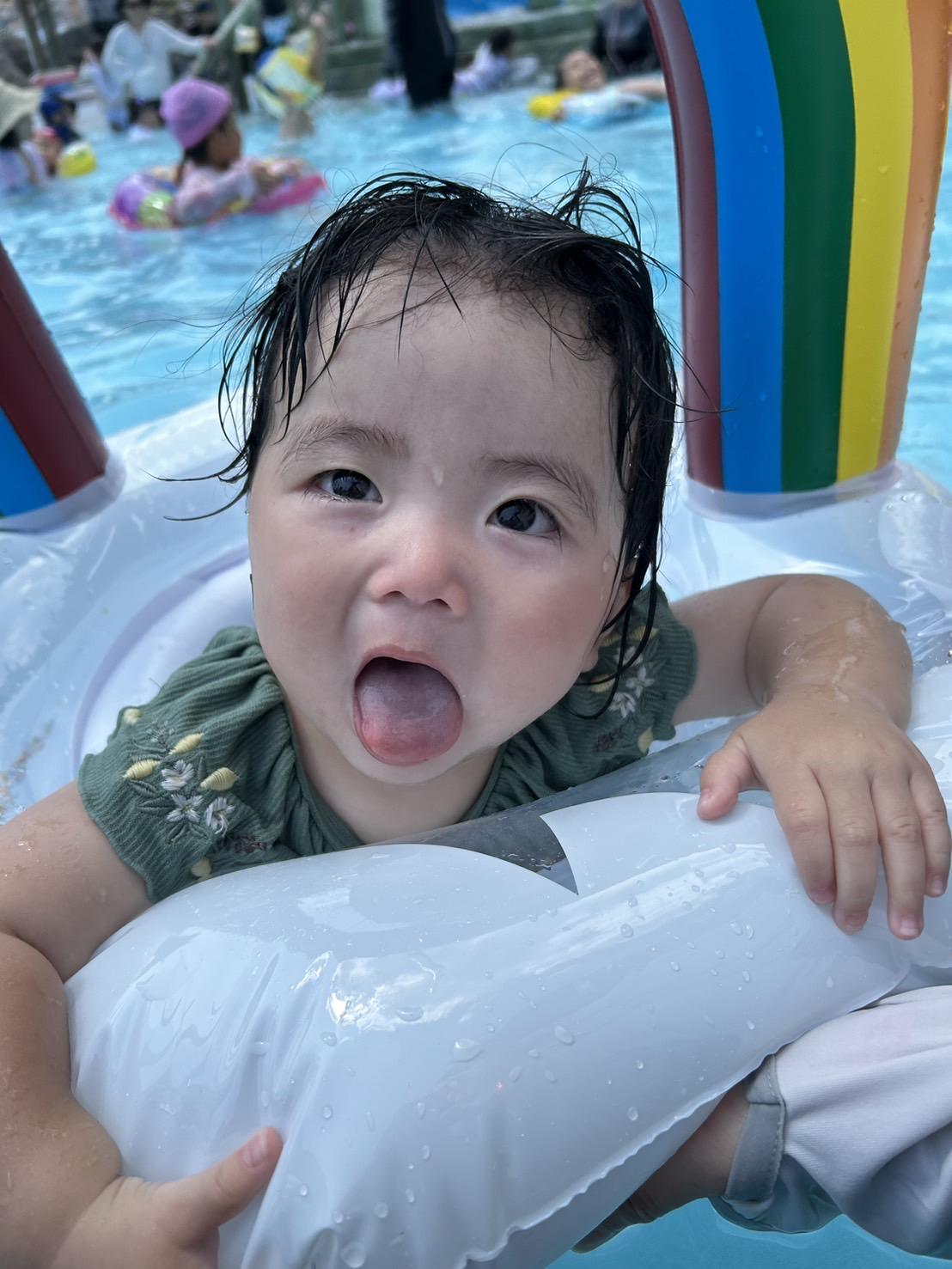 下の子は、水遊びはしたことがありますが、プールは初めてだったので、最初は泣くかな?と思ったのですが、暑いせいかプールの水温もぬるくてお風呂は大好きだったのもあり楽しそうにしていました(^o^)丿