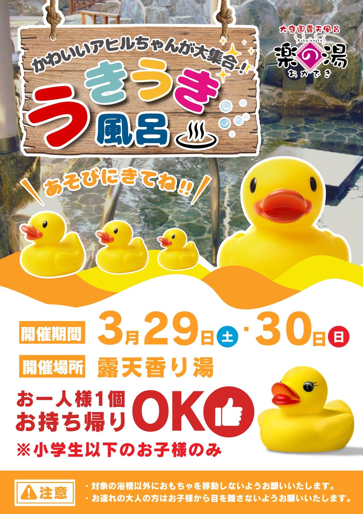 以前楽の湯のイベントでレーシングカーの湯というのがあり行ったことがあります。今回はお風呂の中にアヒルさんがいっぱいになるイベントがあるようです(笑)