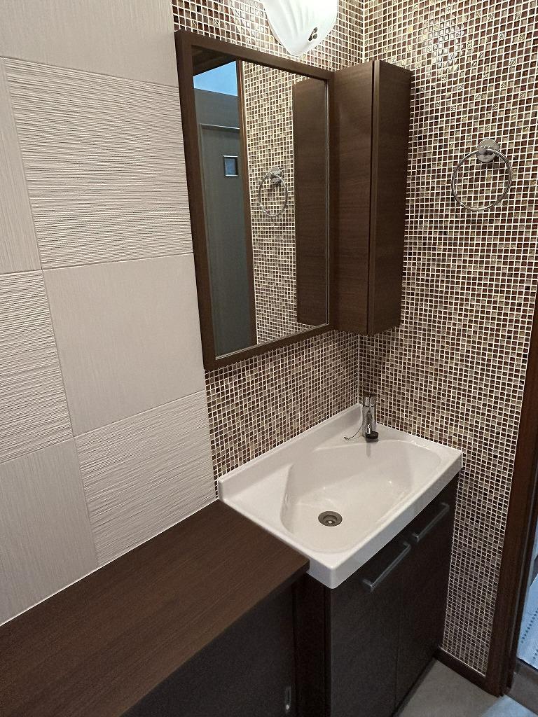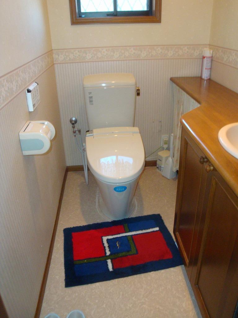 便器:サティスG 床:タイル 壁:エコカラット 手洗い:リフラ