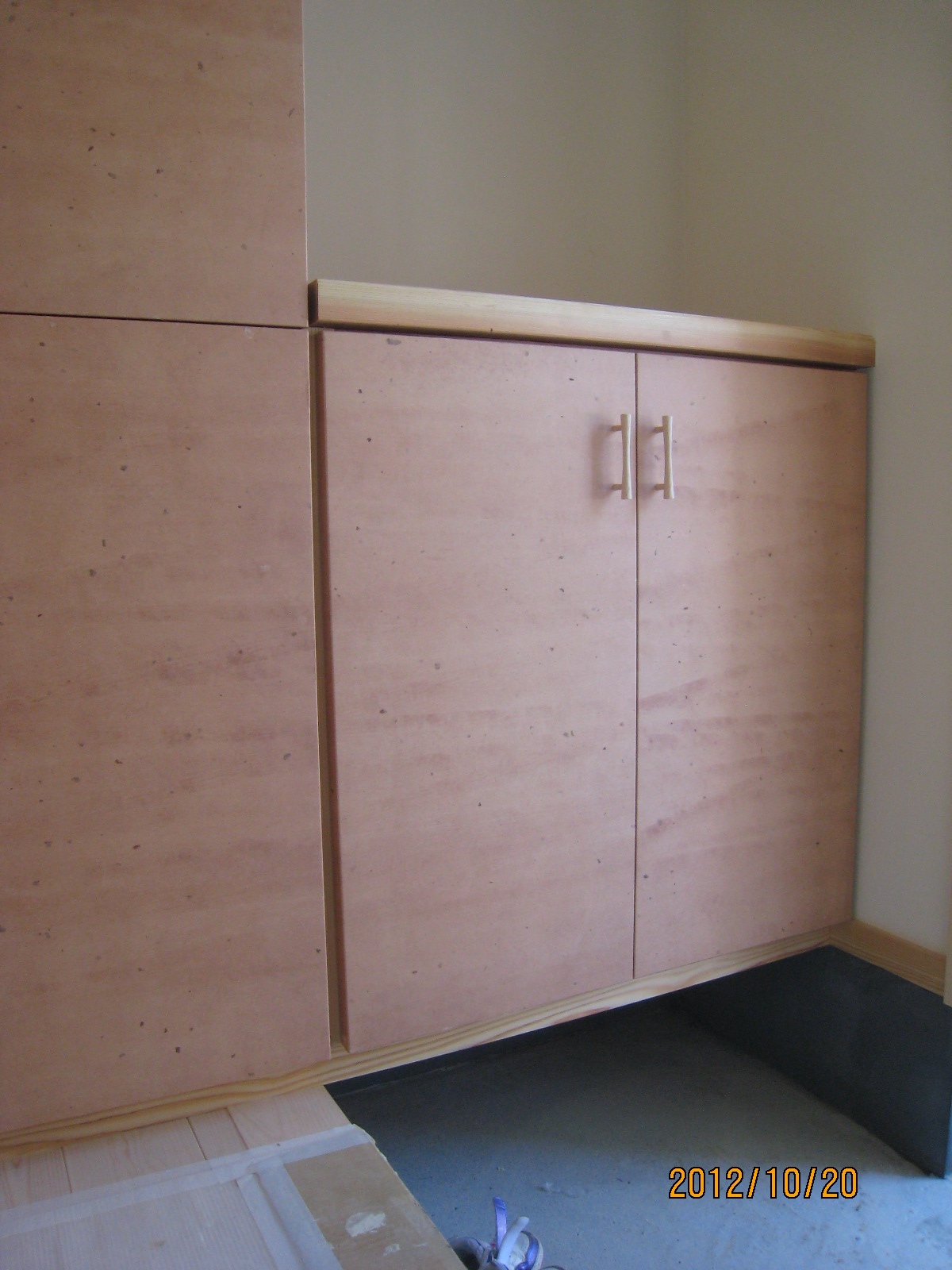 ⇑ 造り付けの家具やマガジンラック。 ⇑ 柿渋の和紙が貼られた玄関収納