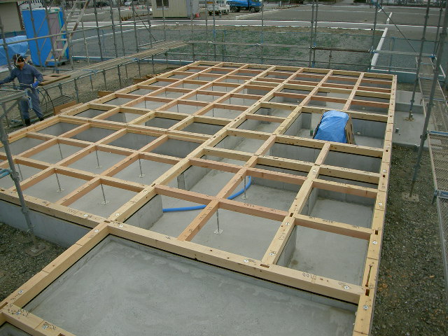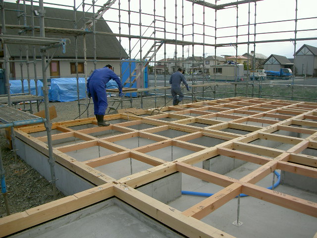 明日は、断熱材の敷き込み、床パネルの張りに入り上棟の段取りです。