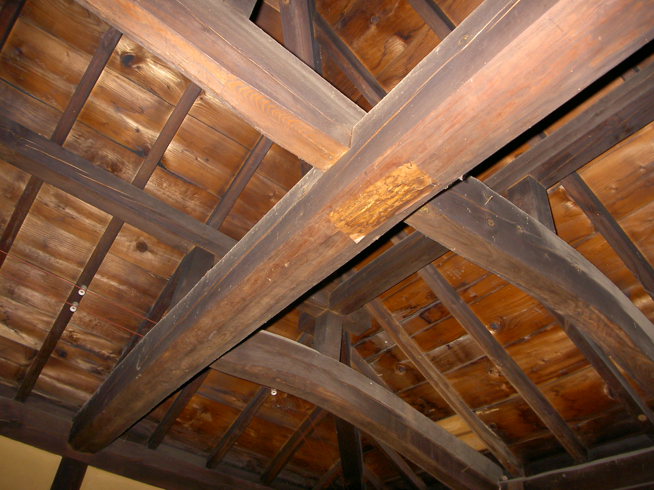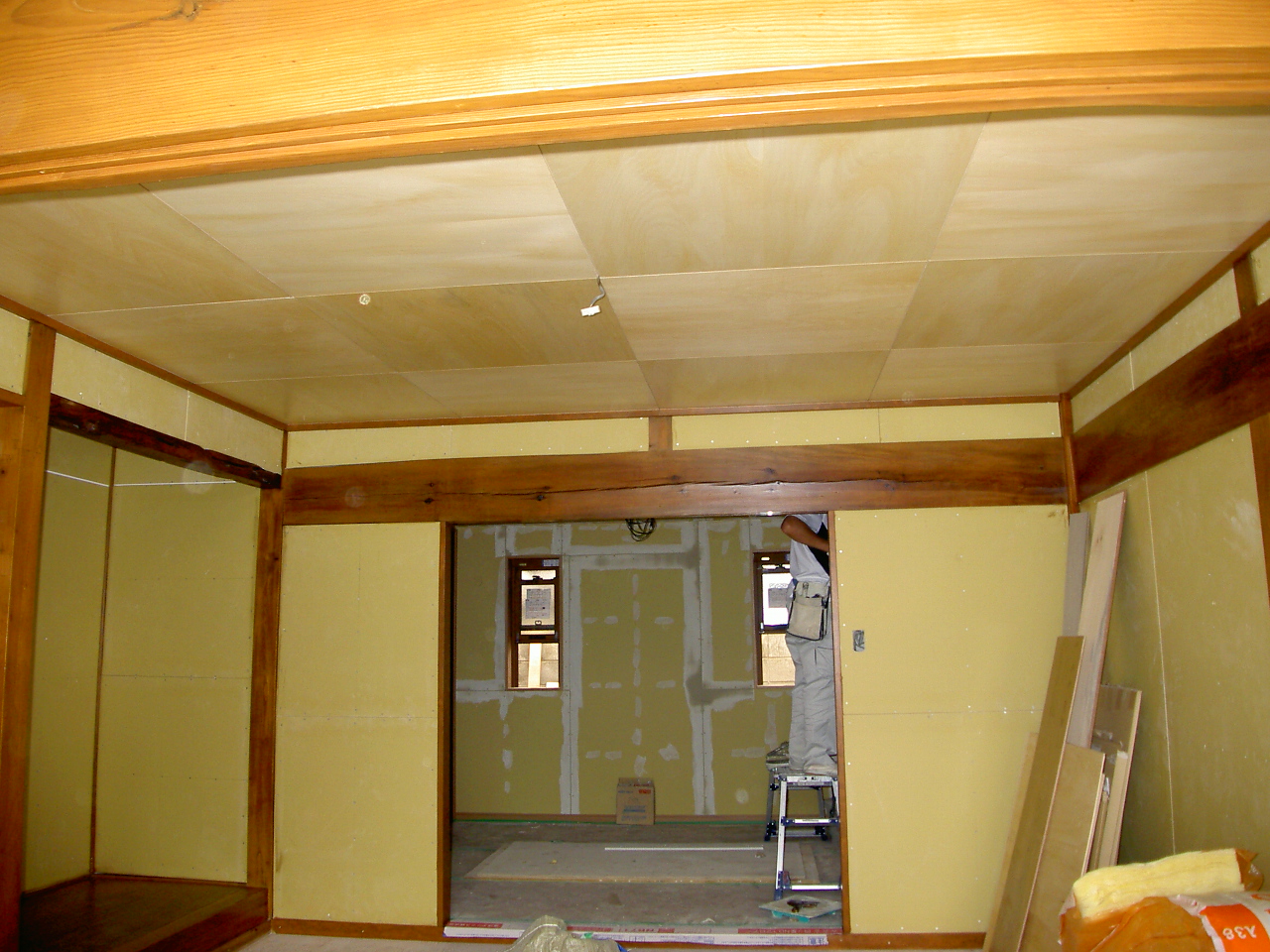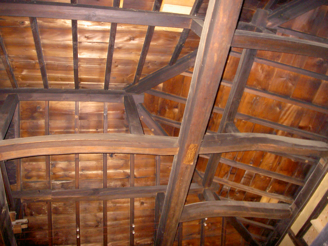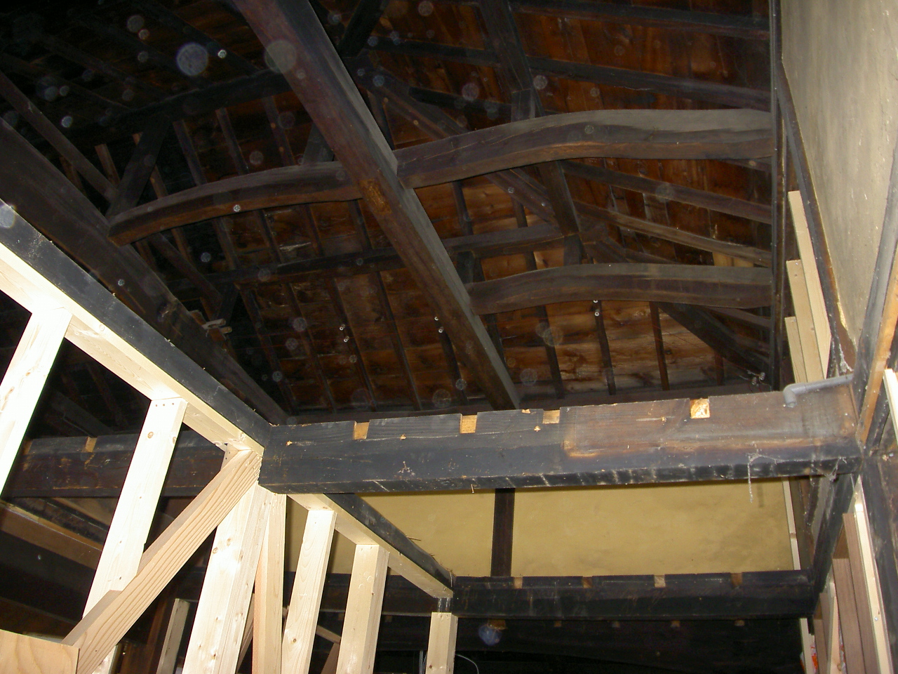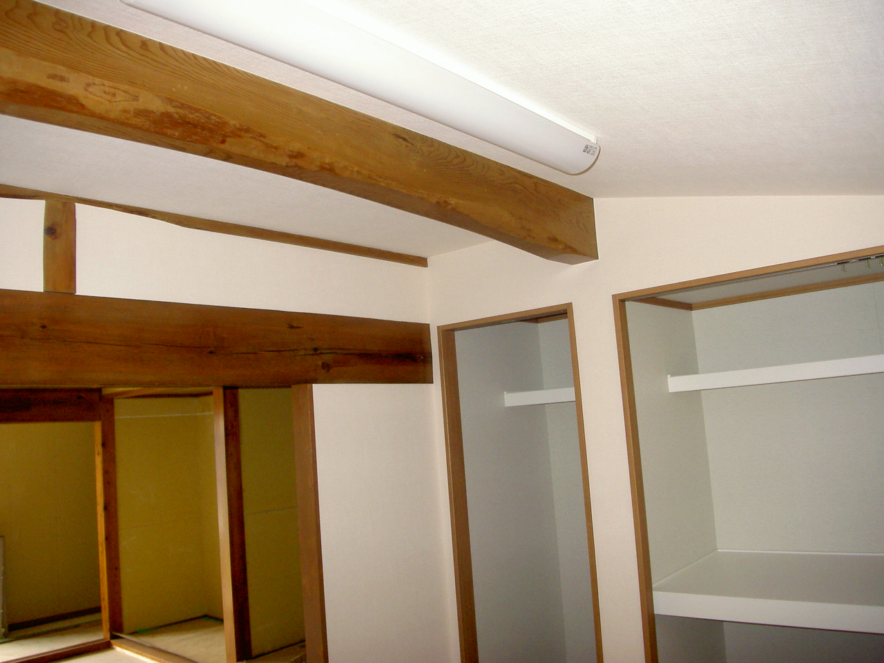下の写真は、玄関の上の小屋組みです。古民家ならではの梁の組み方には、大工さんも私も見とれてしまいました。(^_^.)