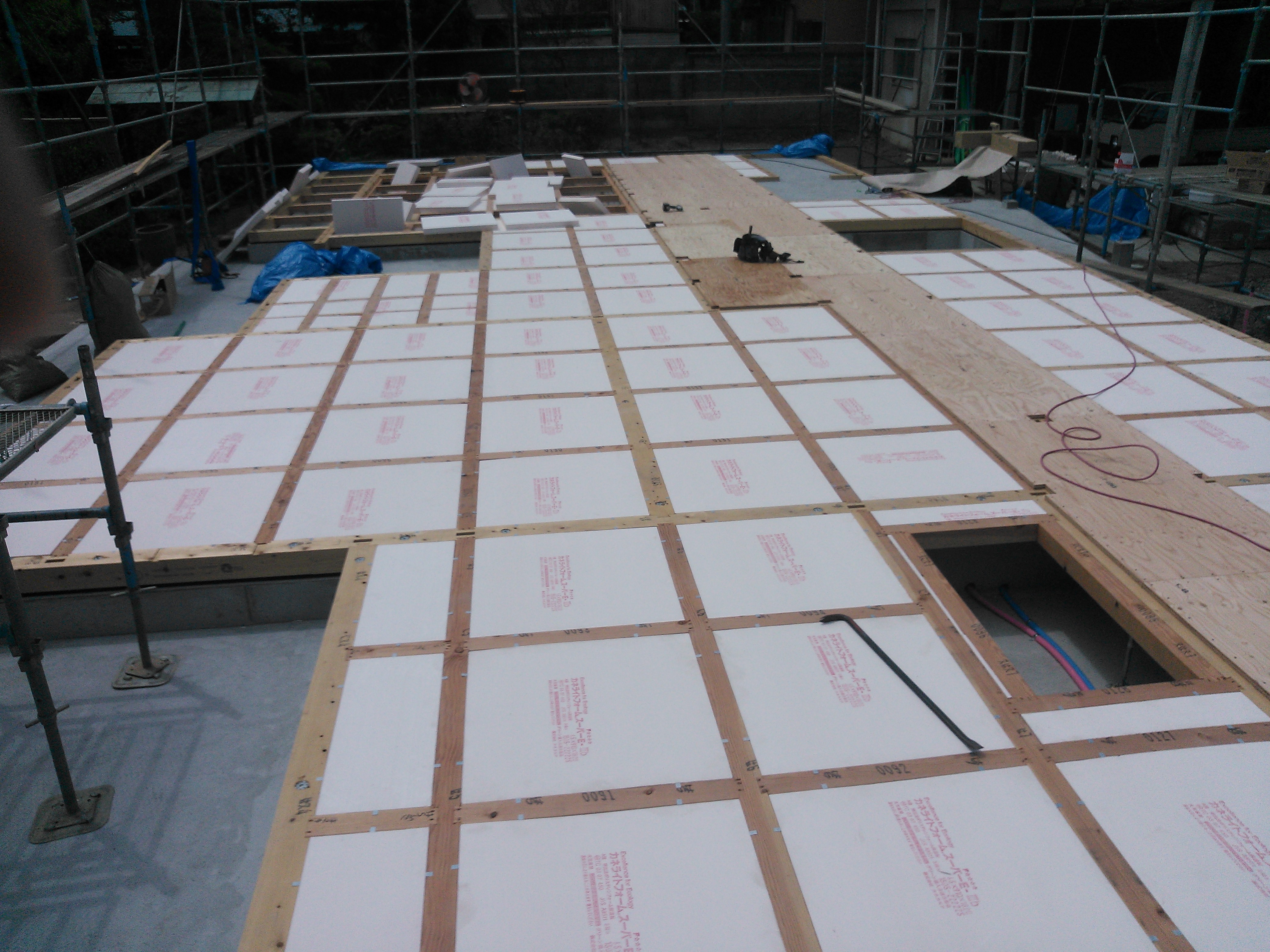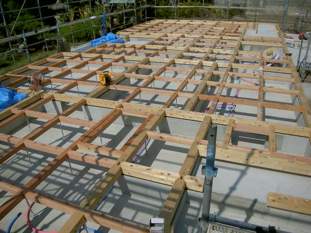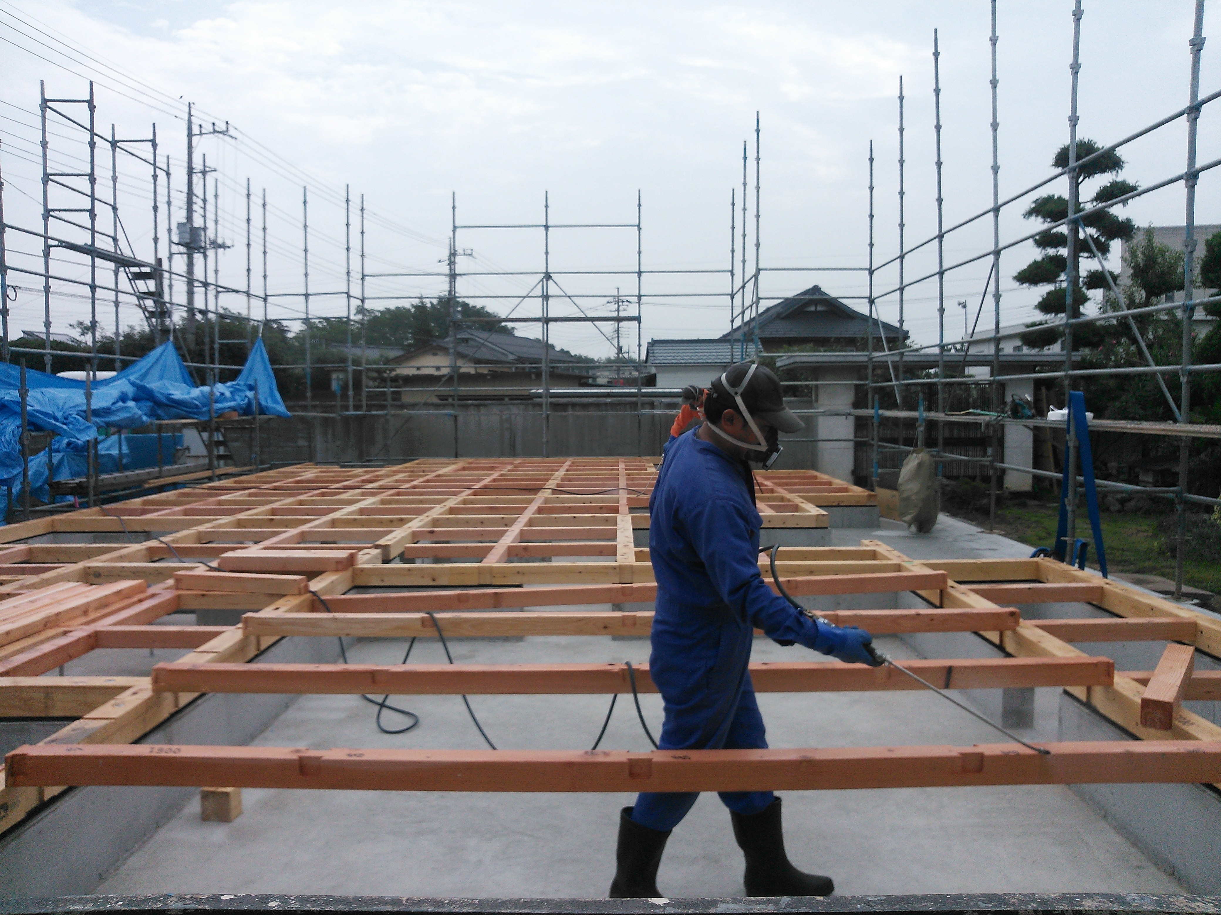 基礎工事から木工事に移り土台敷き、防虫処理、断熱材敷き込みと
