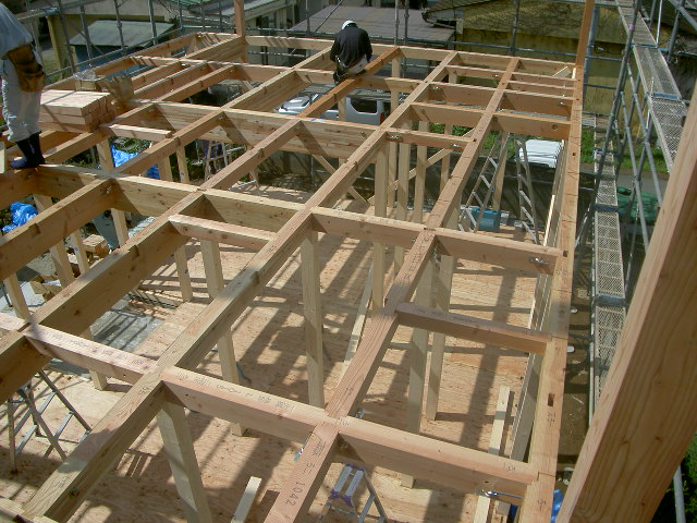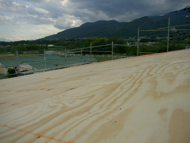 午後からは小屋組~屋根の野地合板張り~雨仕舞いのルーフィング張り