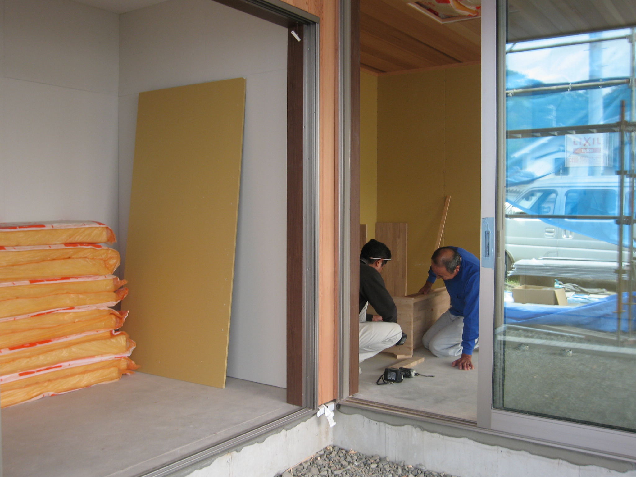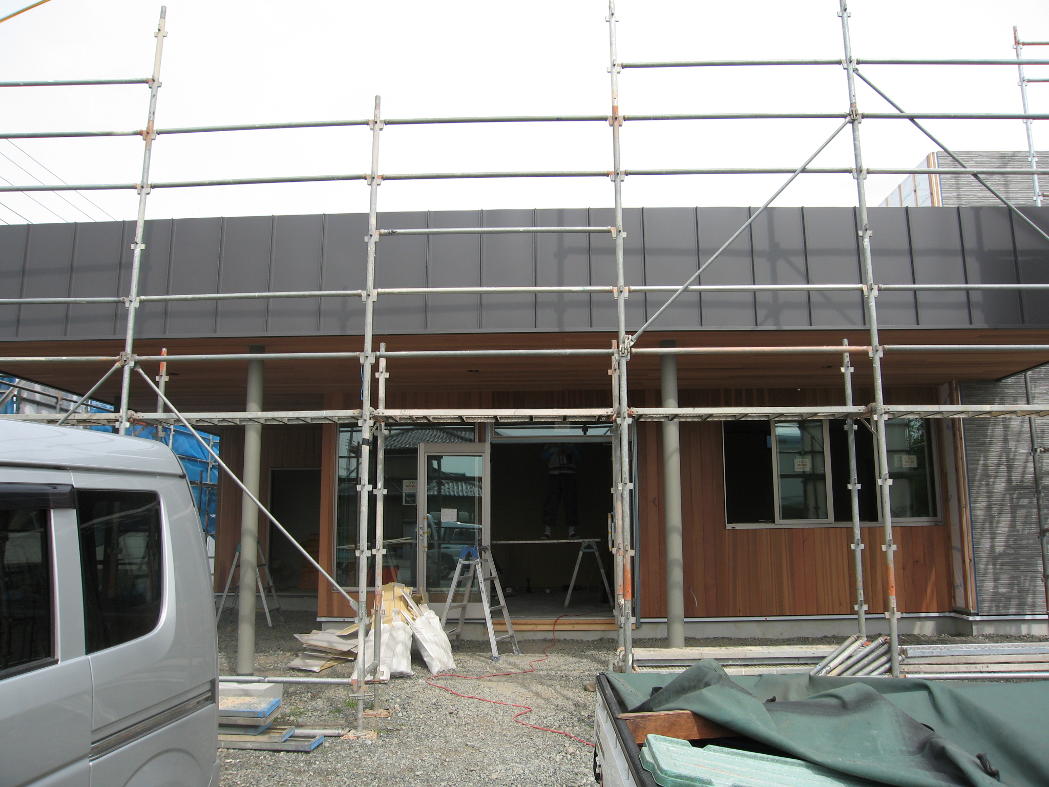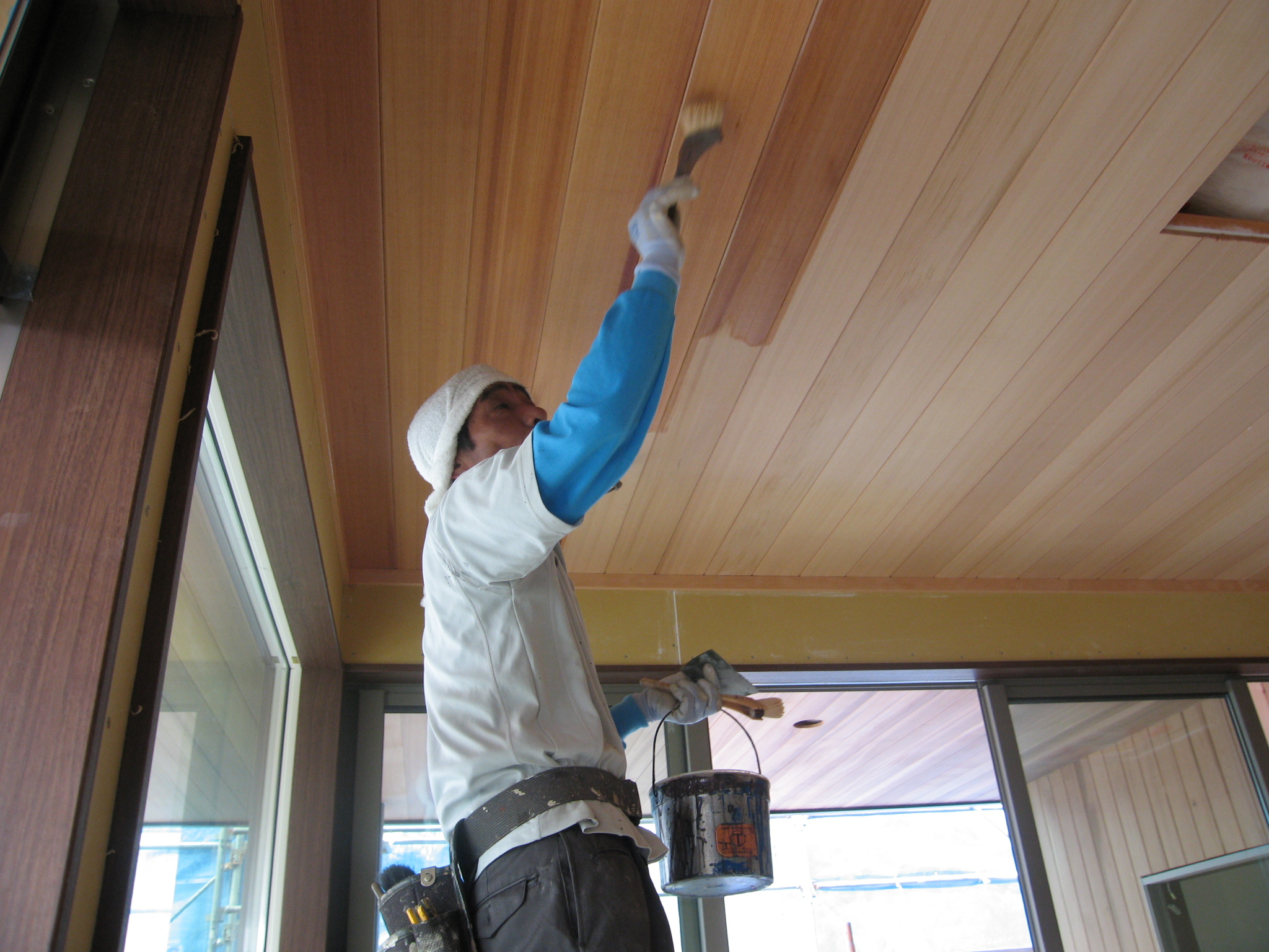 この日は外壁、室内天井の塗装、造作棚取り付け工事が進行中!