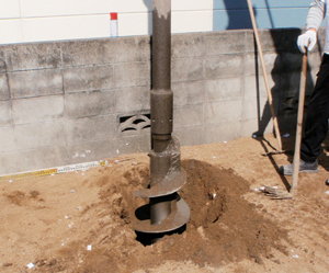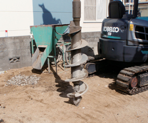 2.掘削 HySPEEDドリルを回転させ、予定の深度まで地面を掘削します。この際事前の地盤調査データと実際の土質に違いがないか確認します。 |