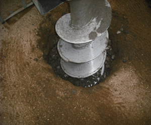 4.パイル形成 HySPEEDドリルを掘削の時とは逆に回転させ、天然砕石に圧力をかけながら砕石パイルを形成します。50cm単位で強度を確認しながら1本づつ正確に施工します。 |