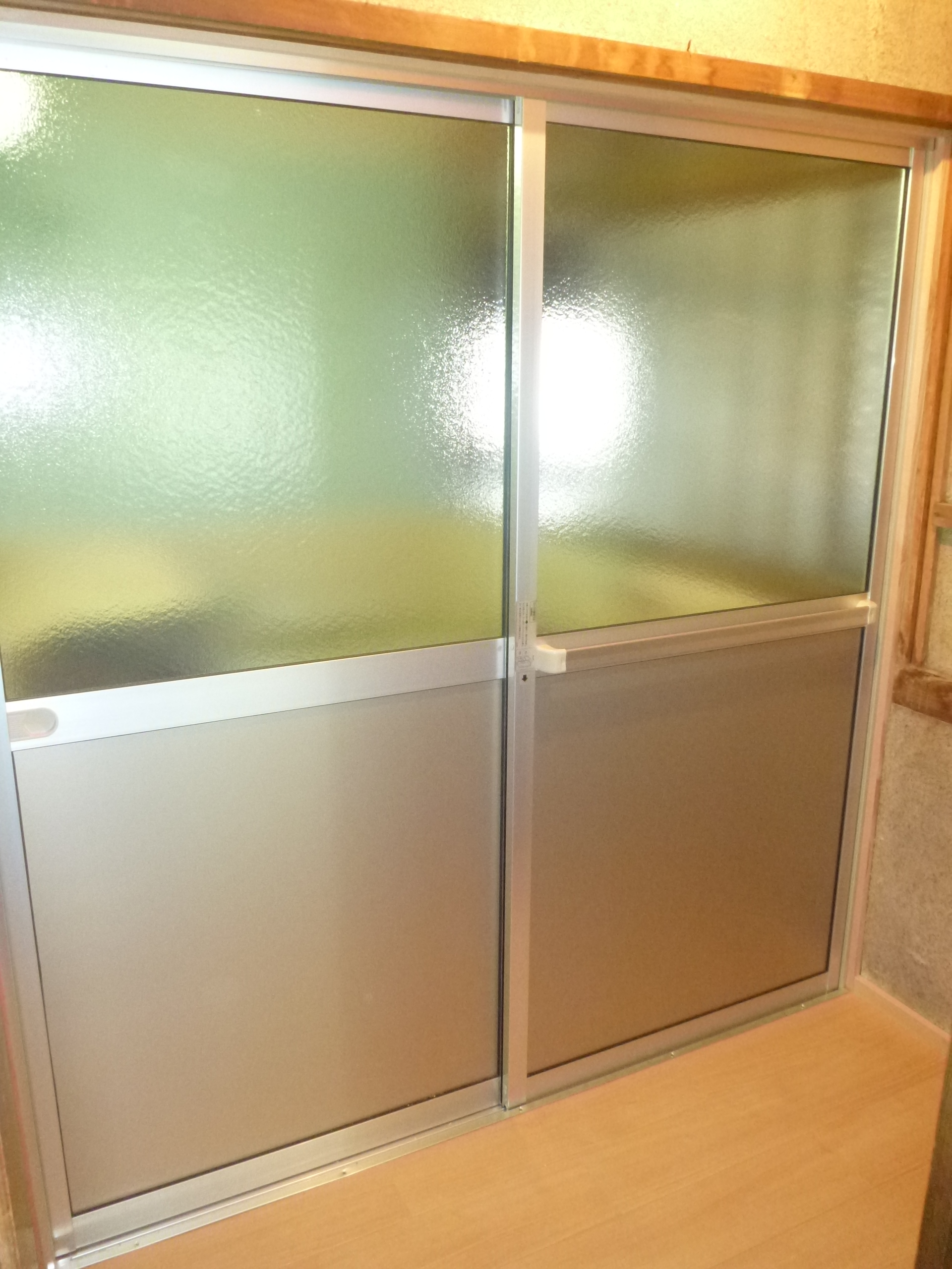 右側はもともと壁だったのですが、壁の解体を行い洗濯機の排水、通気性がよくなるように引違いのドアへ変更。
