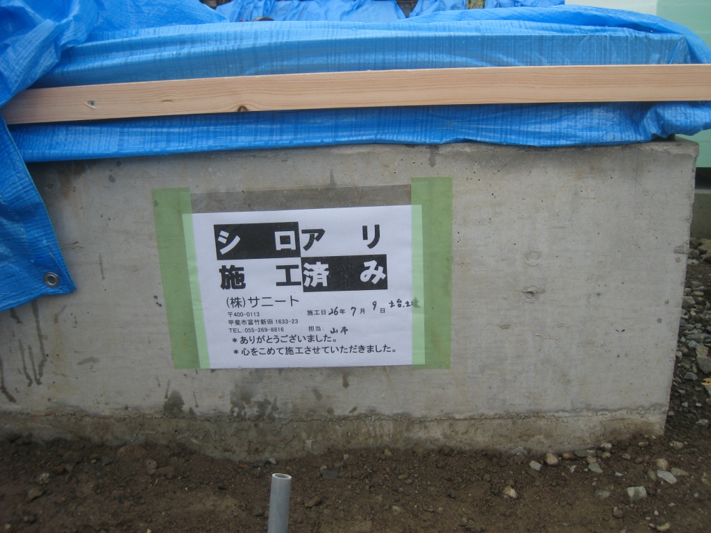 夕方には土台も大引きも敷設が完了し、シロアリ消毒も工程通りに実施!(^^)!