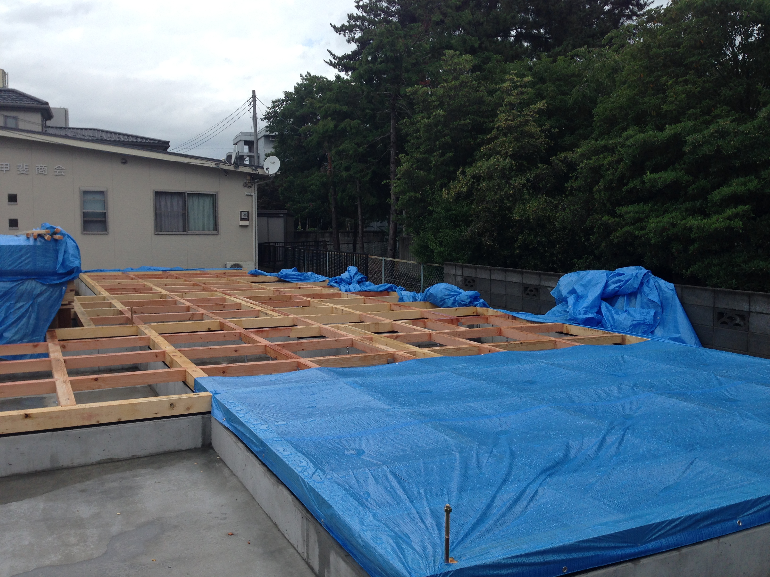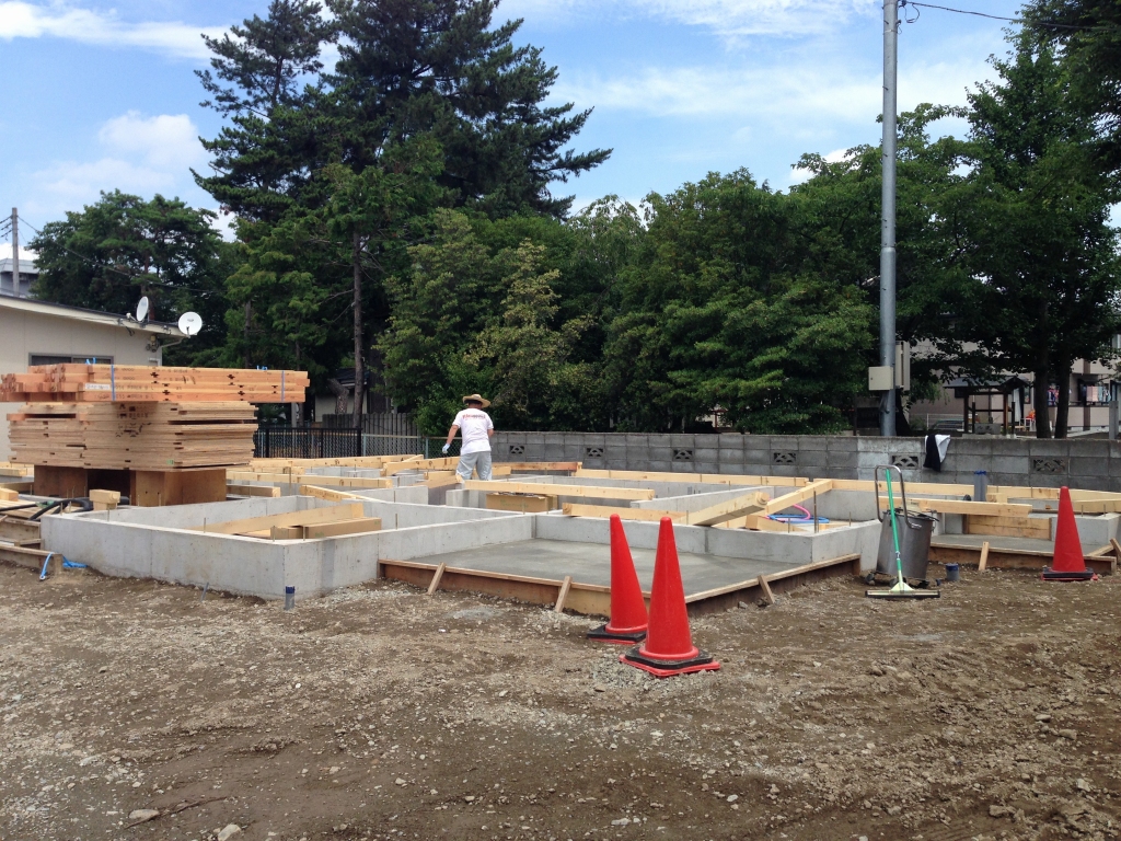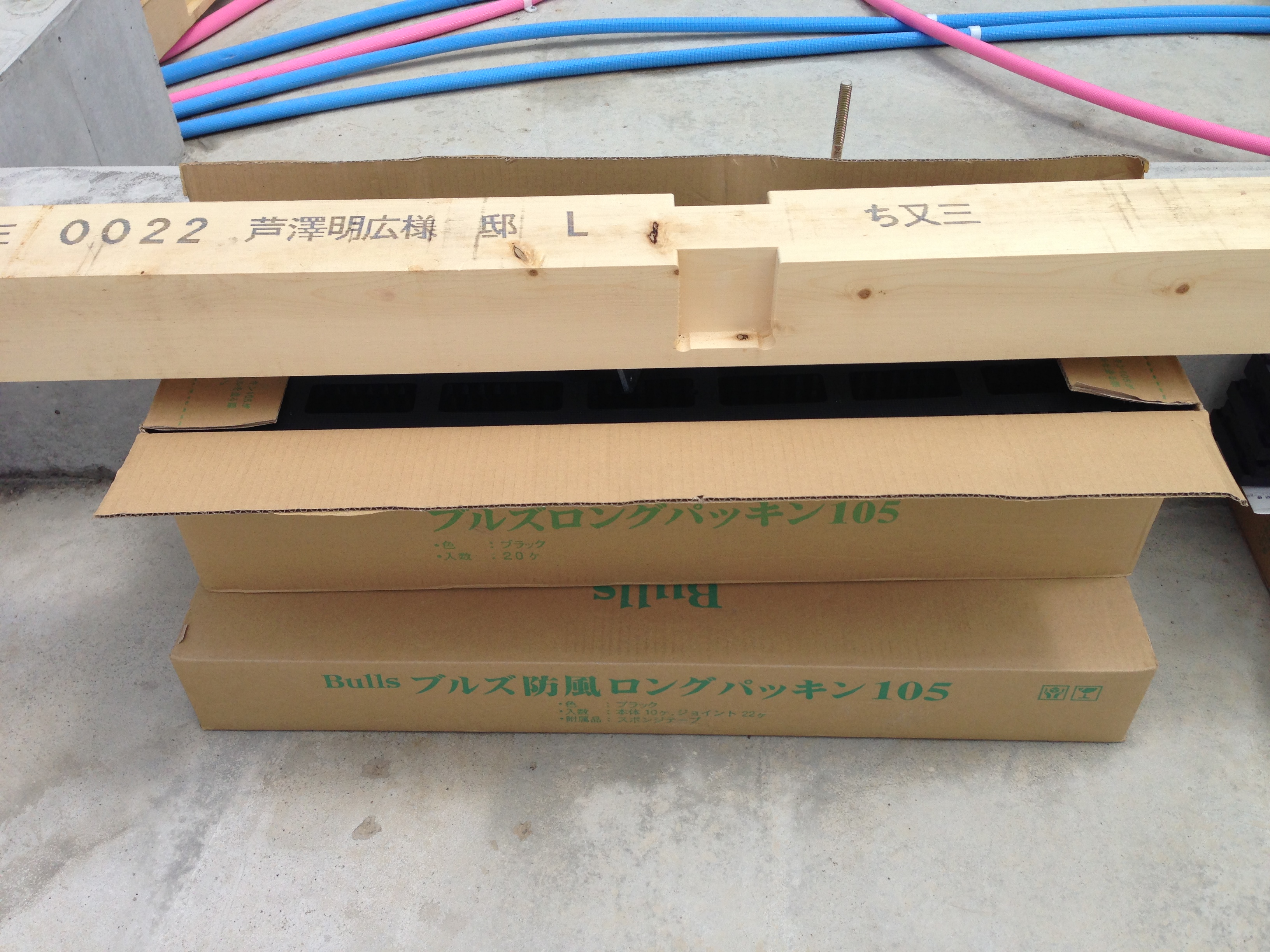 材料の荷受け後に早速、土台敷きこみ作業してくれている河西大工さん!
