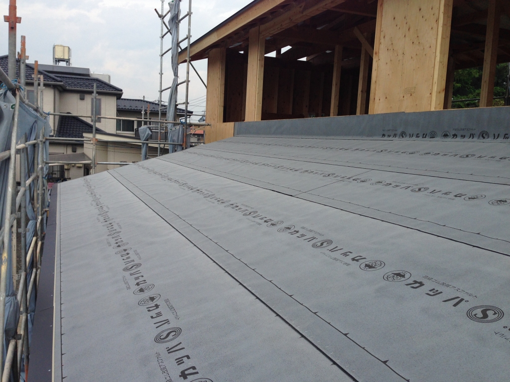 屋根のアスファルトルーフィングも敷設され、外壁は構造用合板貼りの