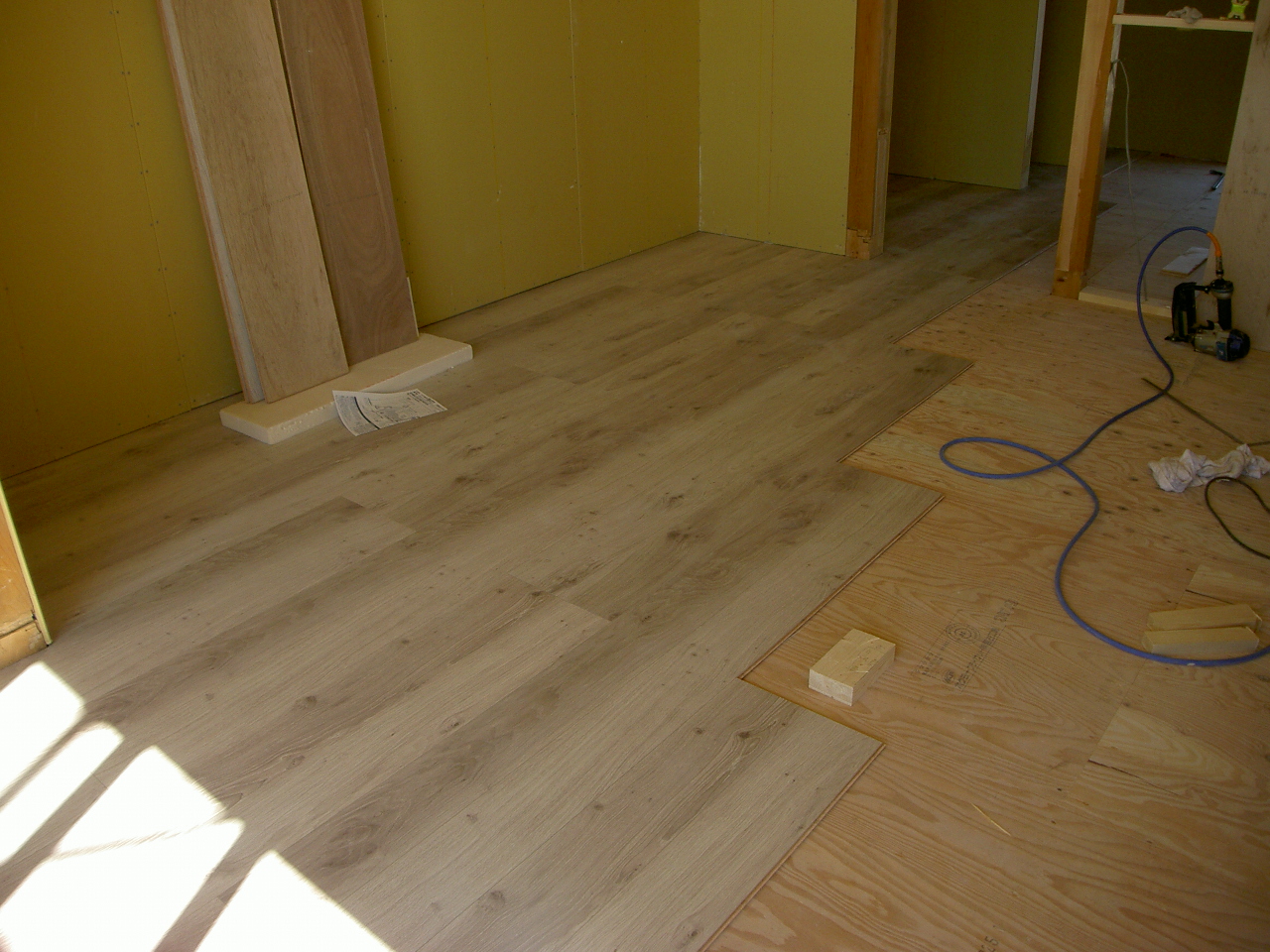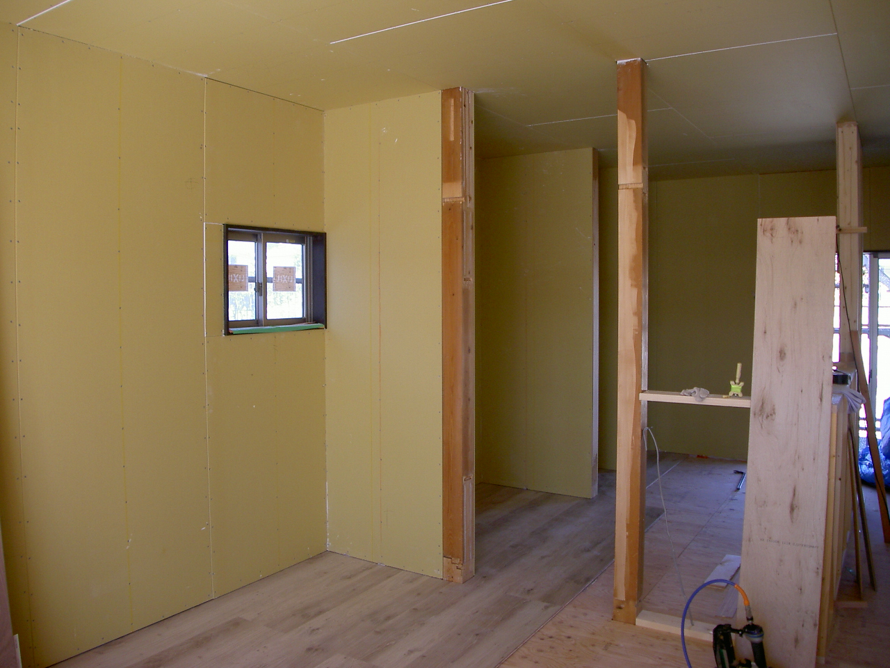 内部の下地が終わり、壁のボード貼り。床貼り工事の最中です。