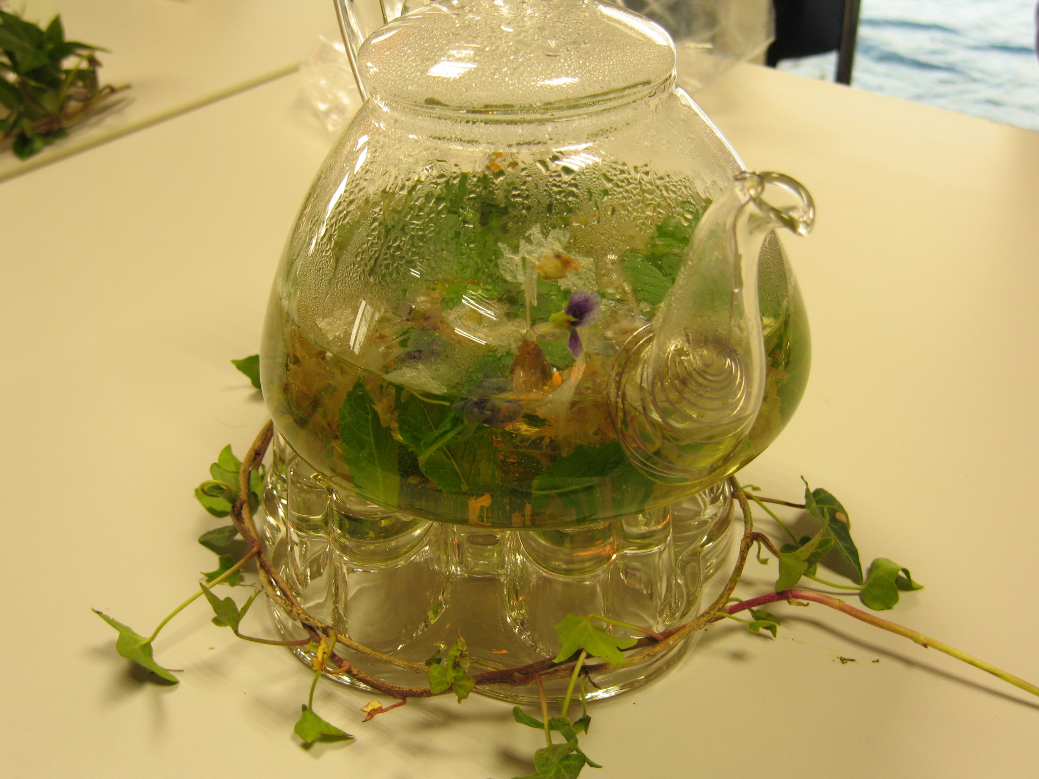今回のハーブティーは〈すみれ・マロー・ペパーミント)。いい香りに包まれ、見たことのないきれいなブルーの色。