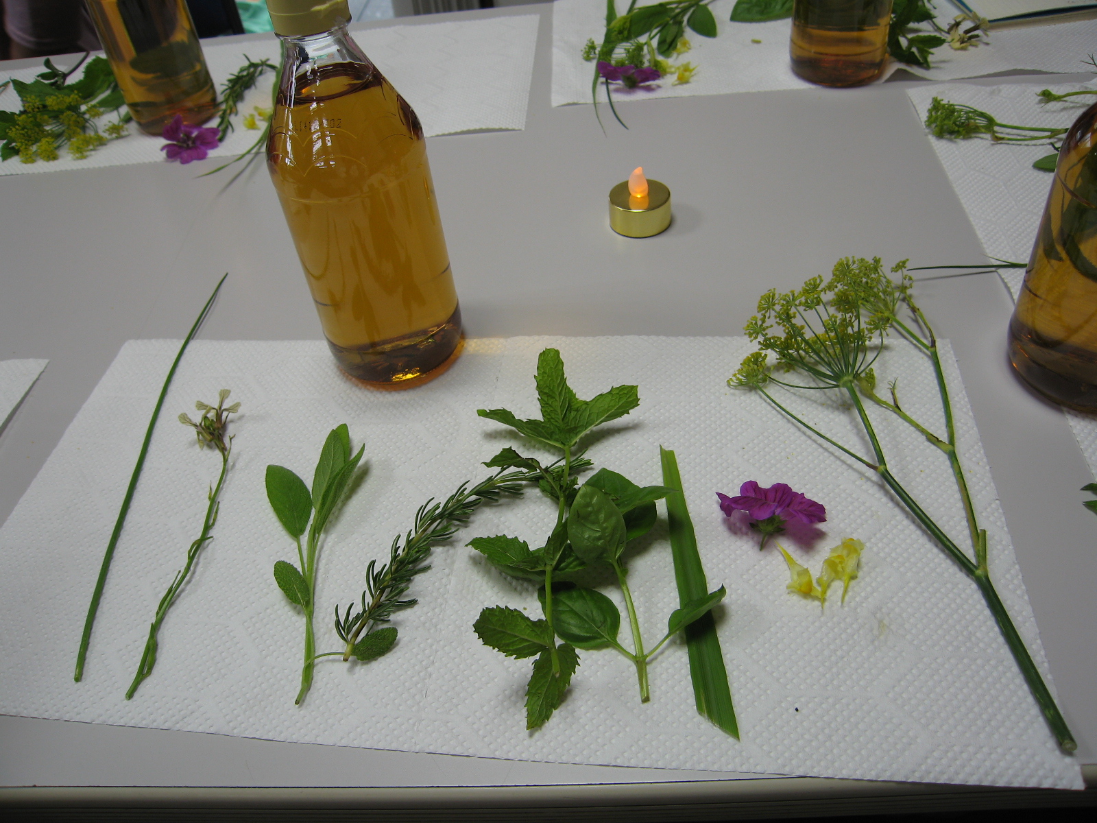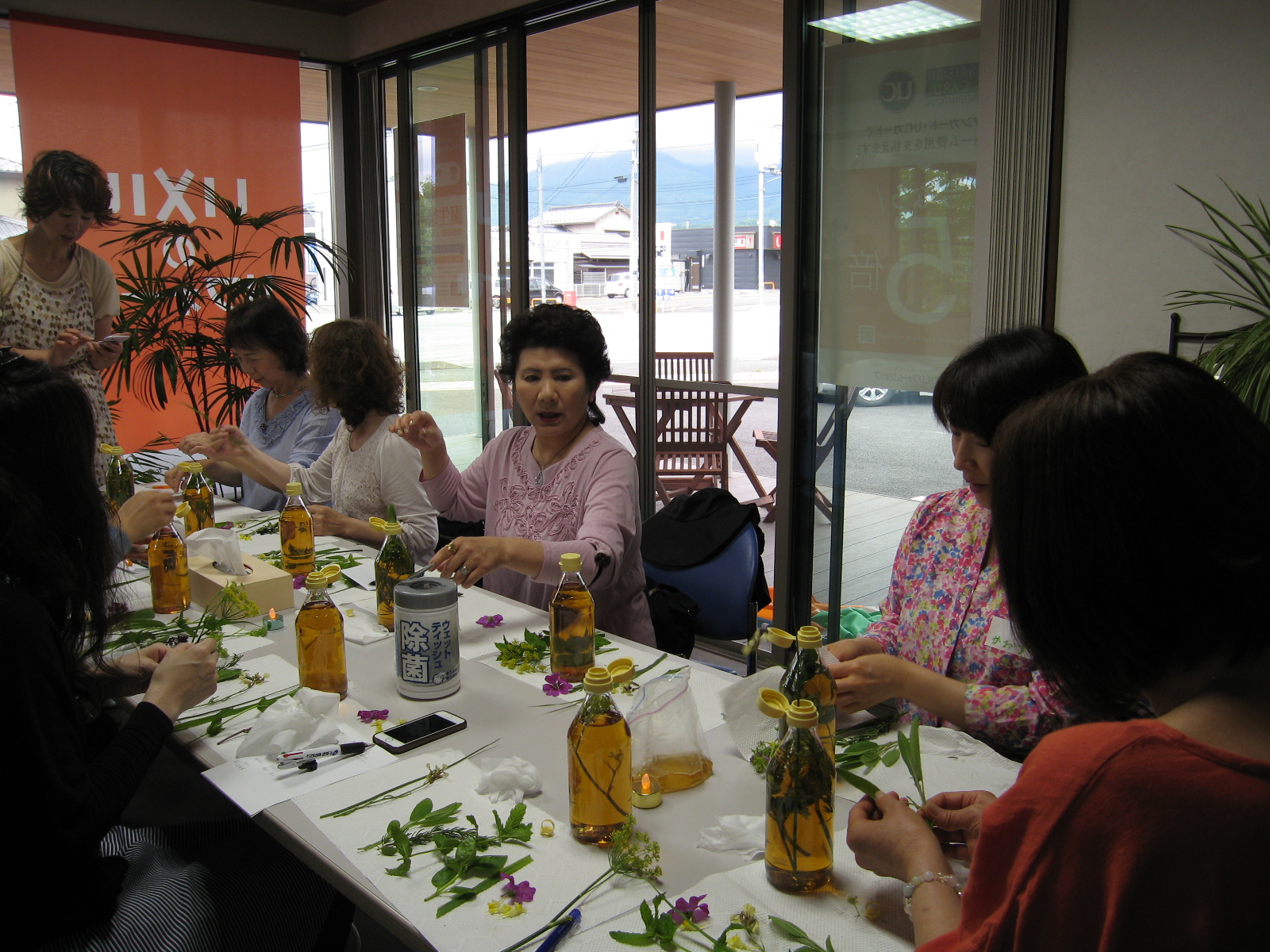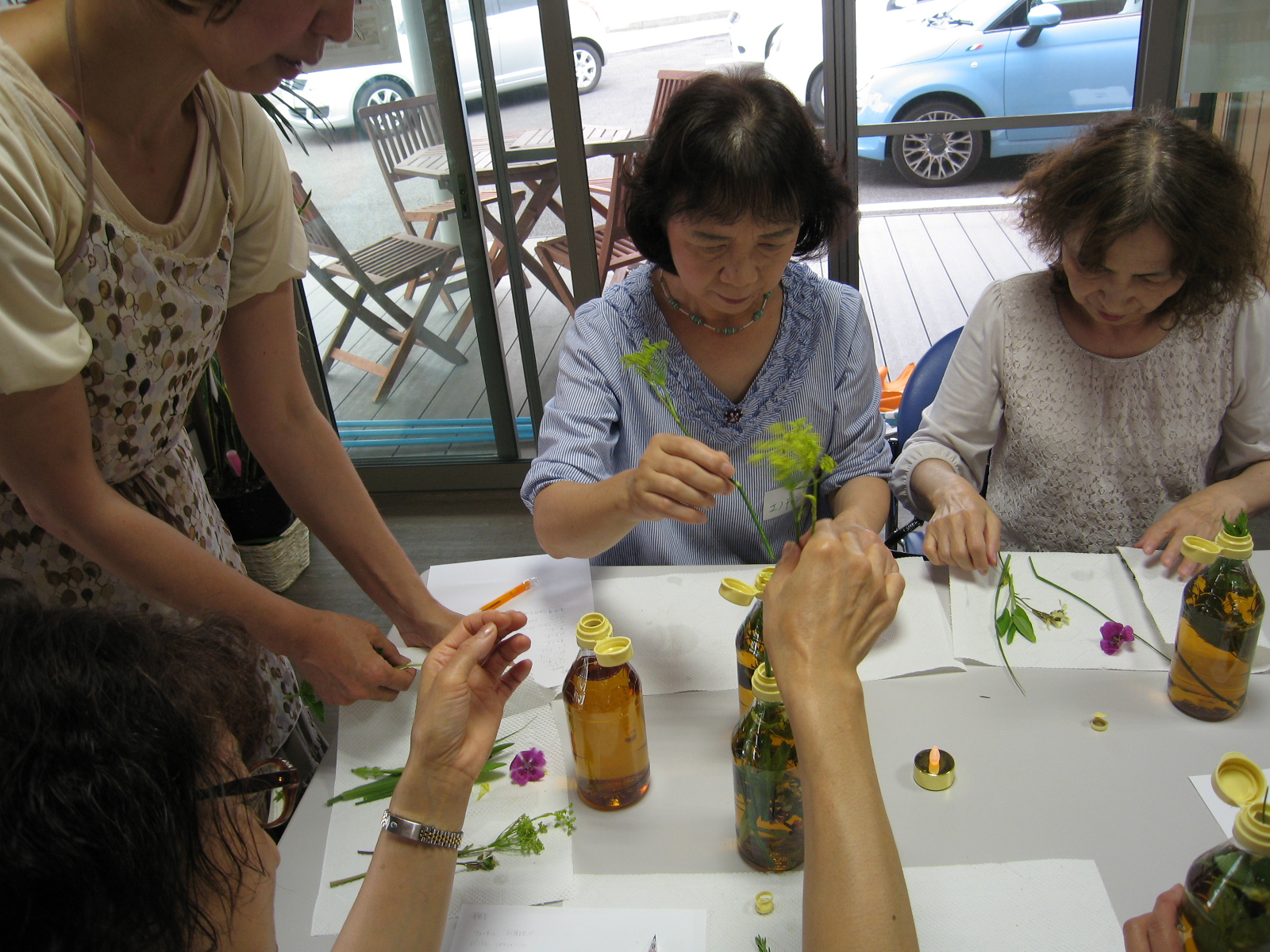 9時にむ~ちゃん先生のご挨拶、今日使うハーブ(写真上左)の効能など説明の後…作業開始!