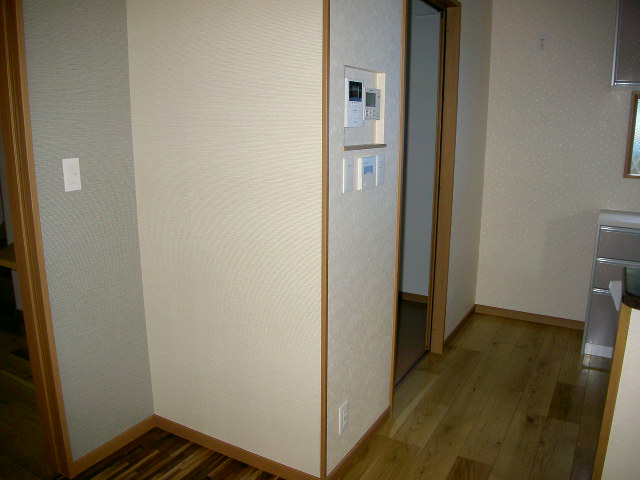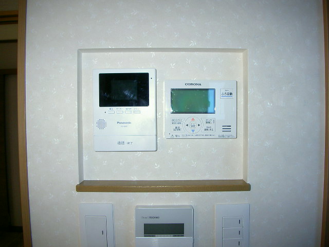 キッチン横の壁にインターホンモニターと給湯器リモコンをかわいく埋め込みました。