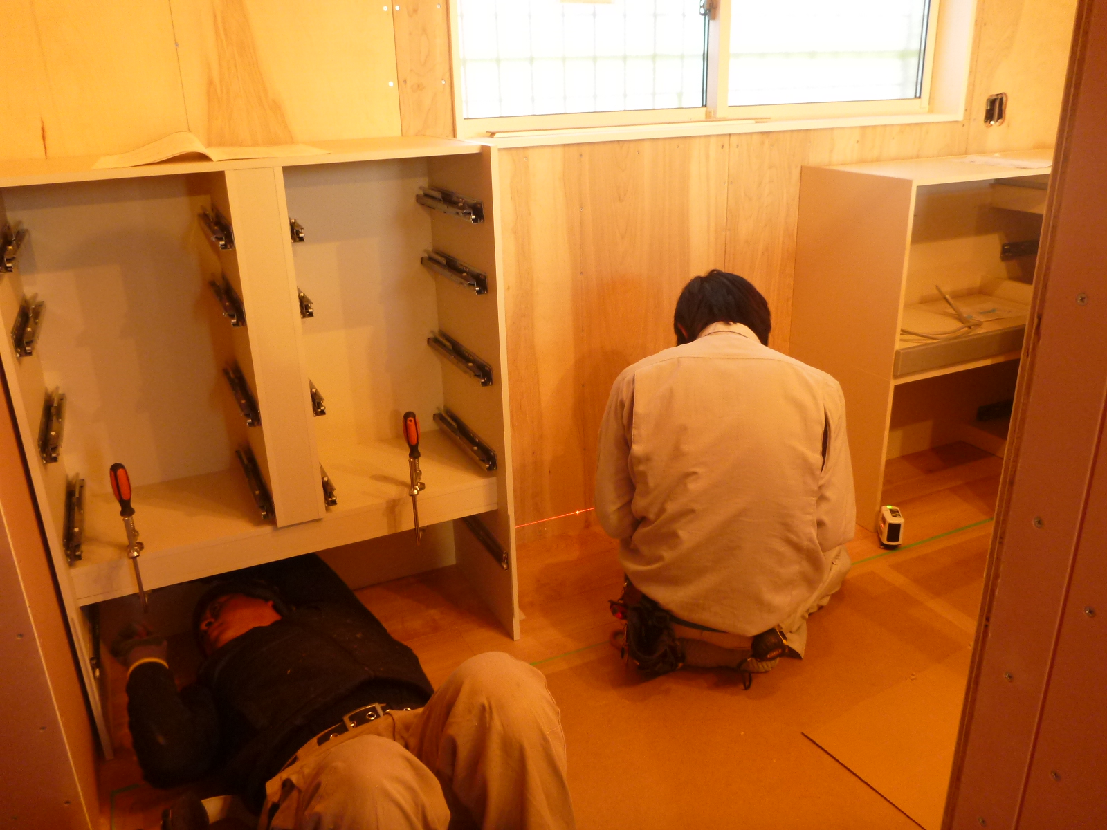 キッチンも入りました!!三人がかりで施工していました