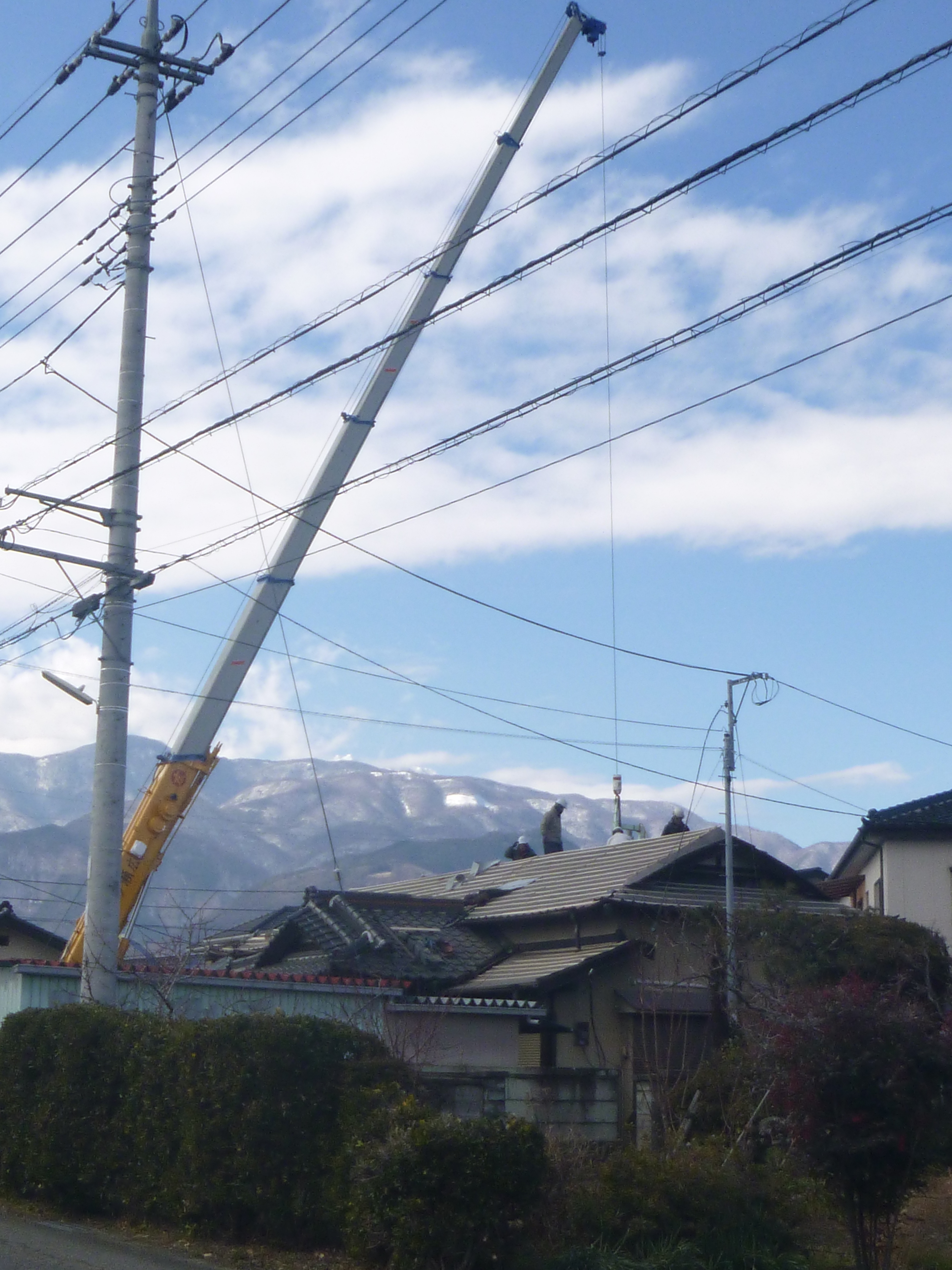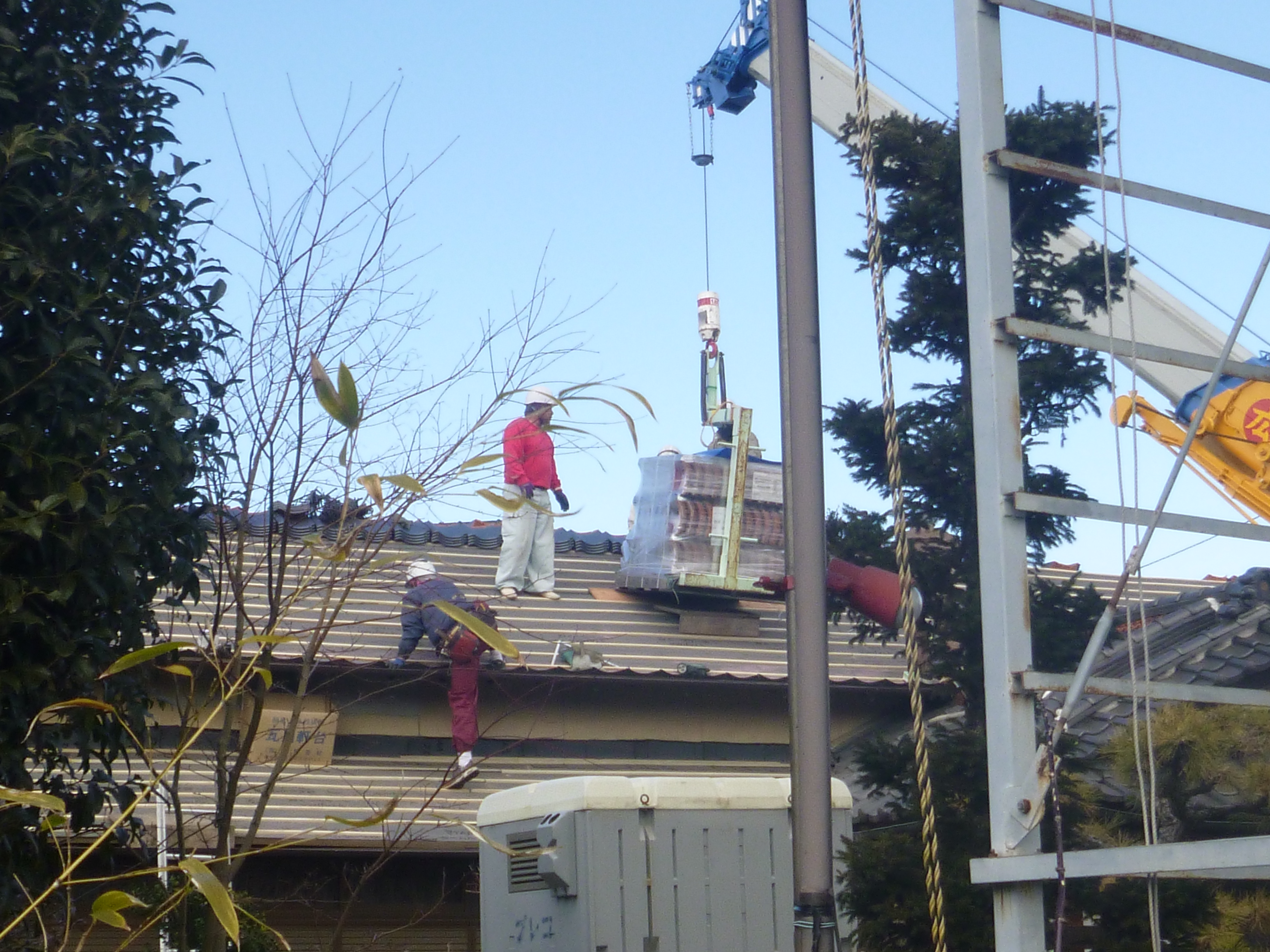 本日は高~いクレーン車にて瓦の上げ下しの作業です。