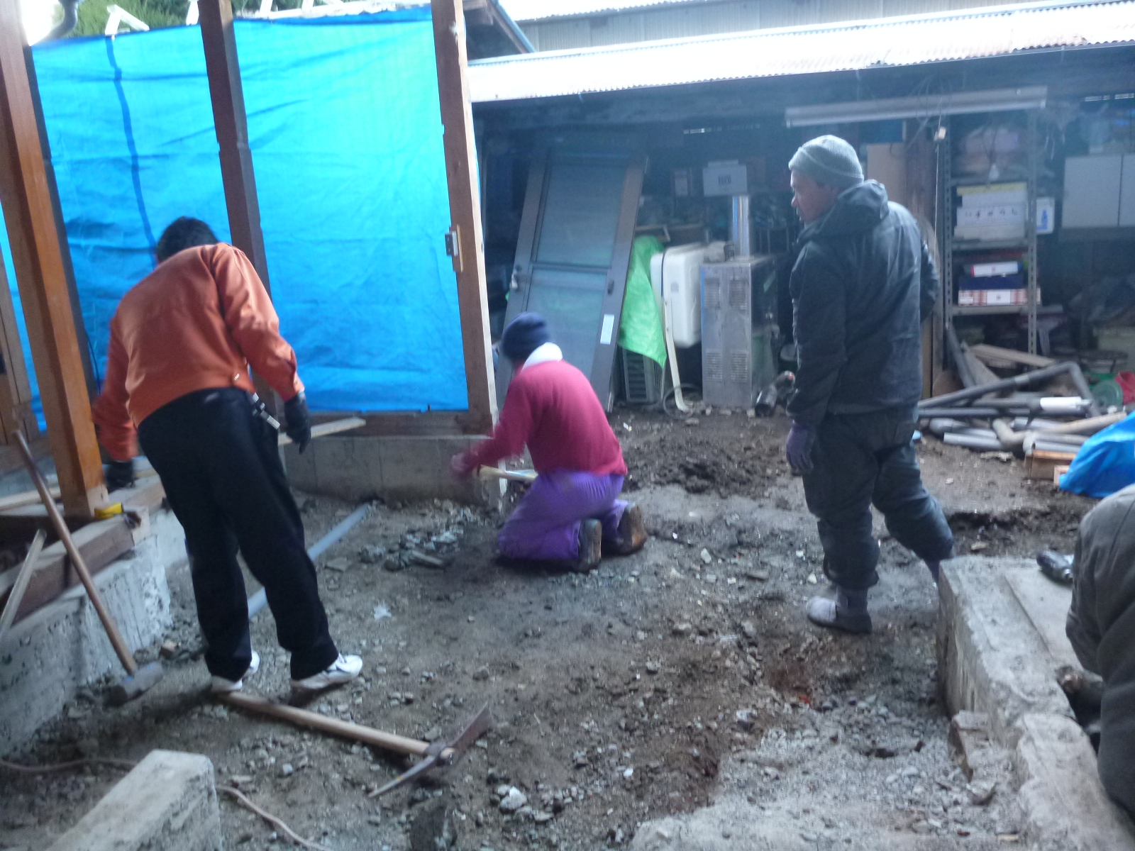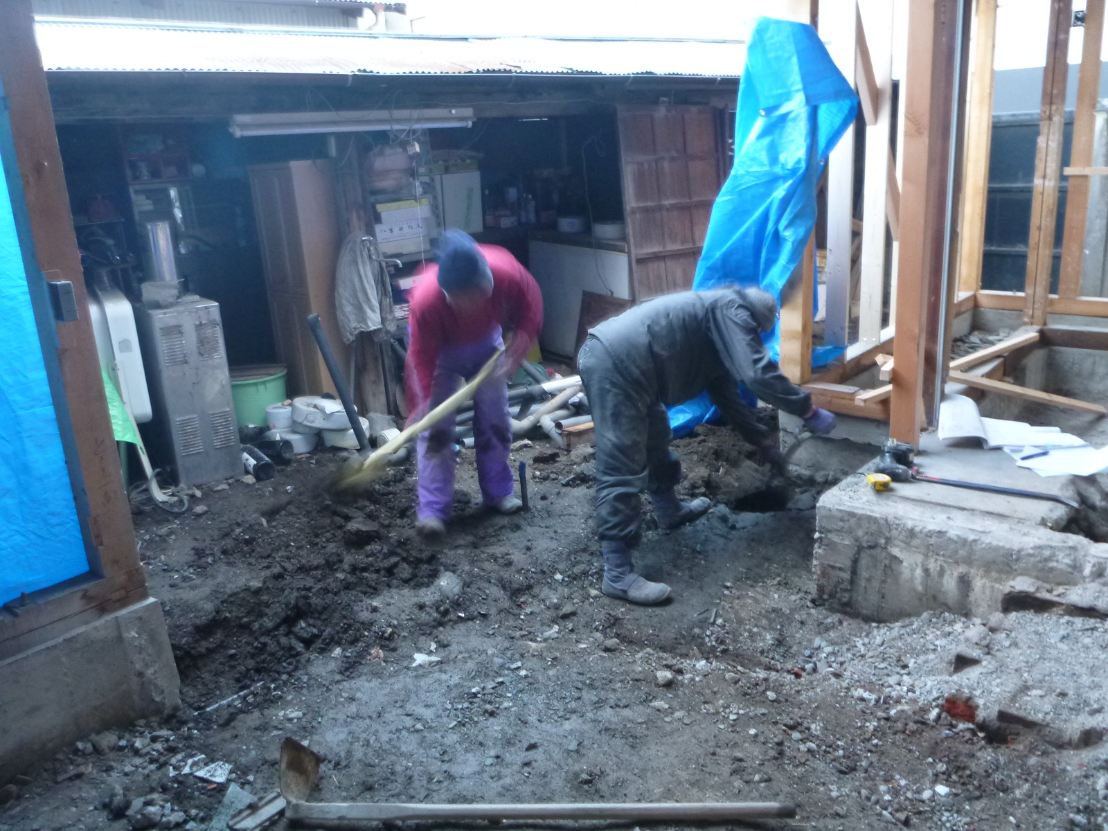 基礎屋さんたちが土間を打つために、手作業で穴を掘っています!!
