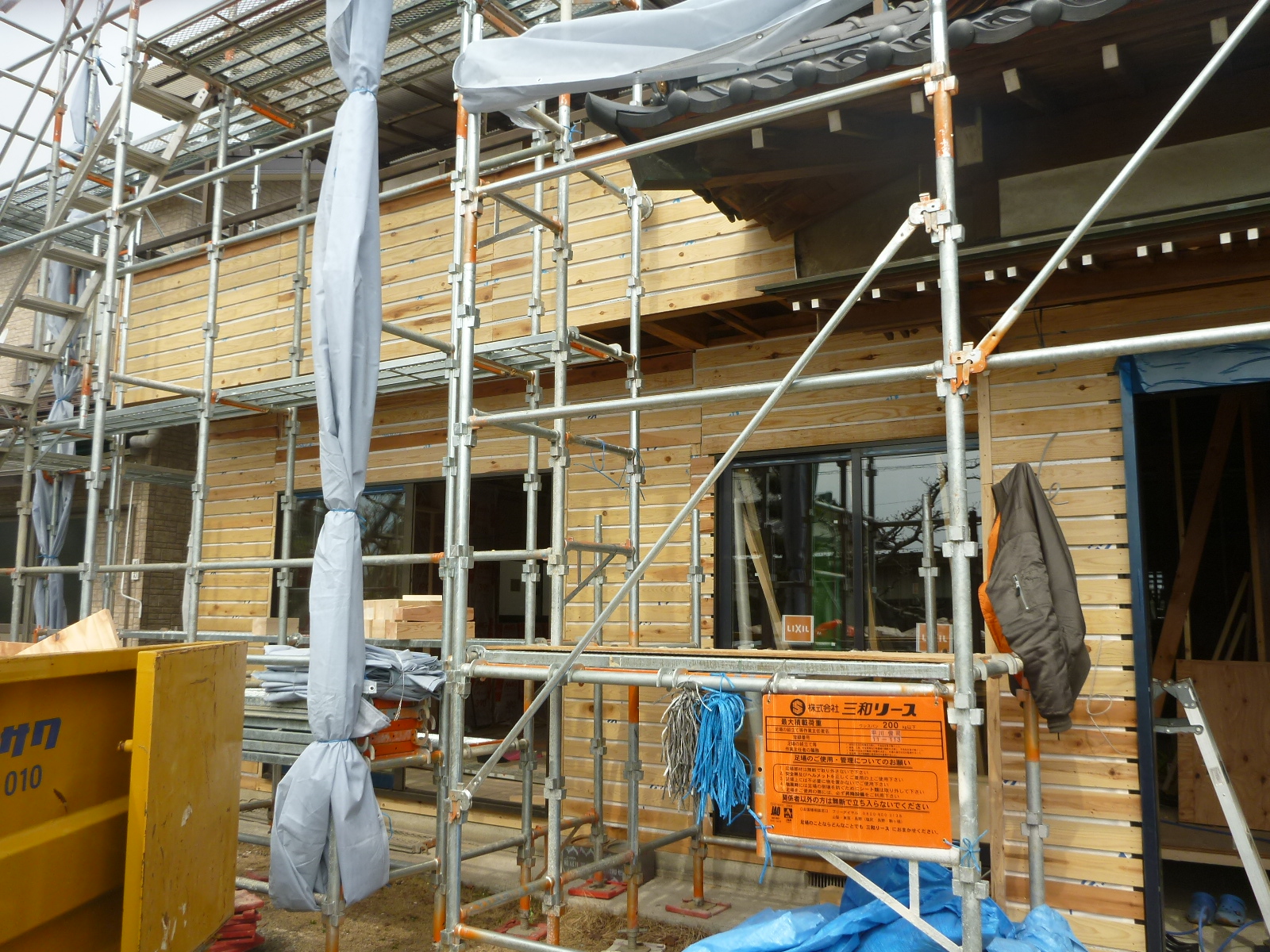 外部足場が設置され、外壁には《ザラ板》が張ってある状態です!!