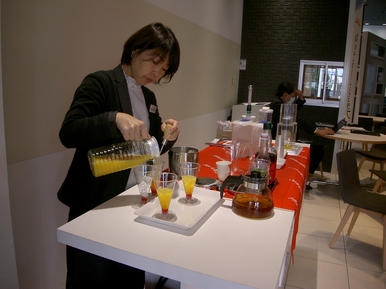 今回は特別にLIXIL「浄水器」の実演も行いました。比重の異なるザクロシロップ+オレンジジュース+アイスティーの三層の美しいカクテルも好評でした。❤