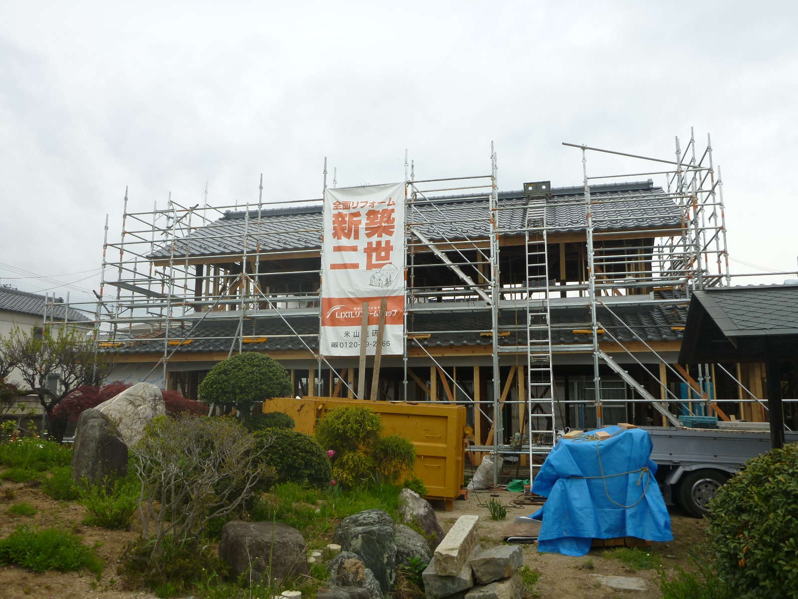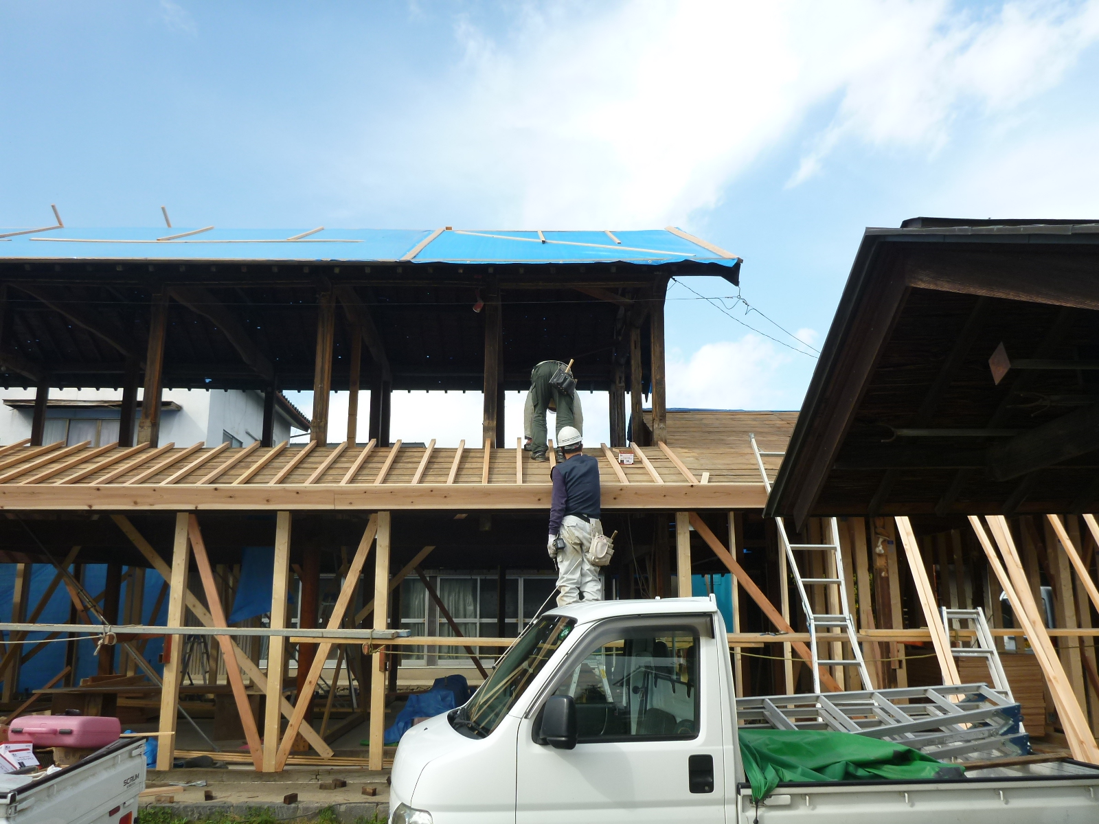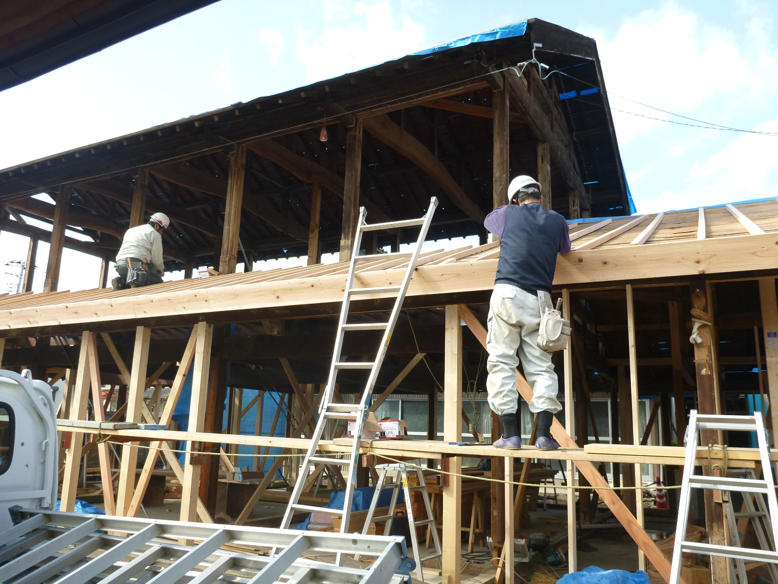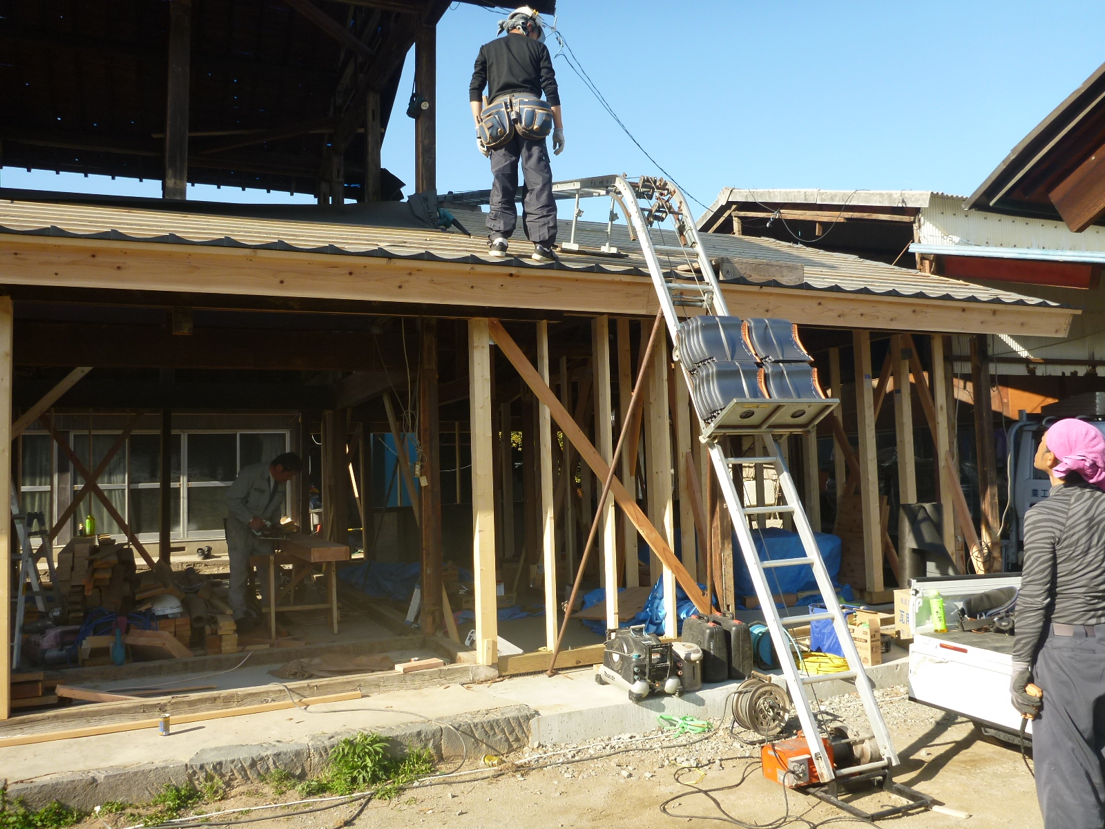 瓦屋さんが一階の屋根に瓦を運んでいるところです!(^^)!