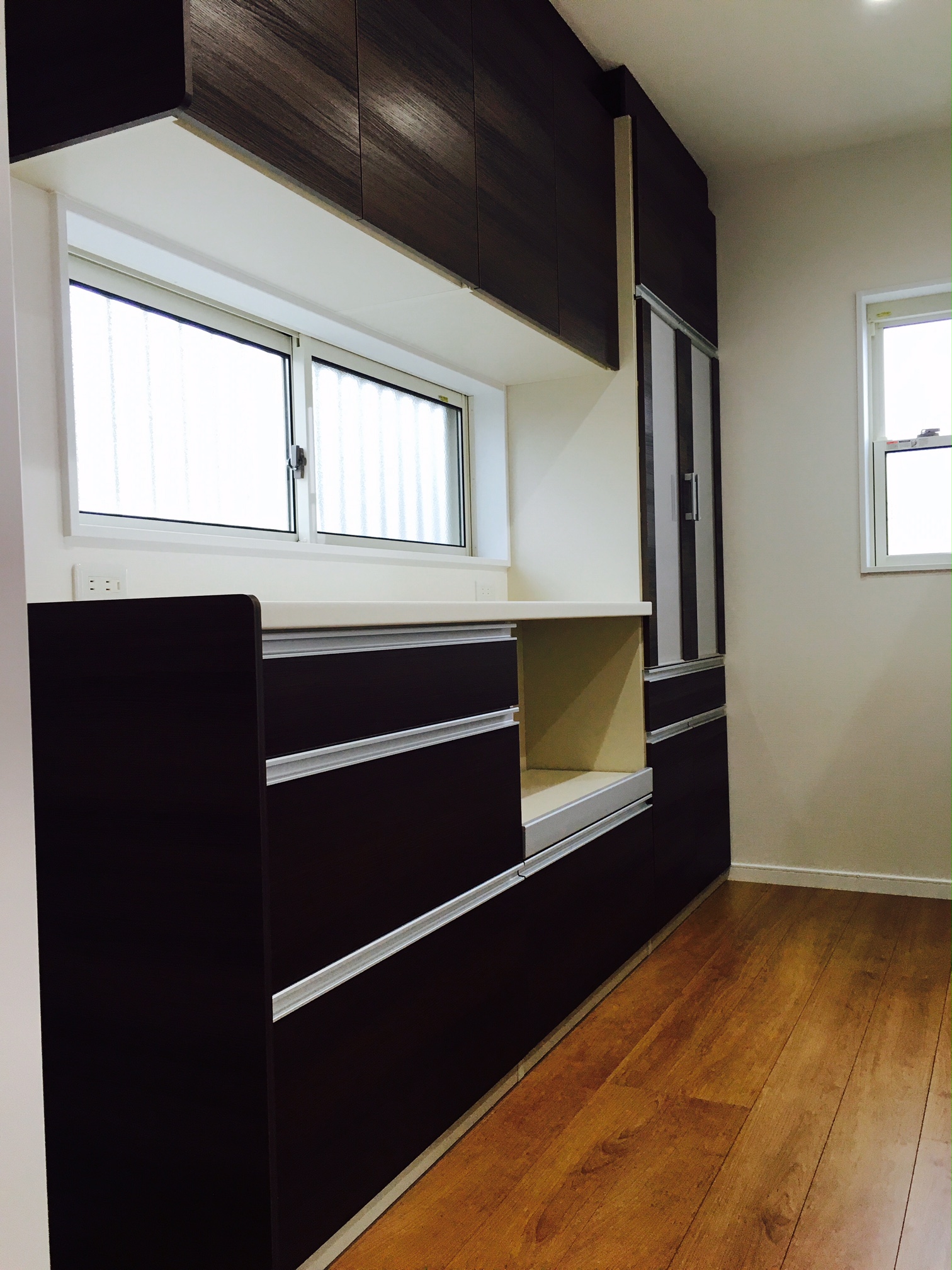 対面キッチンの背面にはたくさん収納できる《背面収納》があります。