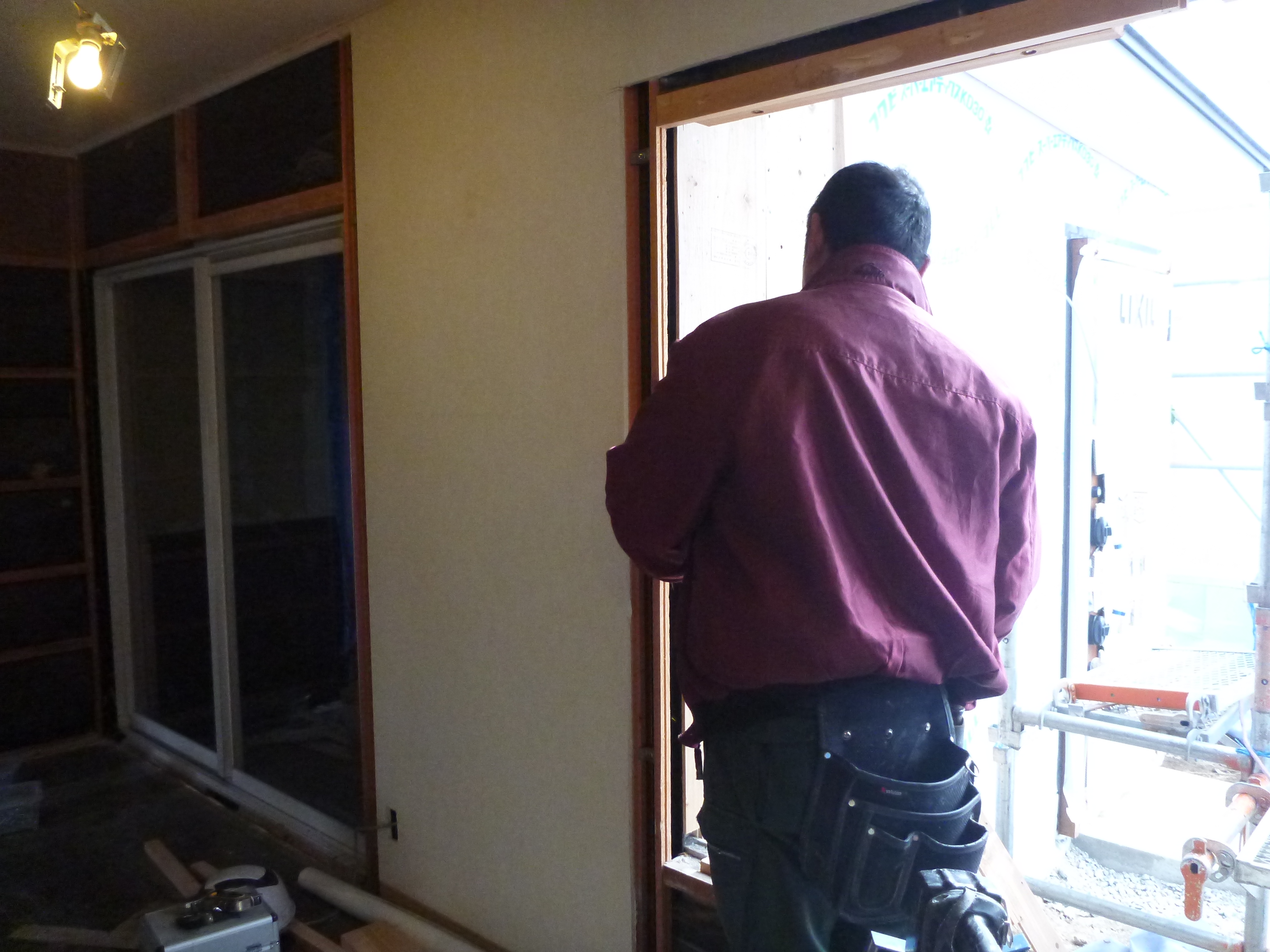 大工さんはリビングのサッシを取り付けていました。