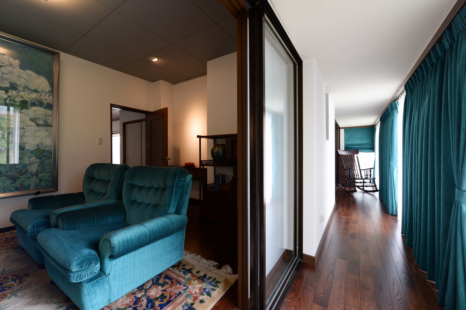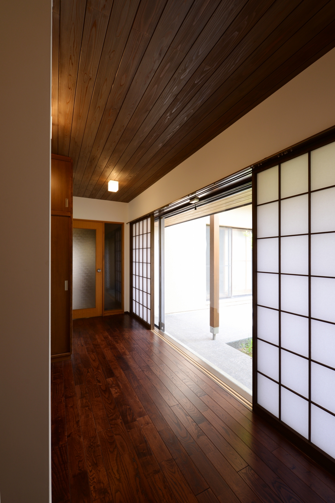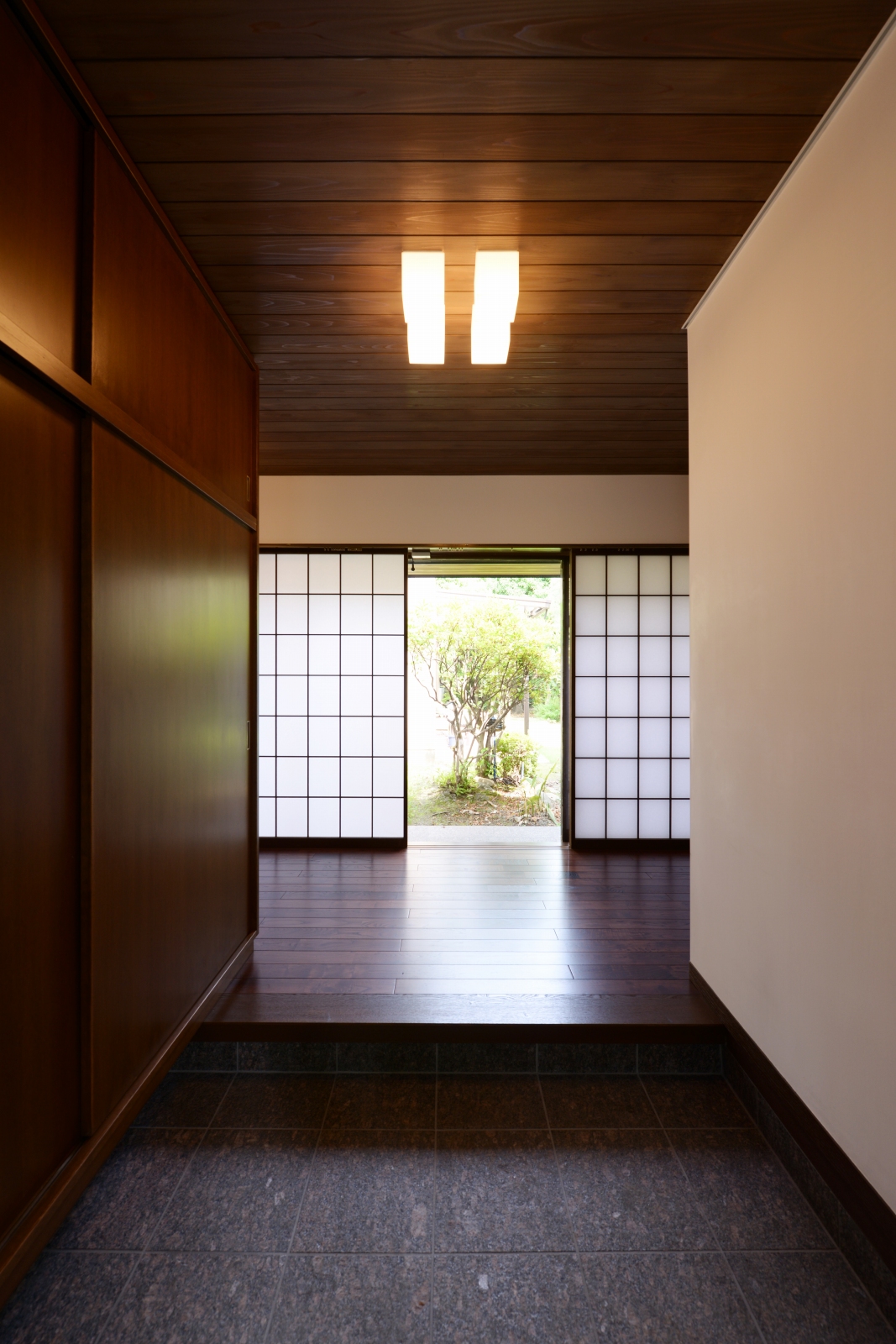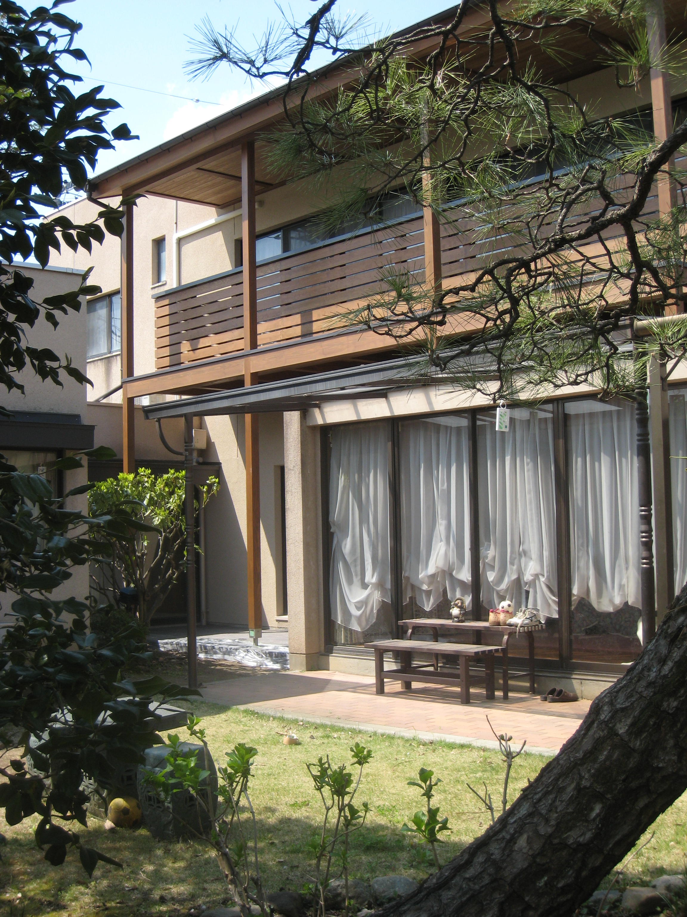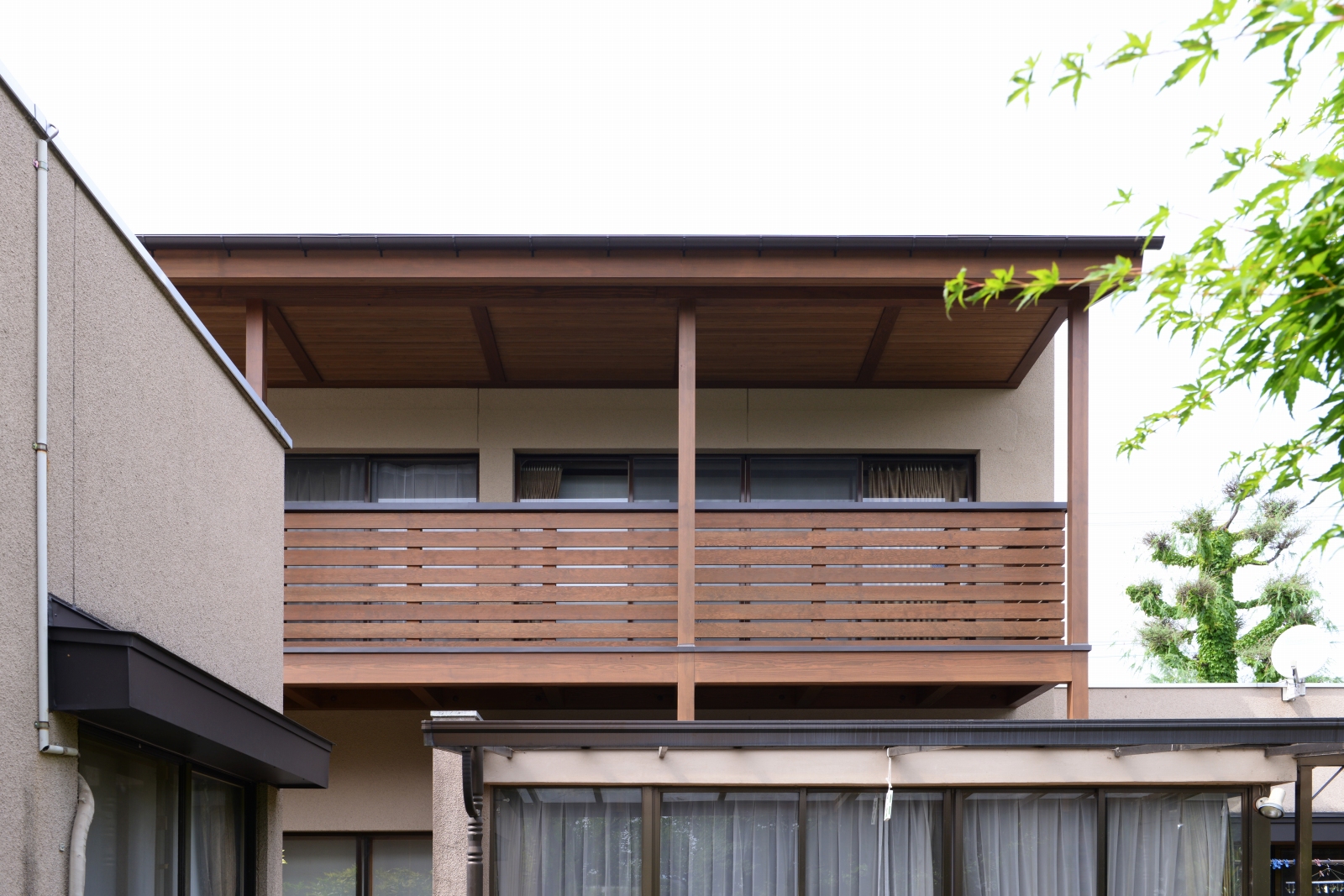 コンクリートの経年劣化が目立つようになったのをきっかけにリフォーム。 コンクリート製ベランダを解体し、2階のお部屋全面に天然木の デッキと屋根をつくりました。 天然木(ピーラー材)の香りとあたたかみに拘った癒しの空間。 お庭とお部屋を自然な形で繋ぎ心地よい風と光を感じられる心地よい 暮らしが創造できます。 又、内部は自然素材にこだわりをもち玄関廻りや応接室、縁側をリフォーム。 床は栗のフローリング、壁は漆喰、天井は杉板と落ちつきある雰囲気で癒される空間に大変身!