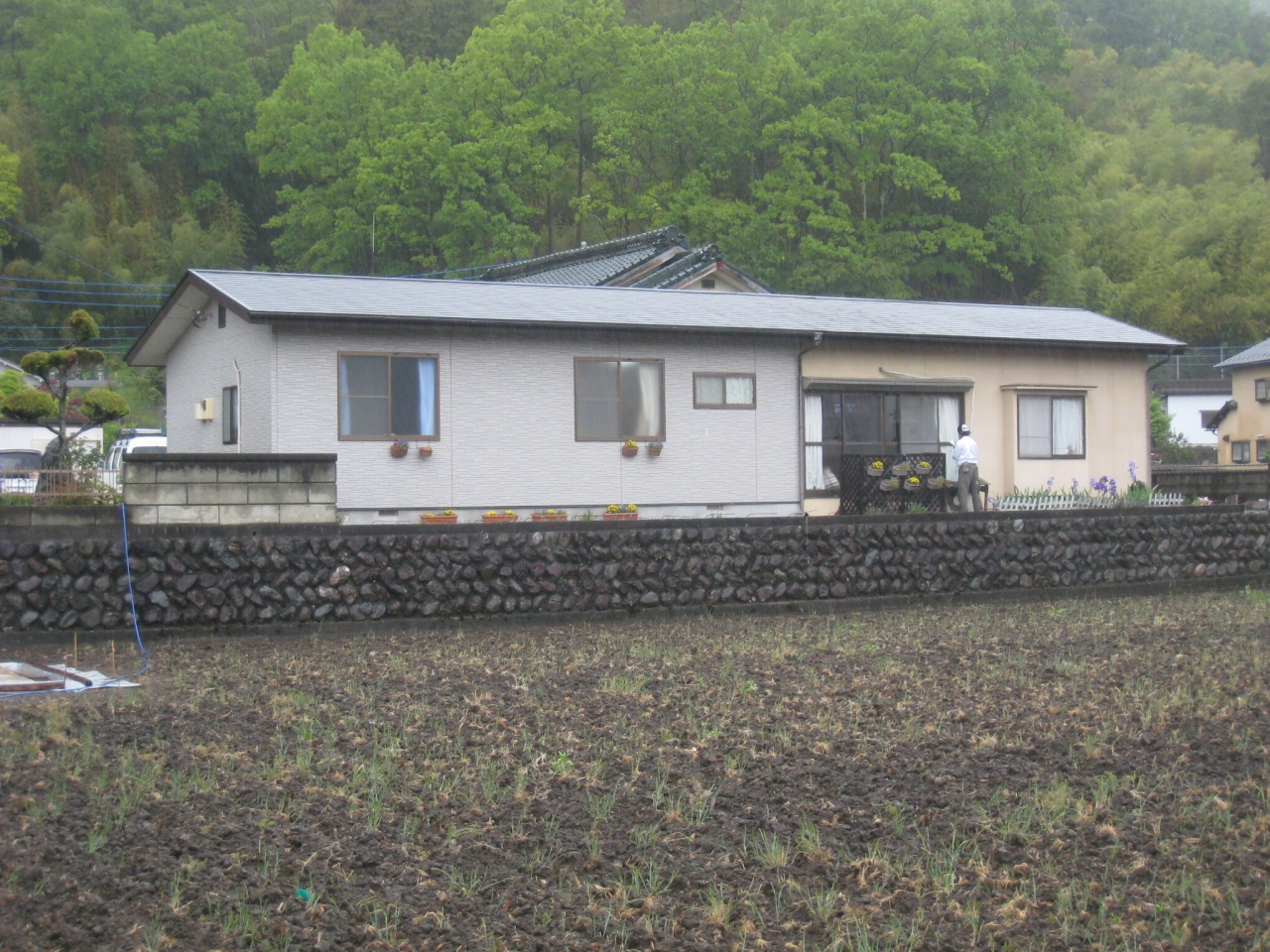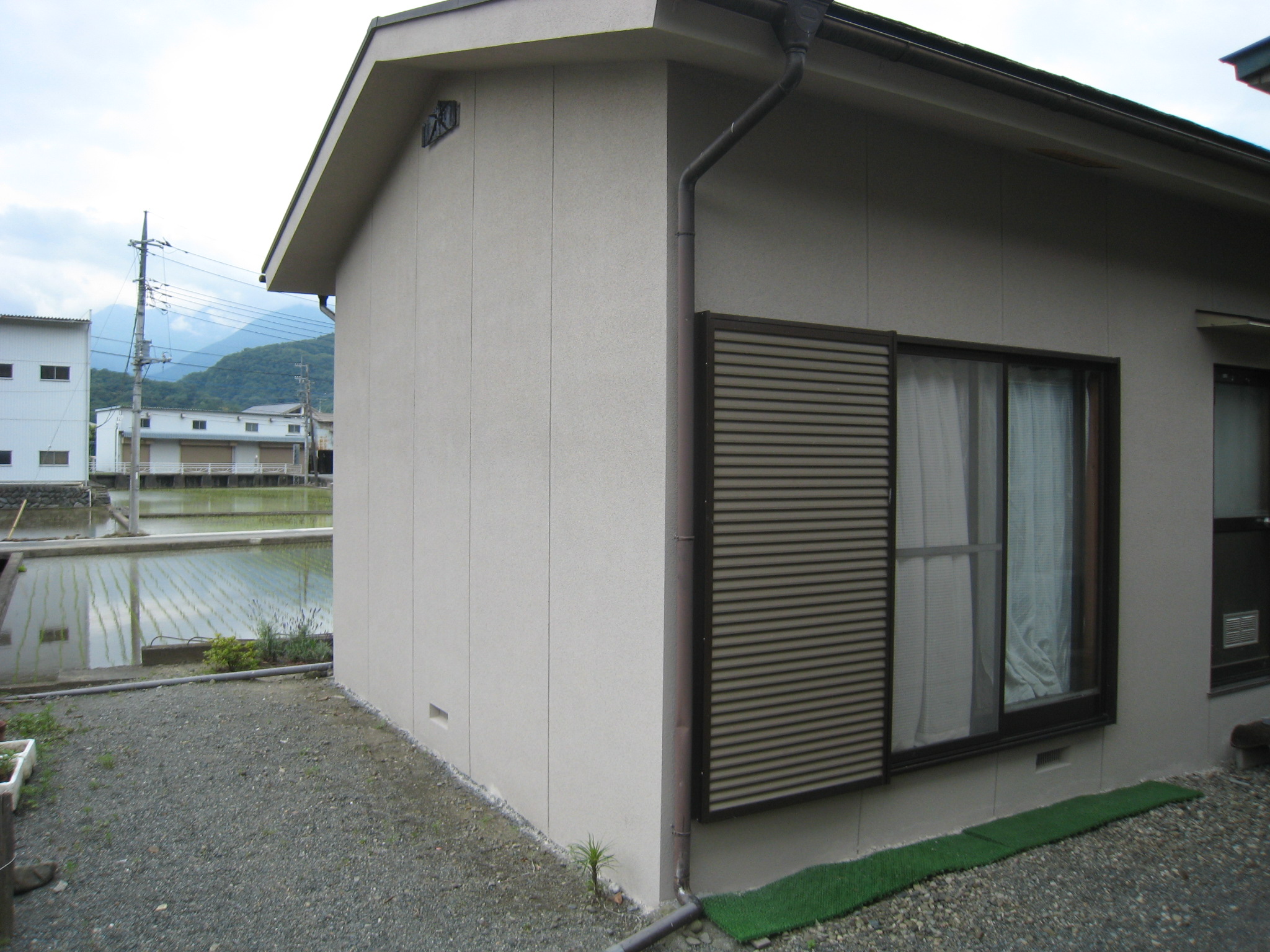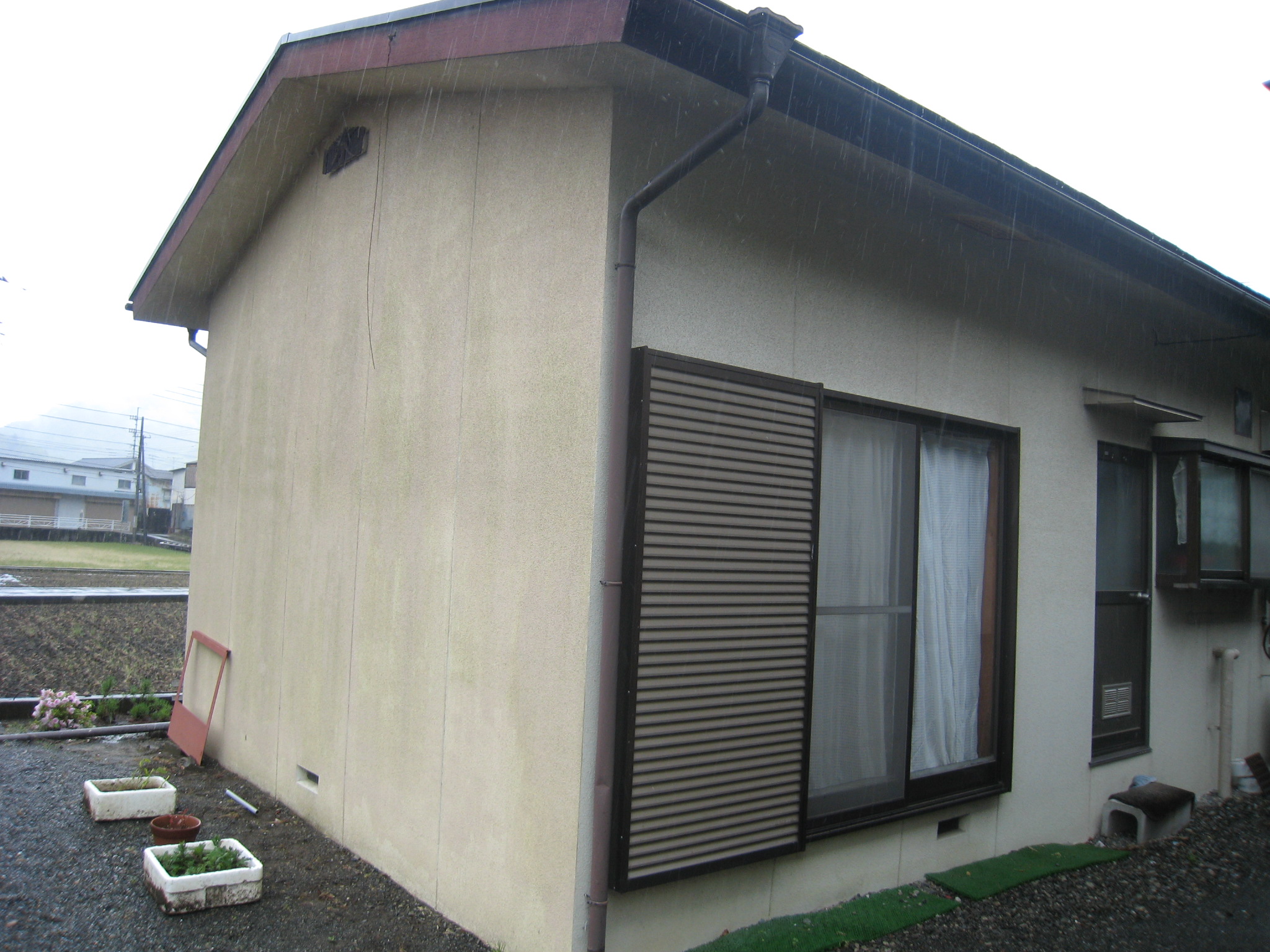 外壁塗替リフォーム 10年が経過し汚れや色褪せが目立ってきた外壁。数年前、増築した部分の色に合わせて塗替え。小さなクラックも補修しながらのリシン吹付!新築のように生まれかわりました!写真右半分が色調を合わせてリフォームした外壁です。