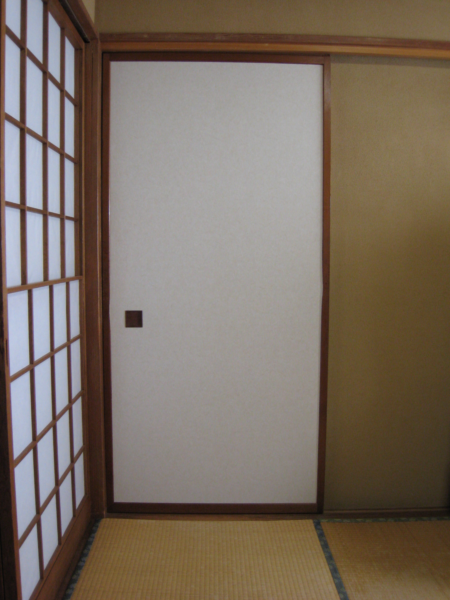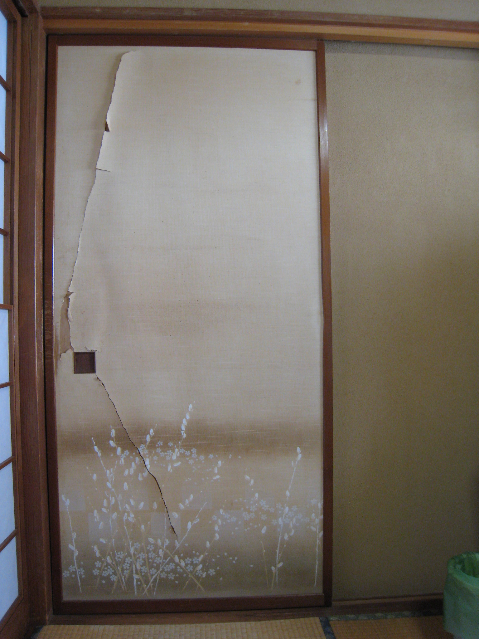 和室襖紙貼替え 破けてしまった片面の襖紙を和紙調クロスに貼替え。リーズナブルな価格で1時間以内のスピード対応!