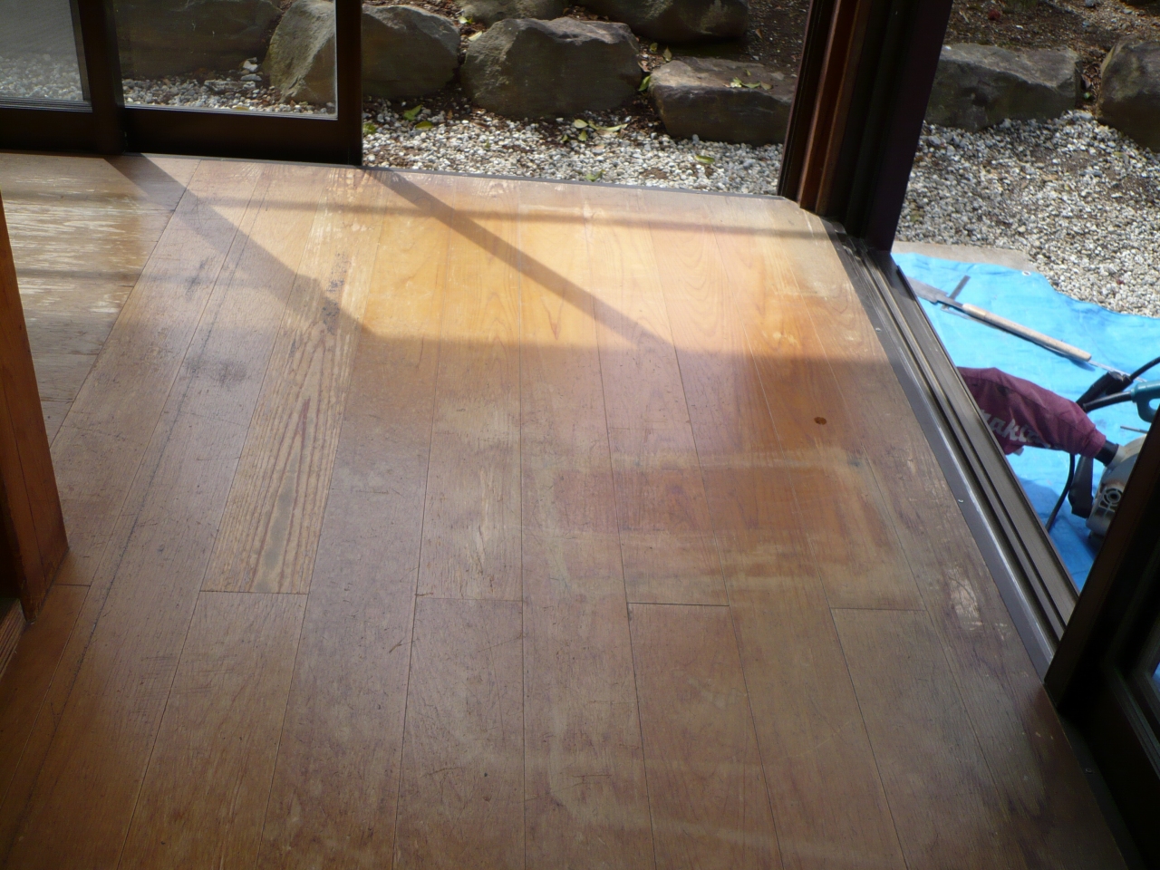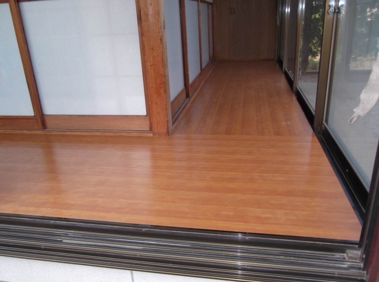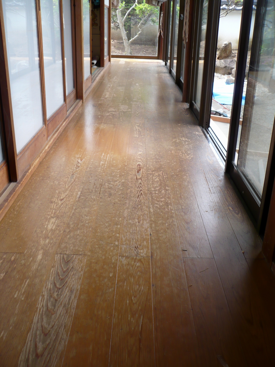 縁側床フォーム 表面の劣化が目立つ縁側床材の上に松柄の縁甲板を重ね貼り!解体作業がないため廃材などはなく環境にもやさしい、そして何よりお財布にもやさしいリフォーム方法です。