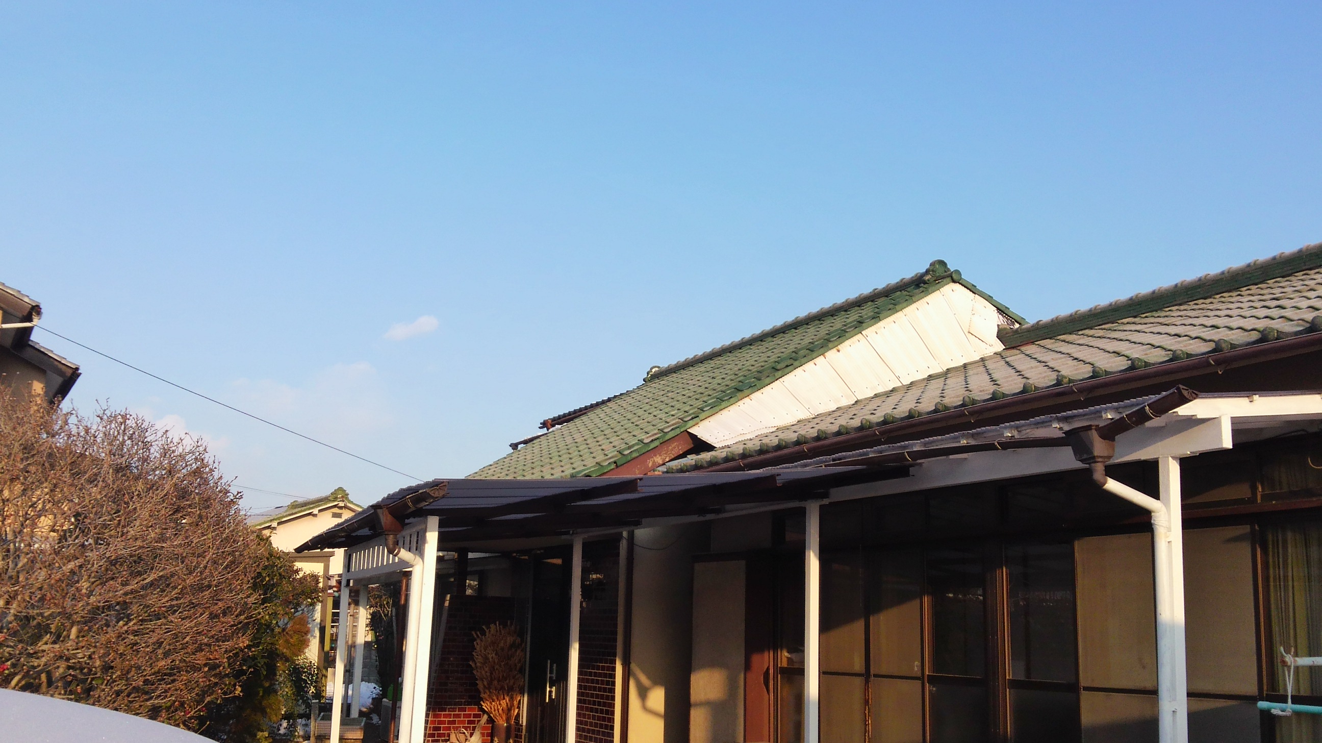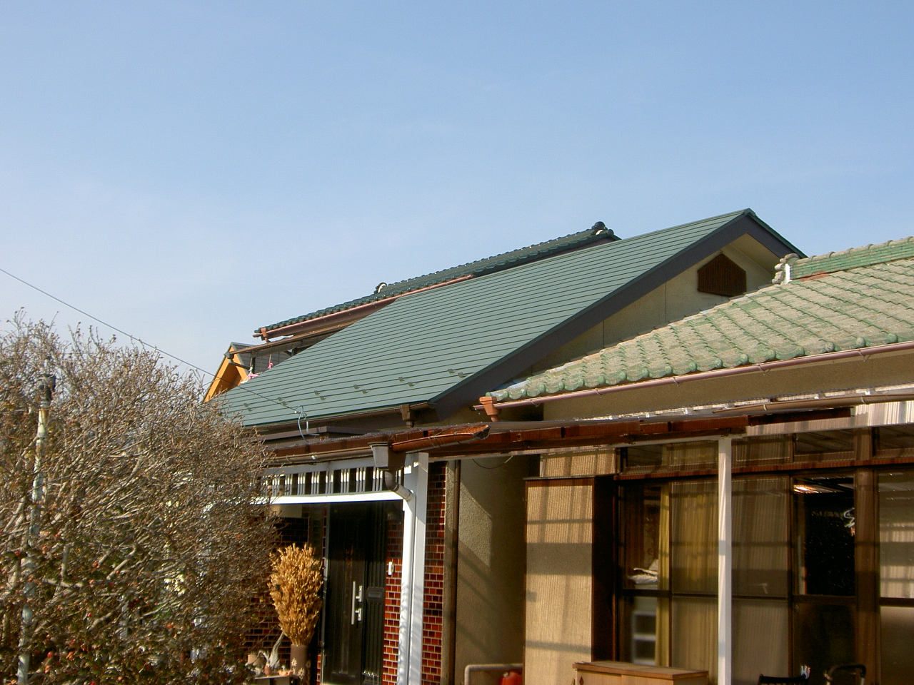 重い瓦屋根をガルバリウム鋼板の屋根に葺き替えた軽量化リフォーム。 これによる結果、自重が軽減されたことにより耐震性も向上したこととなりました。 同色の鋼板で破風の部分も包み込み、デザイン的にも美しく生まれ変わりました。