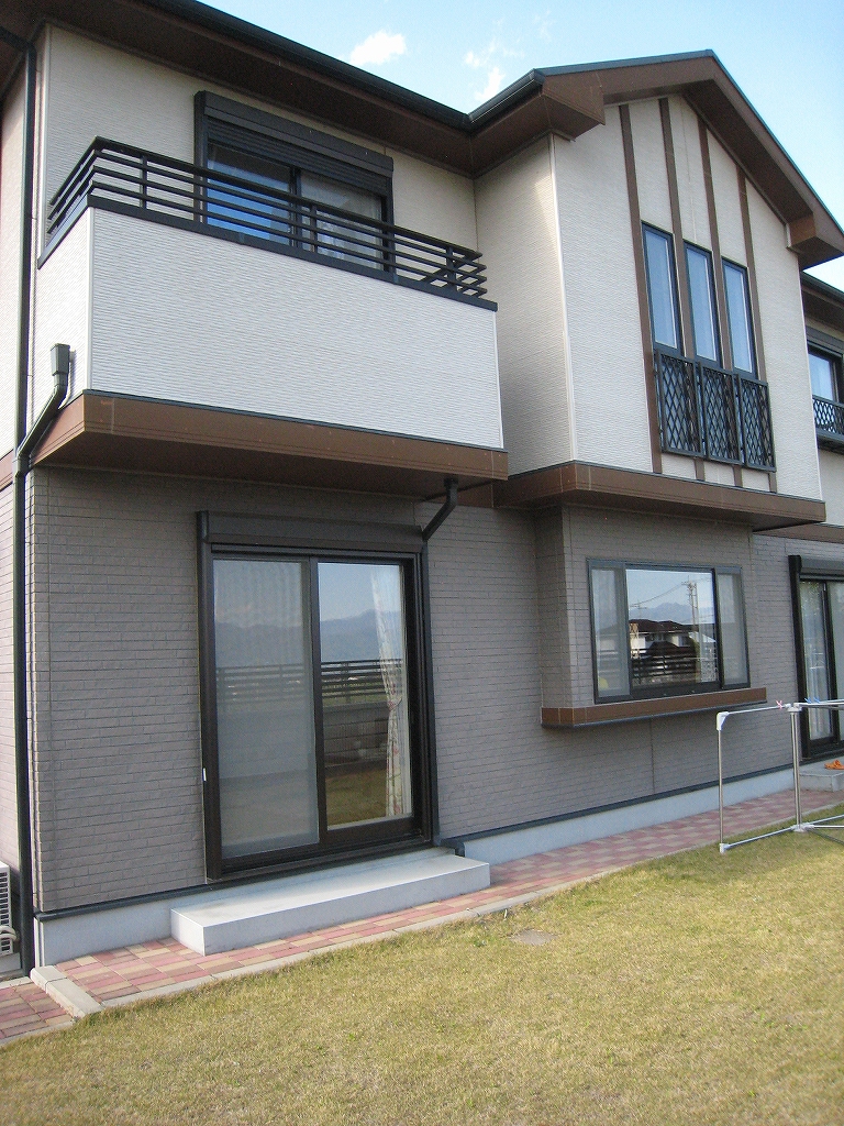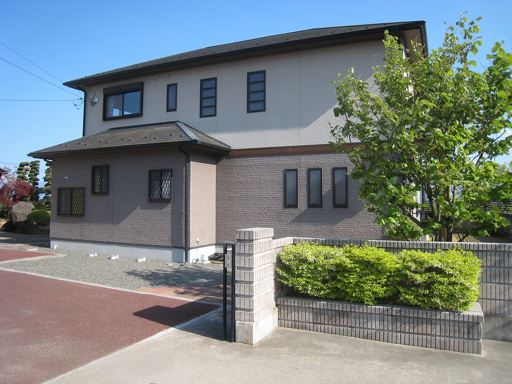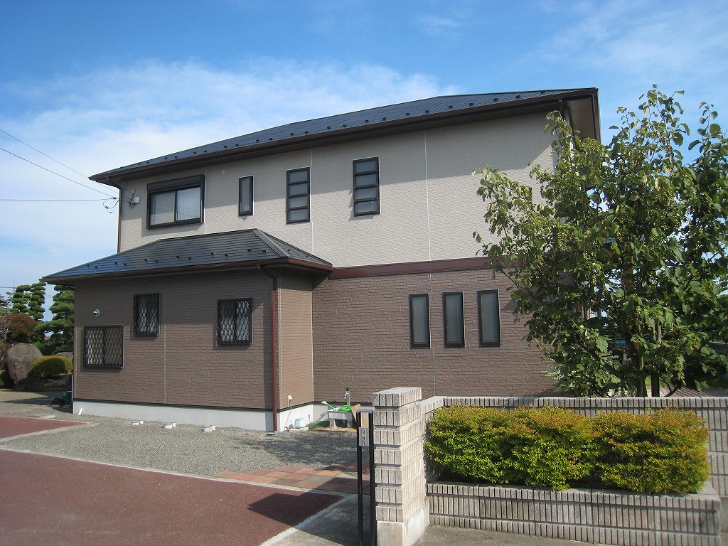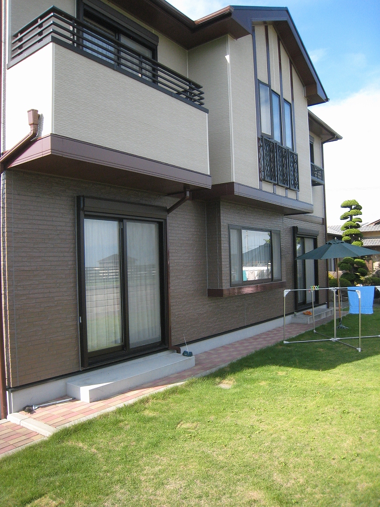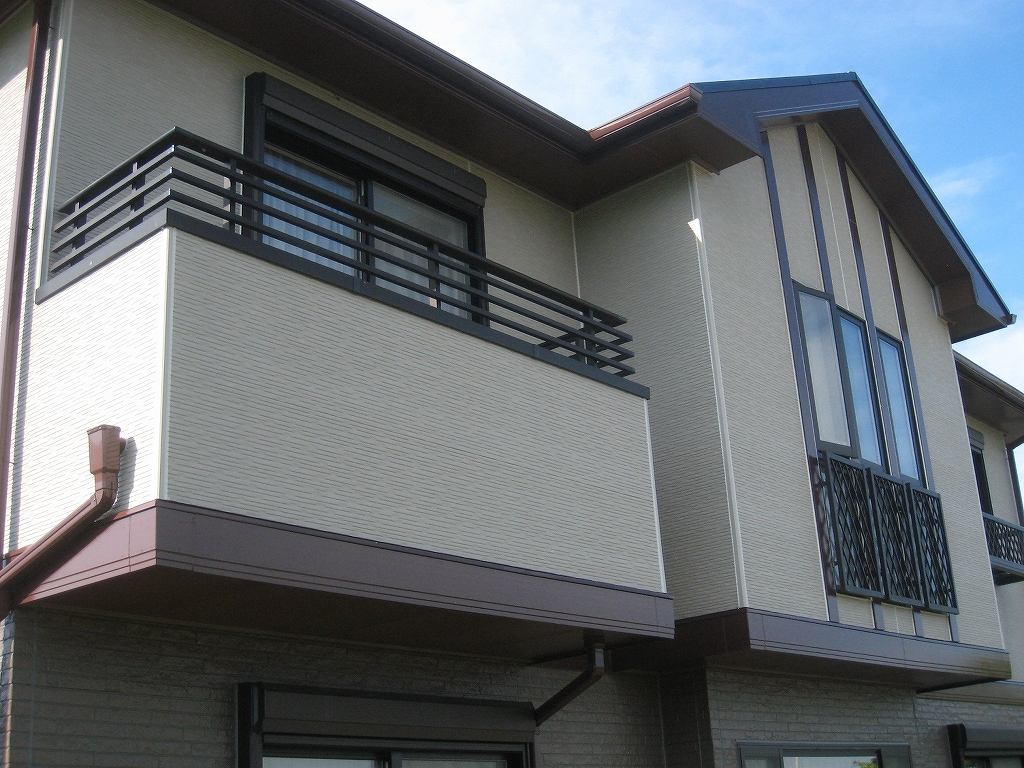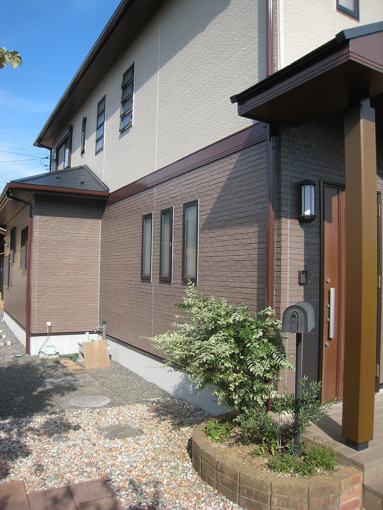 表面の劣化が目立ってきた外壁のタイル調サイディング。もともとのタイル色調や目地色を生かしたかったので、通常の塗料ではなく、シリコン樹脂のクリアー塗料を採用しました。 白っぽくなってきた外壁や屋根、樋や幕板などもすべてリニューアルし新築当時のお住まいに生まれかわりました。耐久性も高いため長期的なメンテナンスを含めたライフサイクルコストにも貢献し、経済性にもメリットを生み出します。