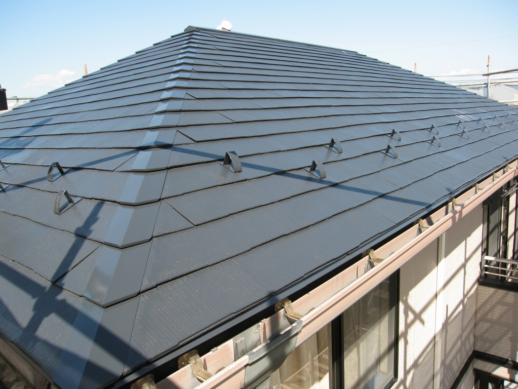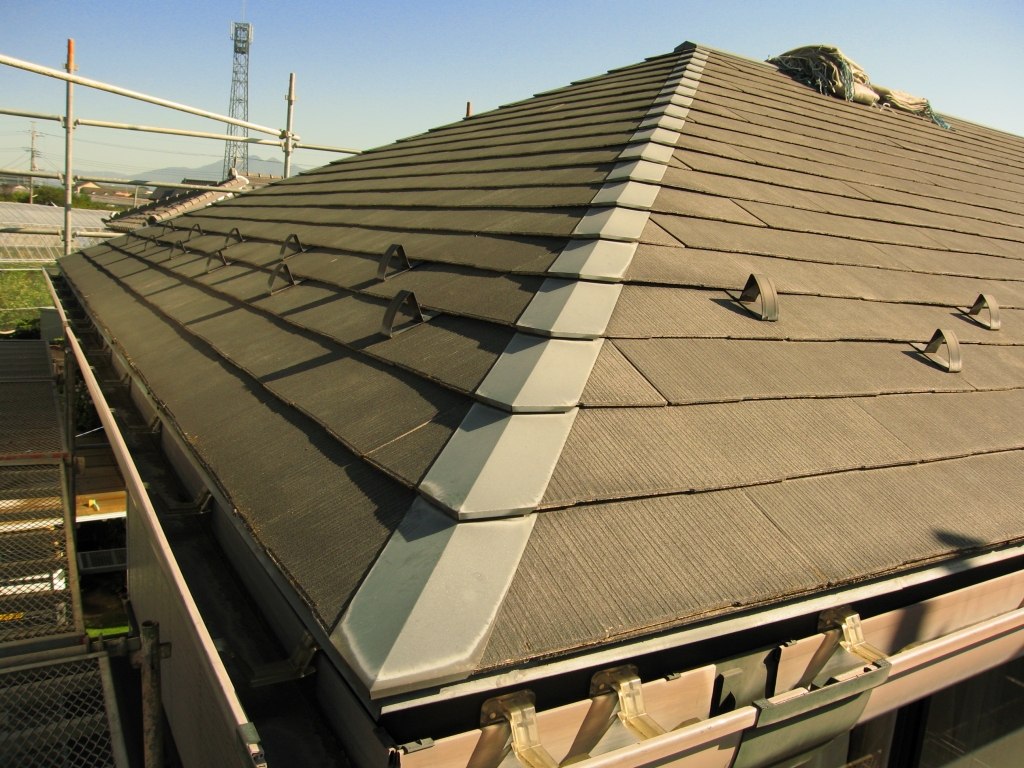 築10年が経過したお住まいの屋根。 色も褪せてきてたので塗り替えリフォーム。 基材に劣化の影響が出る前の経済スパンでのメンテナンスです。 足場を架けたついでに樋も塗り替えました。