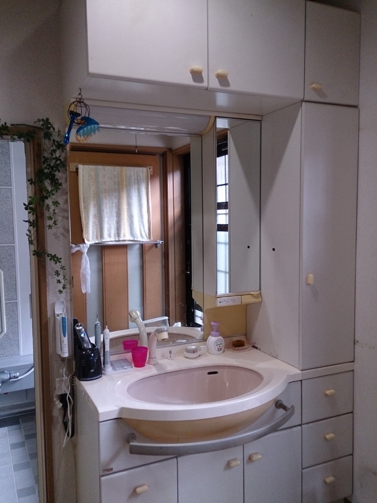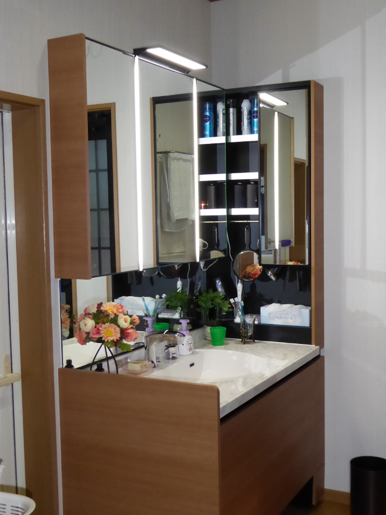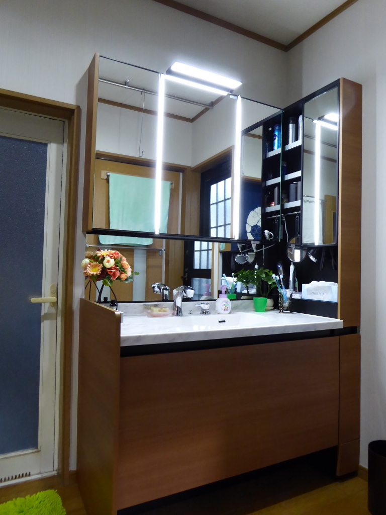 シンプルなラインと木目のデザインが日常に上質な時間をつくり出す洗面空間に。カウンターは大理石素材。縦ラインに光るLED照明はあご下や頬に影をつくりにくくします。三面鏡も使いやすさ・収納力共にアップ。機能性・デザイン性がリニューアルしただけでなく優雅な時間までもが感じられます。