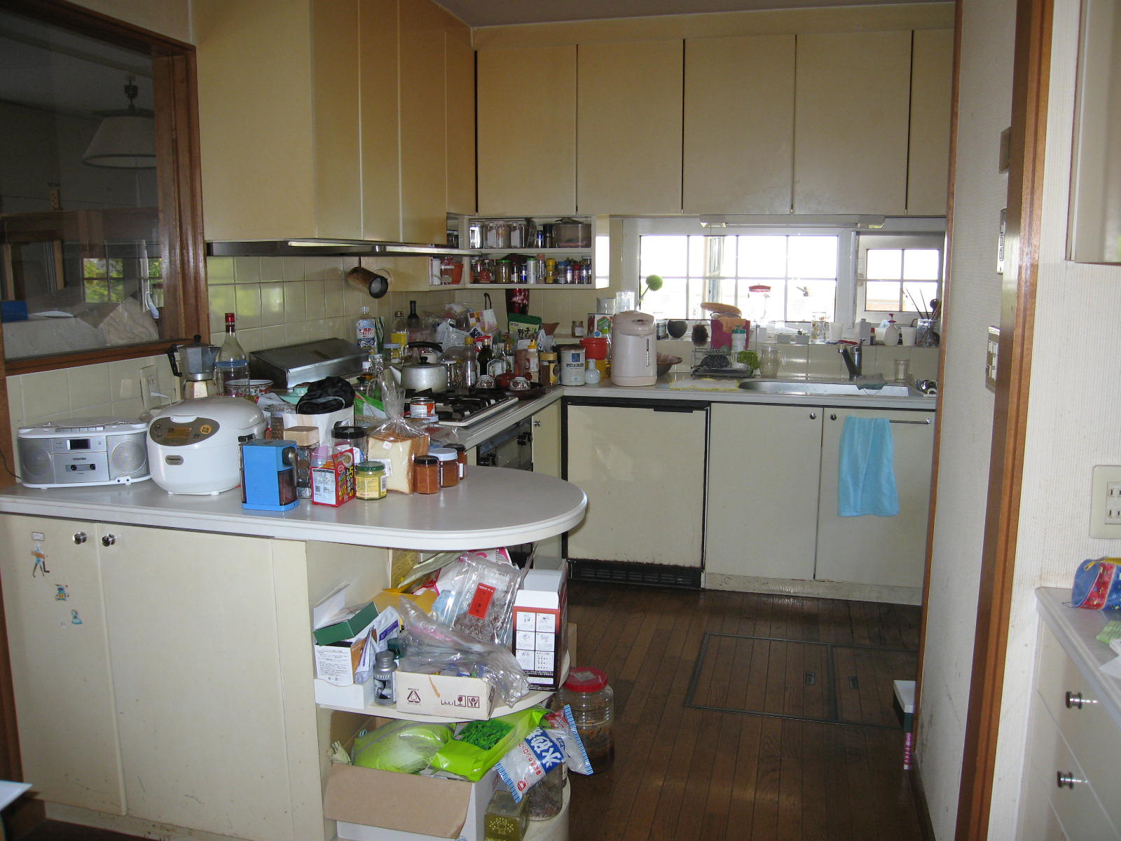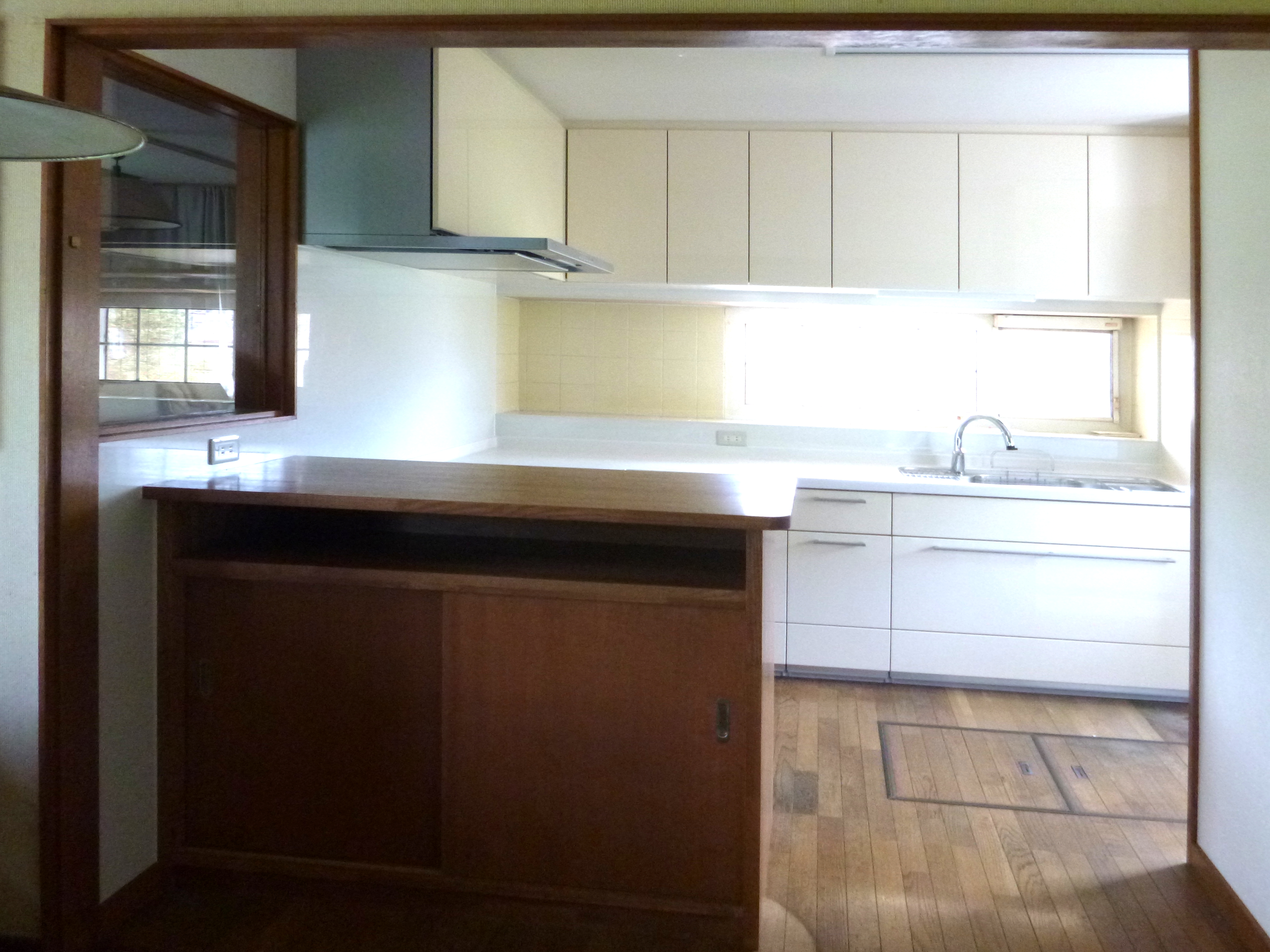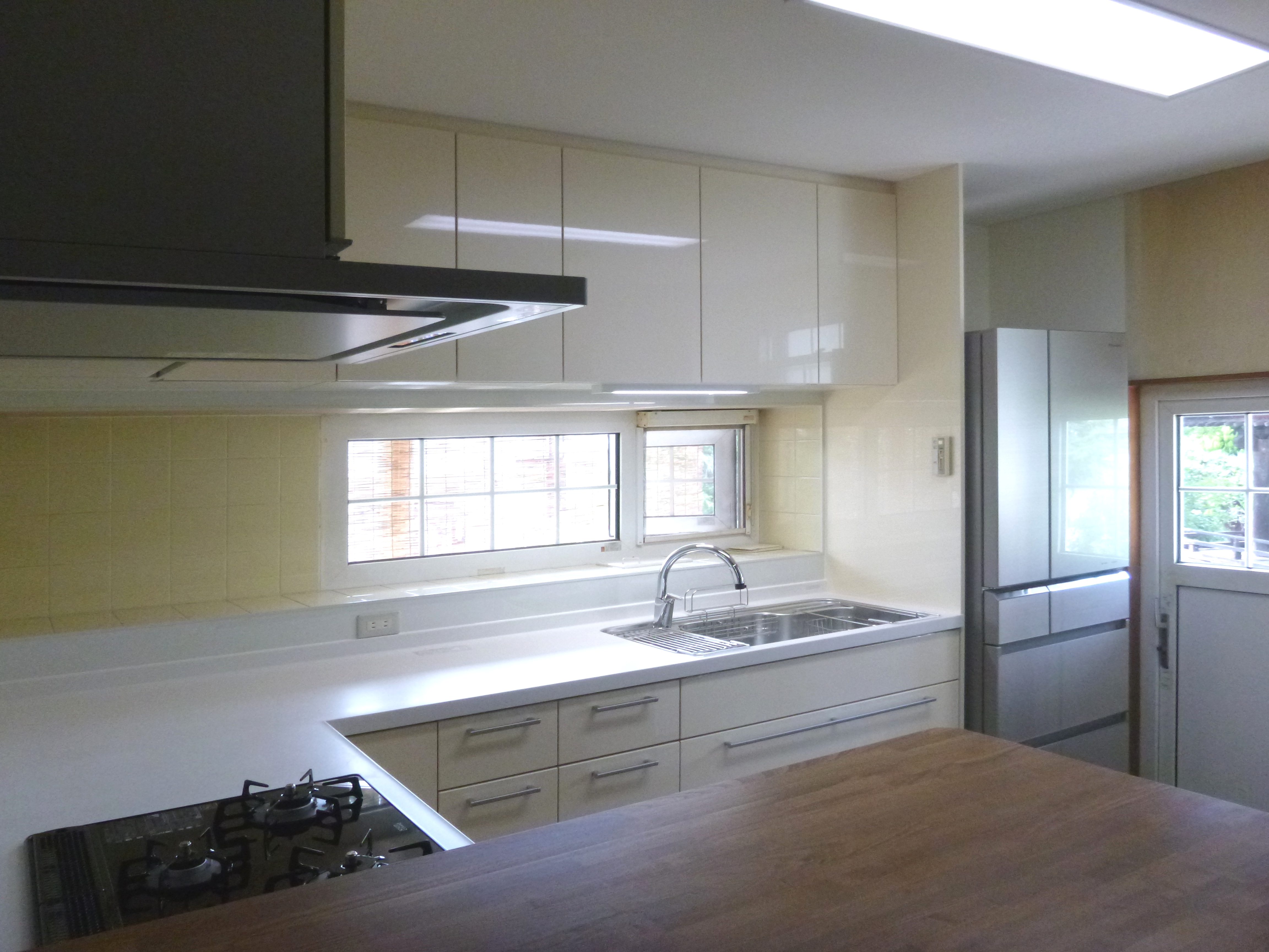 雪害の工事の際、そろそろキッチンもリフォームしたいとお話しをいただきました。 L型キッチンの交換の際、冷凍庫と冷蔵庫の2台を大型の冷蔵庫1台にし、その分収納量も増えとてもすっきりしました。 造作カウンターは、キッチン側はスパイスラック。リビング側からは新聞や雑誌は見やすい位置に収納でき、その他の物は引き戸内(可動棚付き)に収まるようになっています。 様々な物が使いやすくすっきりと収納できるうえ、見た目にも木の質感が既存のお部屋の雰囲気に馴染む素敵なキッチンになりました。