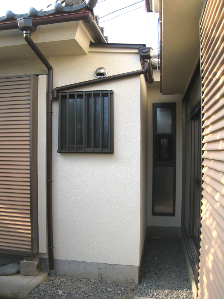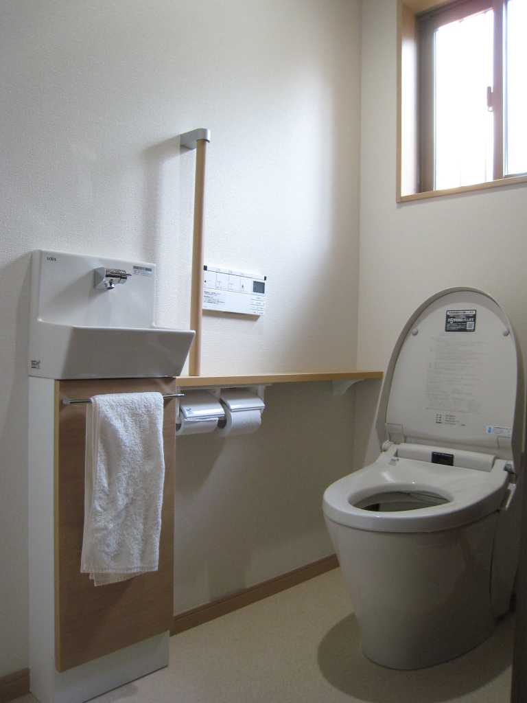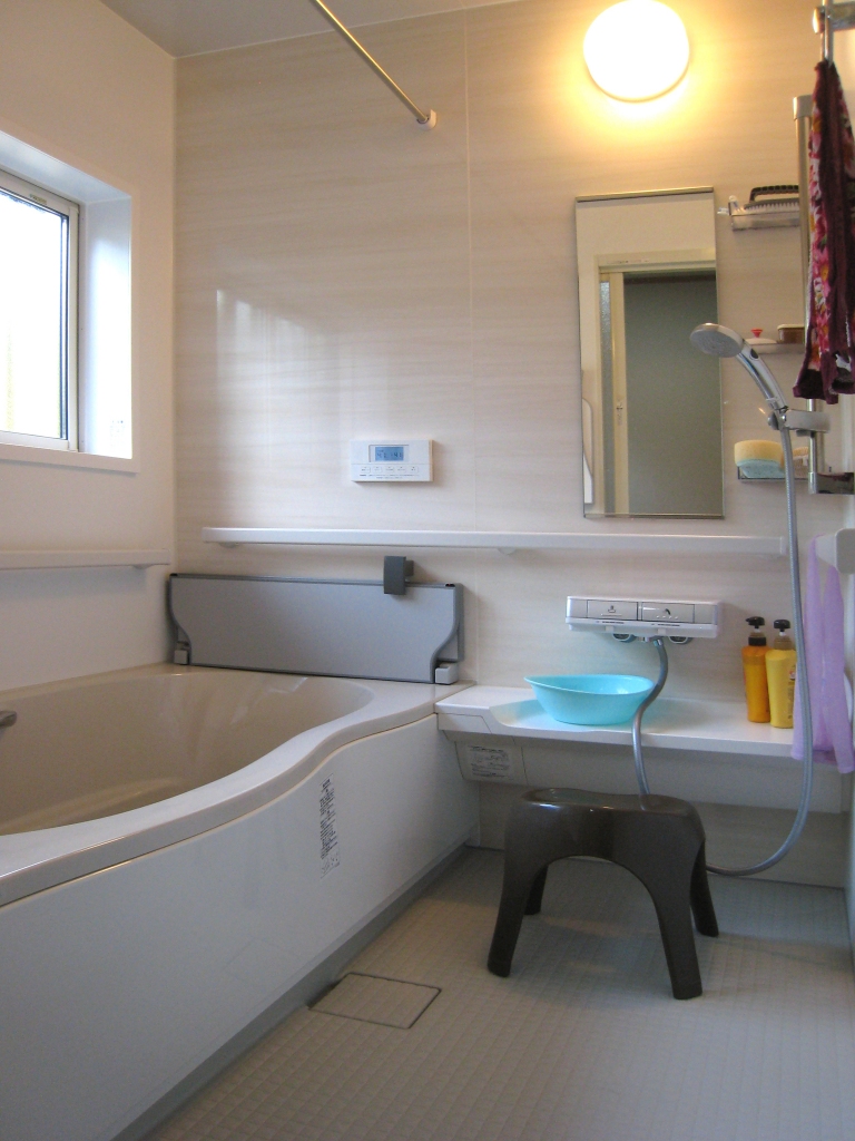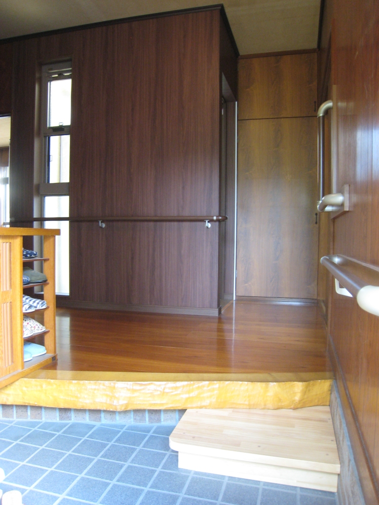 息子さんからご両親へお贈りしたバリアフリーリフォーム。浴室と洗面空間を広くし玄関ホールからも出入りできるように動線も改善。トイレはホール付近へ増築し、手洗いカウンター付の広々空間を実現。どの空間へも手摺を充実させ安心して日常を過ごせます。リビングや寝室などにも手摺や内窓を設置し省エネ効果も抜群です。