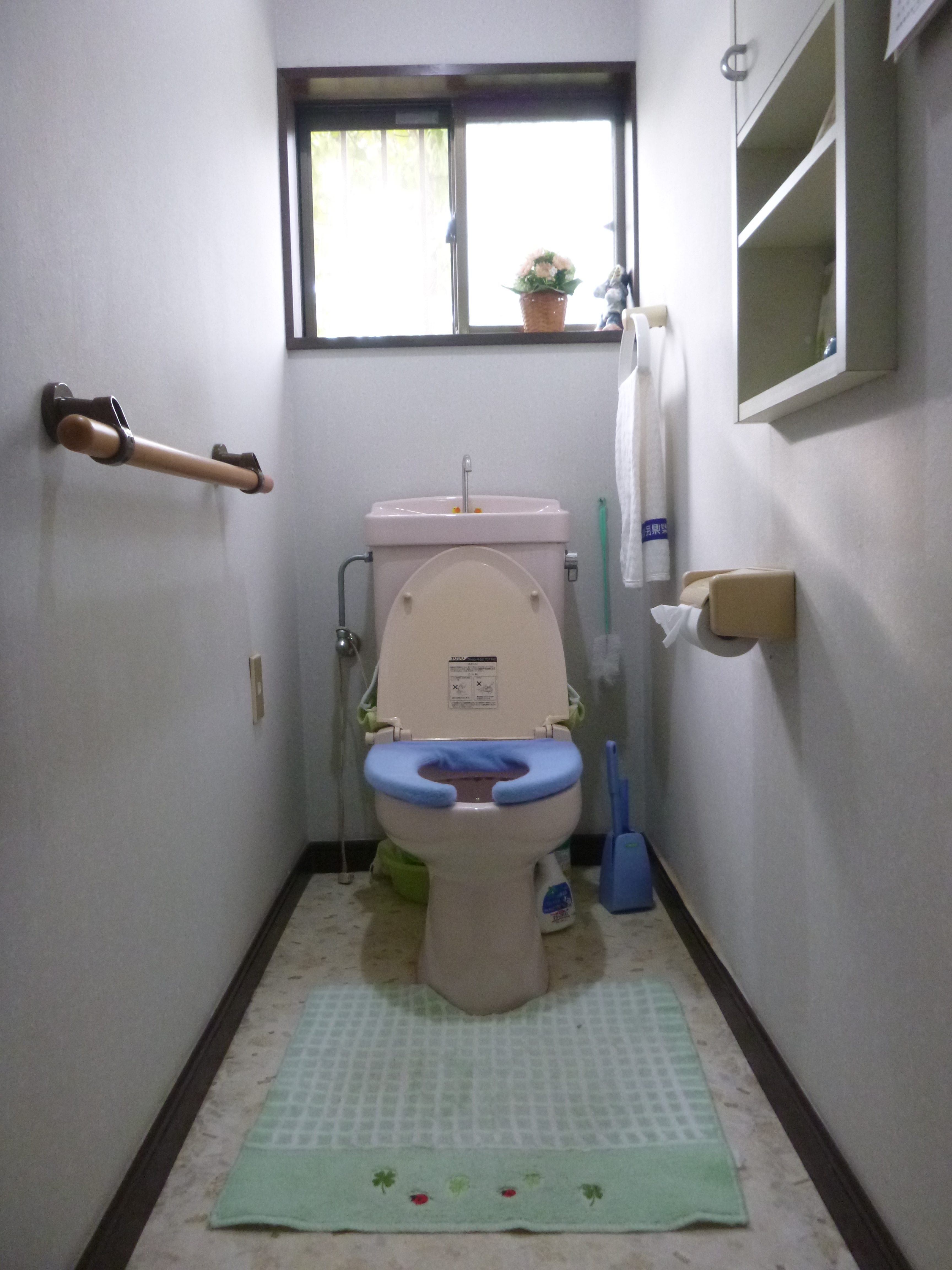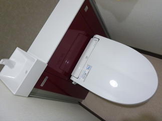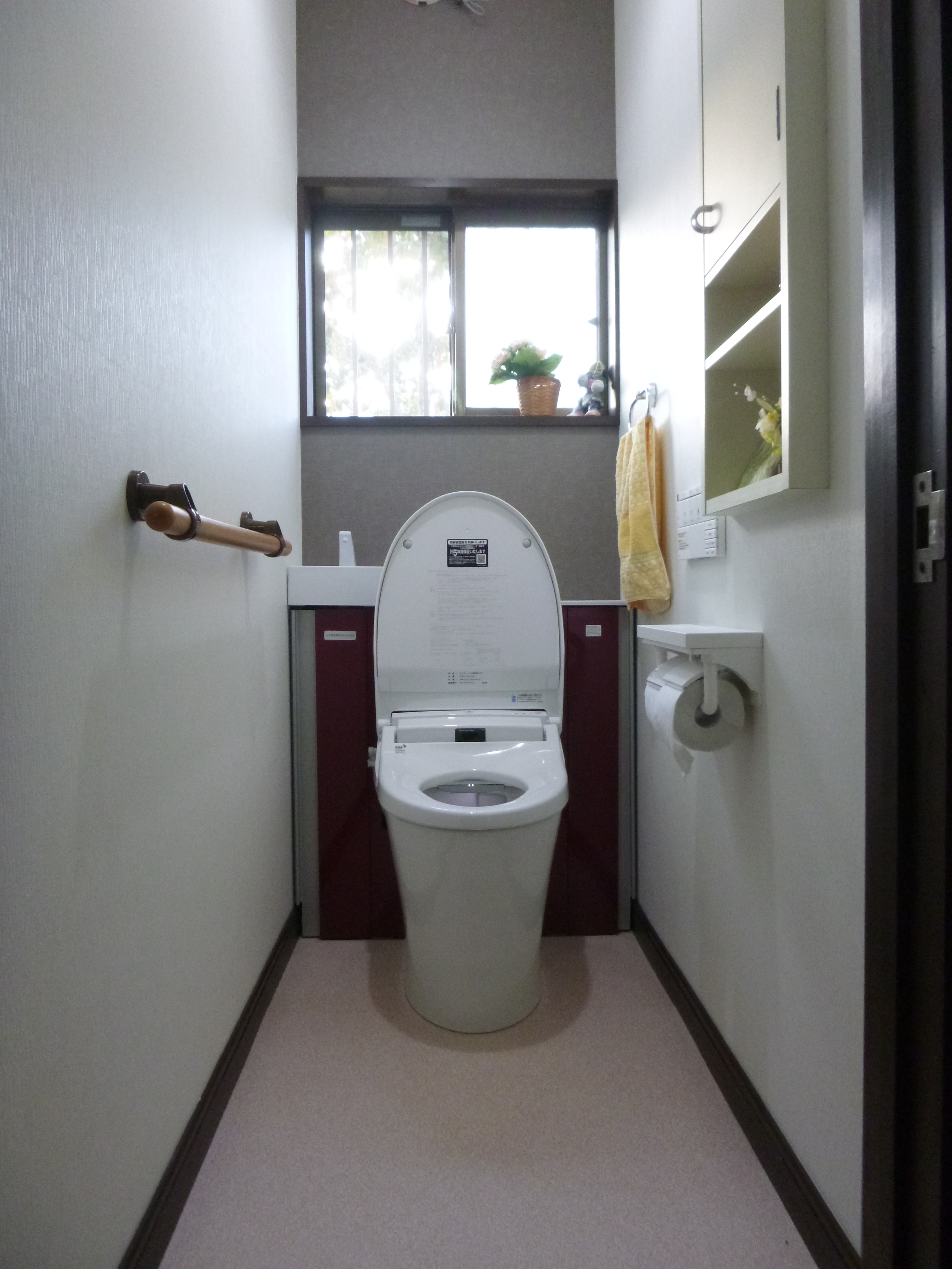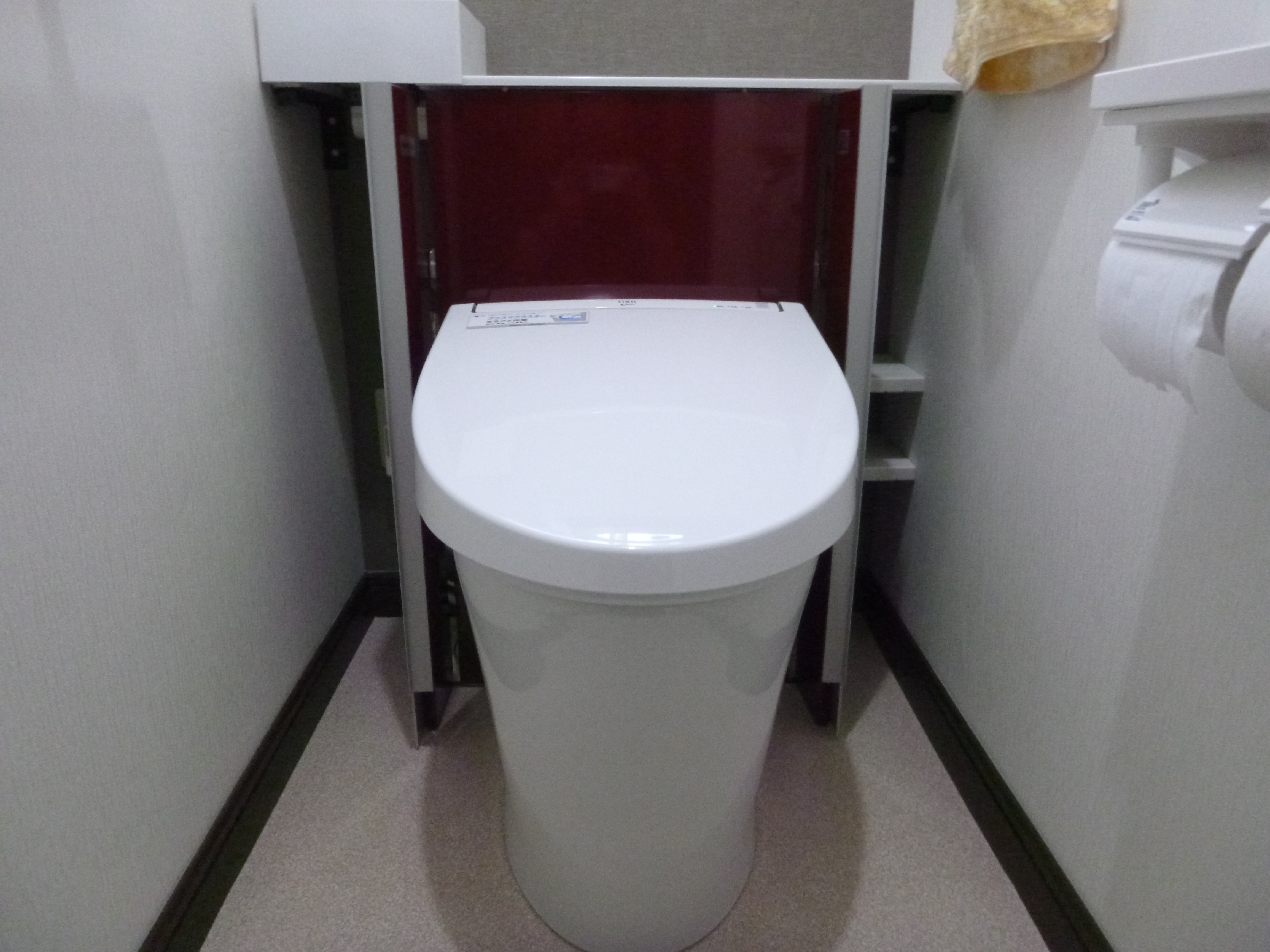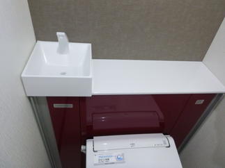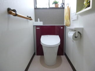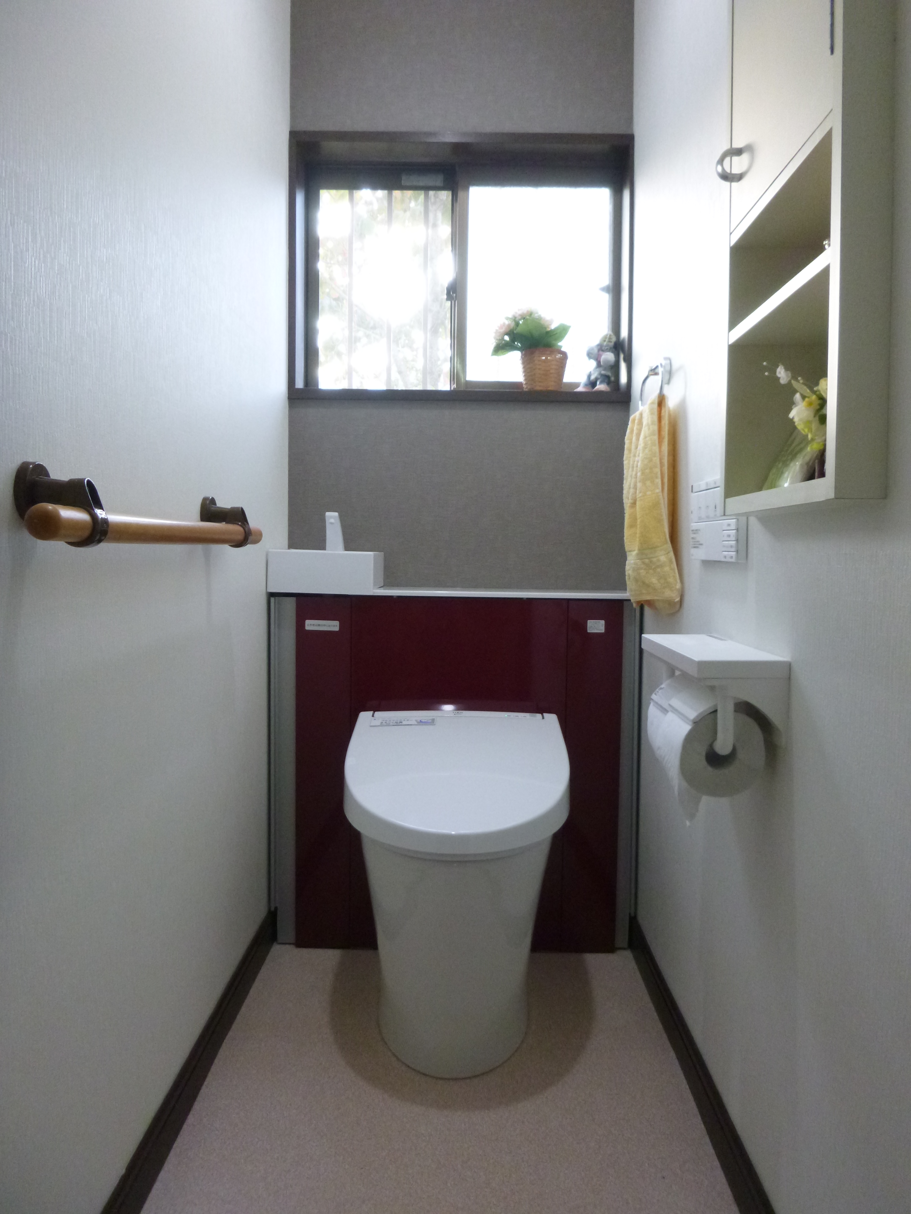 「リフォレ」はタンク部が収納キャビネットになっているので、すっきりと片付けられます。カームレッドの扉カラーと便器のホワイトがスタイリッシュ。床のCFとクロスも貼り替え、(正面のクロスには変化を付け)イメージアップしました。