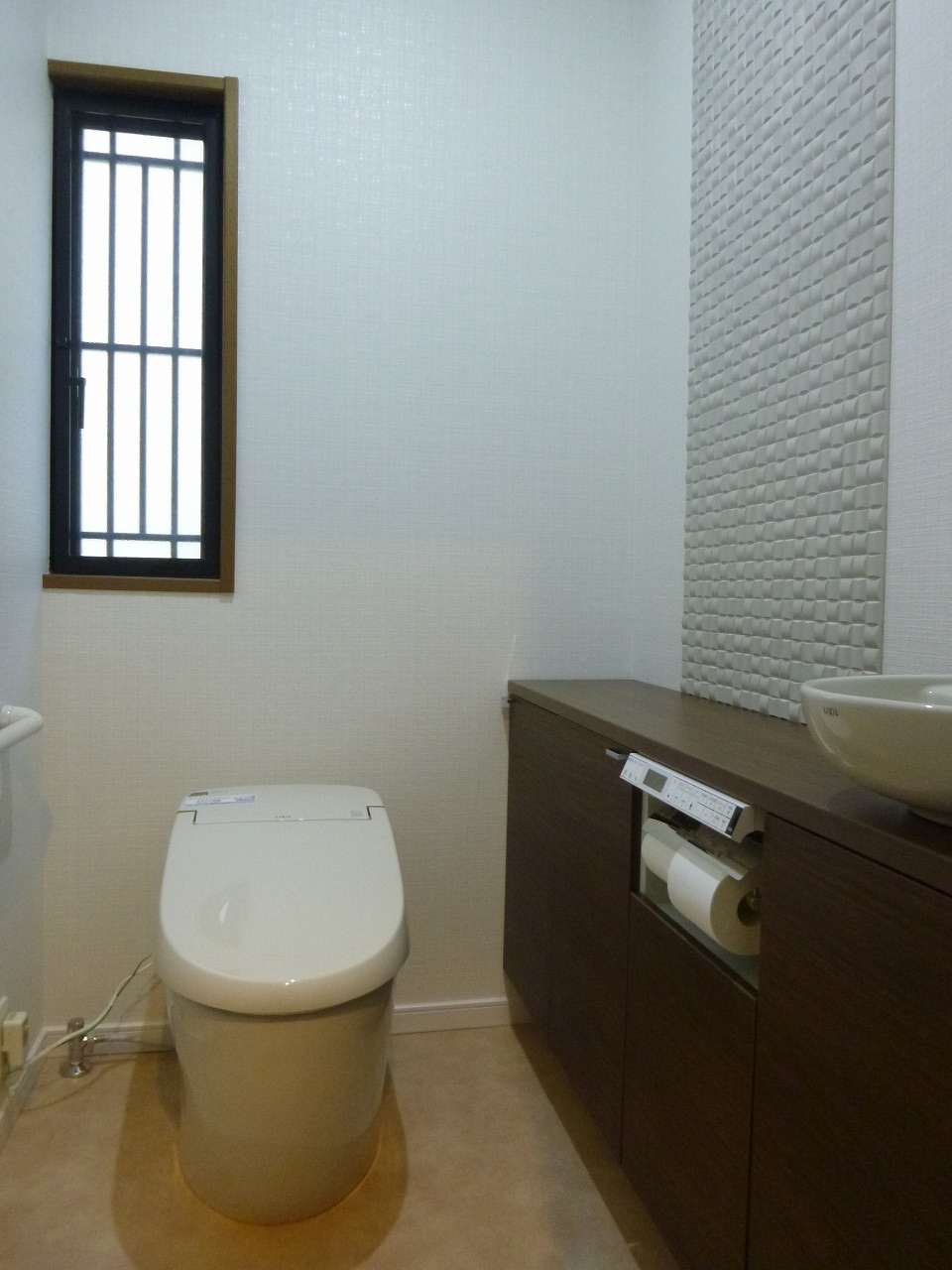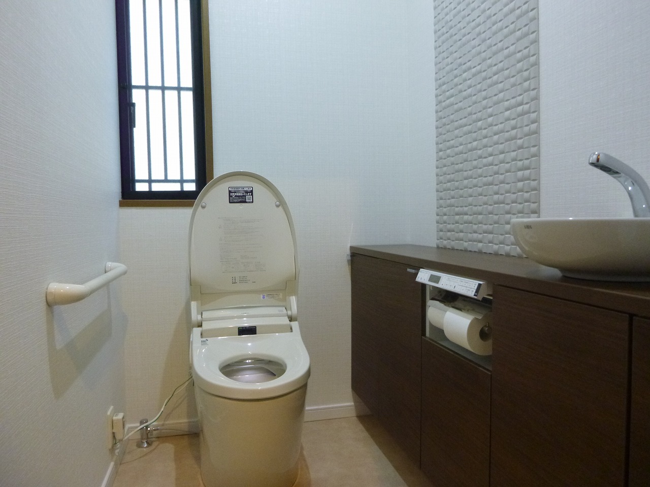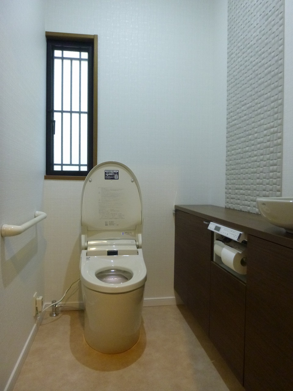 1Fトイレはリクシルの最新便器「サティスG」。キャパシアの手洗付収納にエコカラットをプラスしてリニューアル。